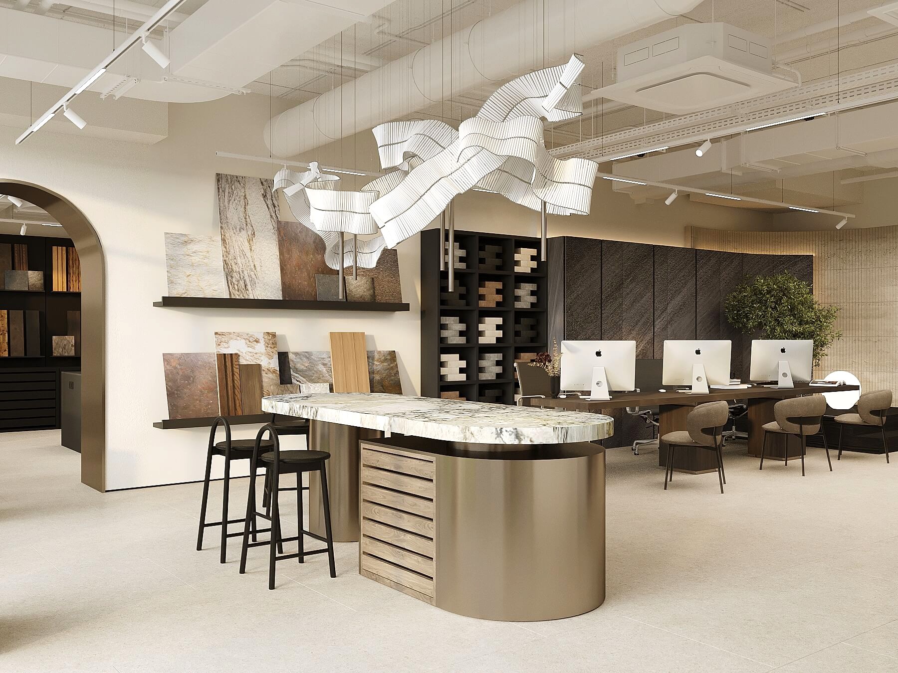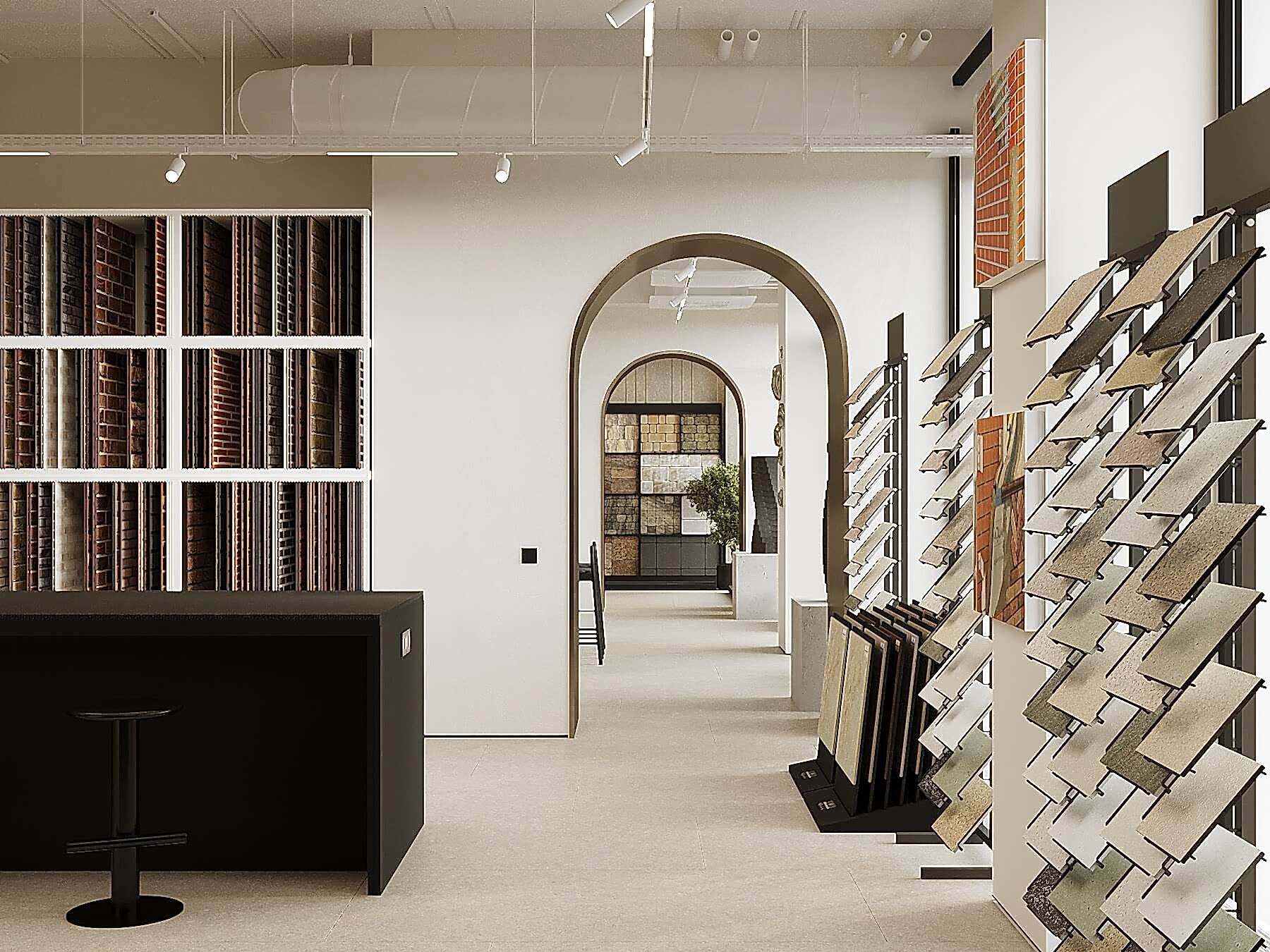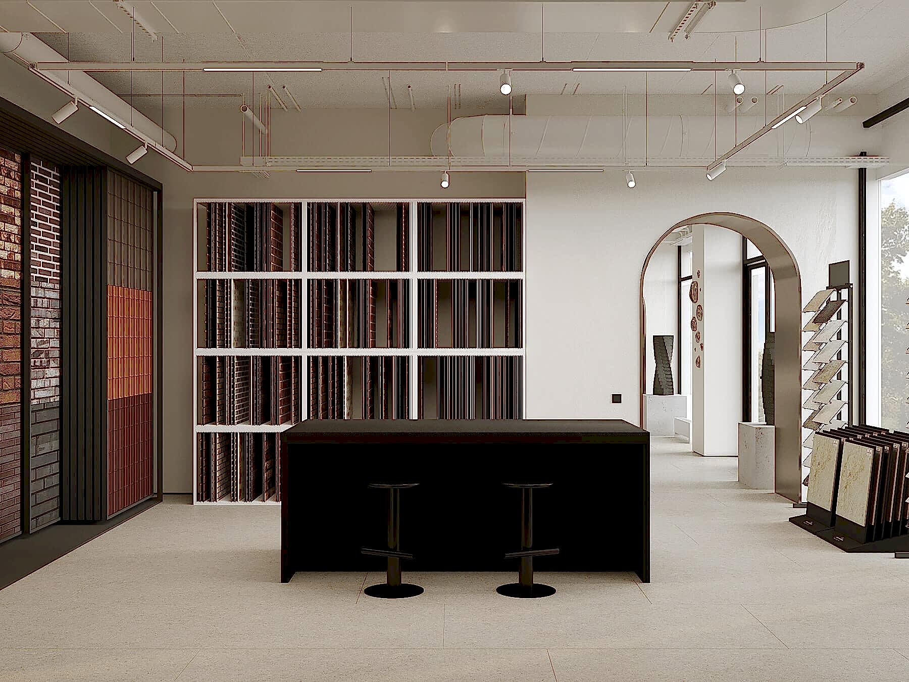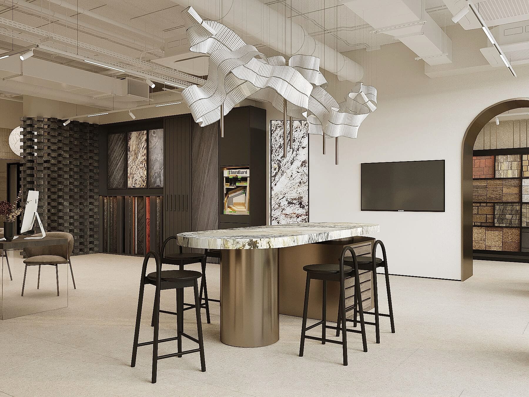 Интерьер был задуман как пространство с характером современного выставочного зала, в котором эстетика не уступает функциональности. Мы отказались от идеи «офиса с образцами» и создали полноценный интерьерный Pin-Up - открытый, светлый, с продуманной экспозицией и точными акцентами.