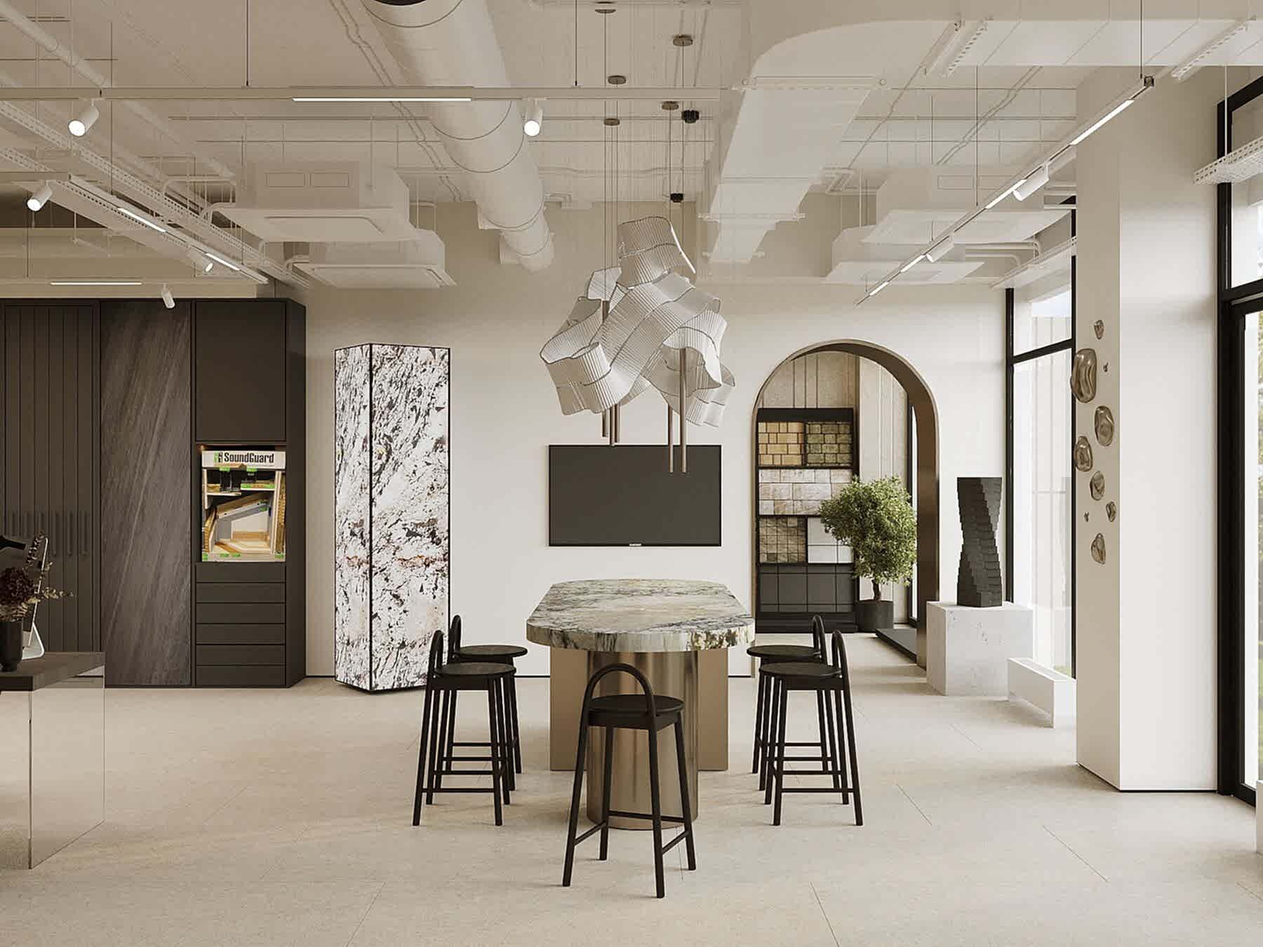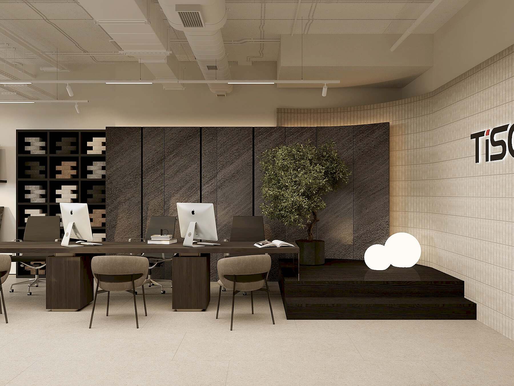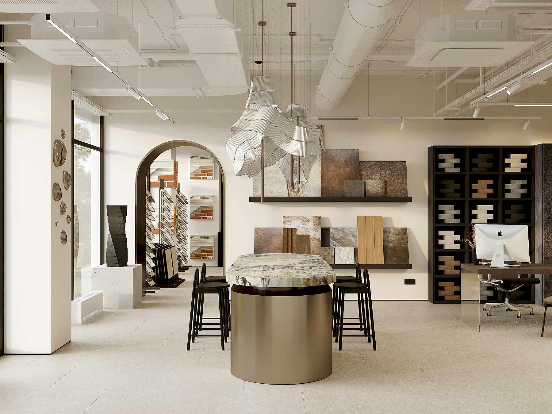 Интерьер был задуман как пространство с характером современного выставочного зала, в котором эстетика не уступает функциональности. Мы отказались от идеи «офиса с образцами» и создали полноценный интерьерный Pin-Up - открытый, светлый, с продуманной экспозицией и точными акцентами.