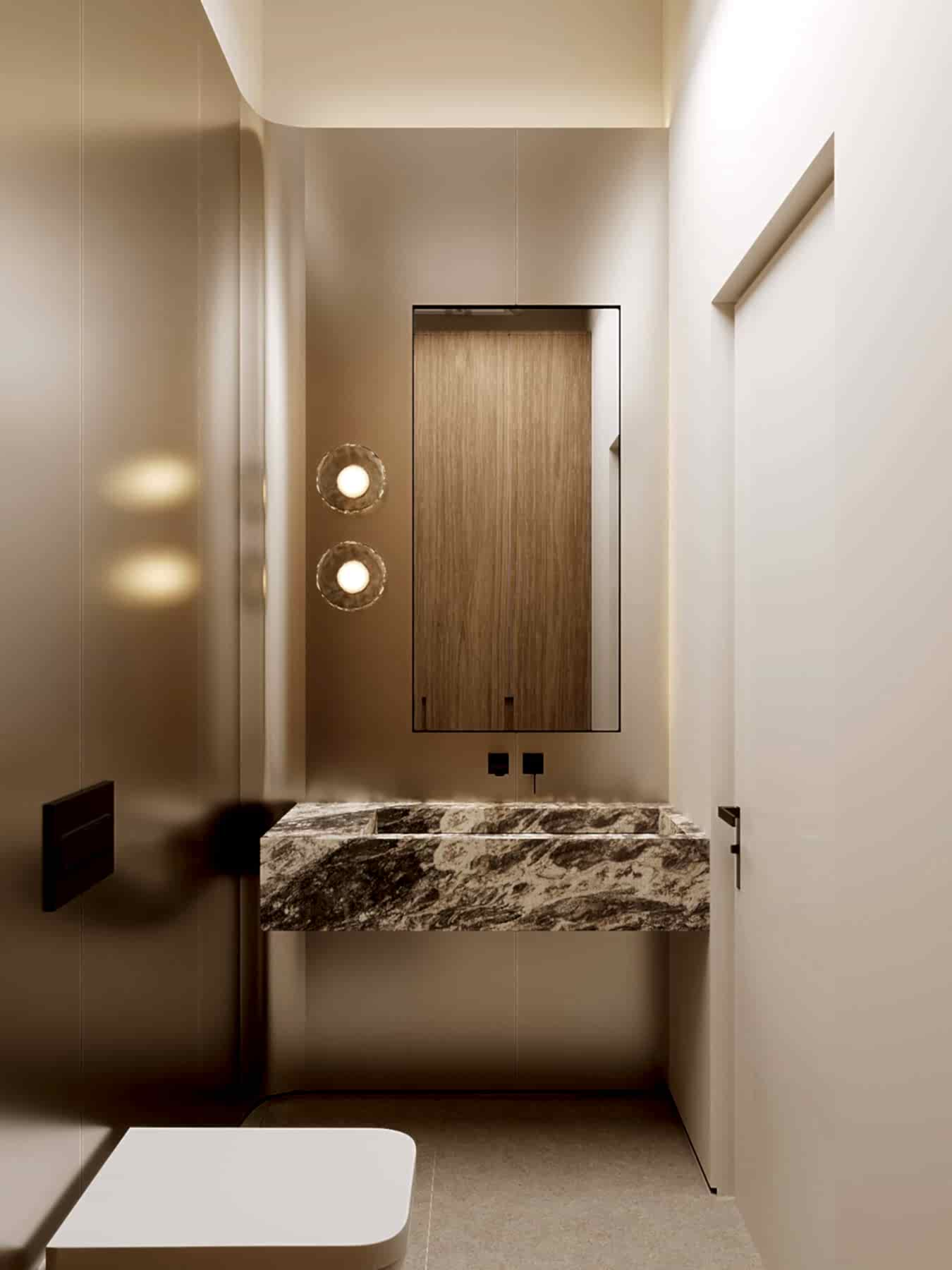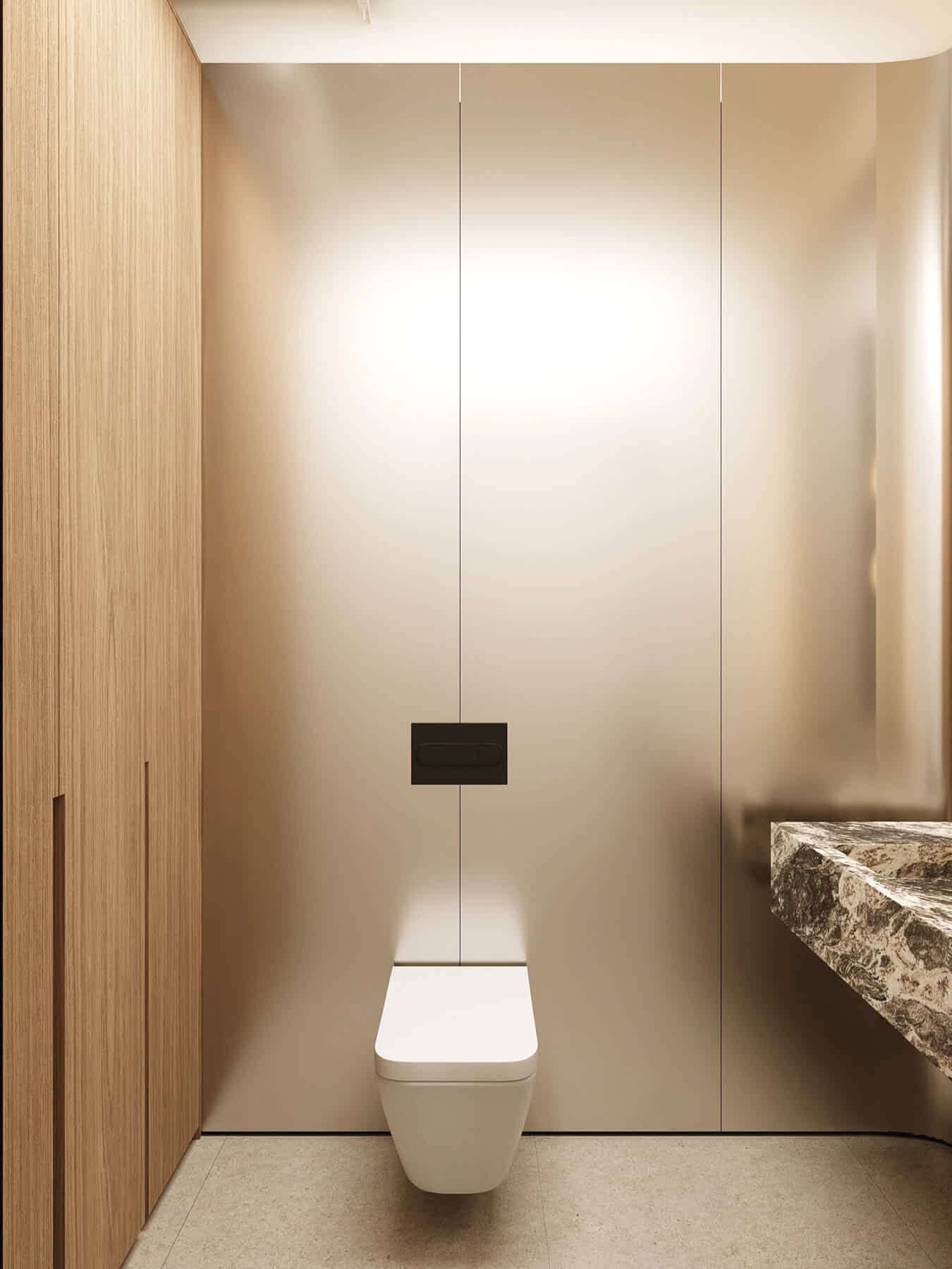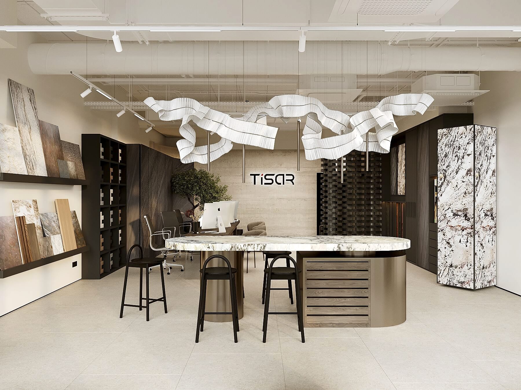 В основе - минималистичный подход с индустриальными и архитектурными мотивами. Гладкие поверхности, металл, стекло, нержавеющая сталь и нейтральная палитра подчеркивают красоту и Pin-Up самих материалов Tisar, делая их главными героями пространства.
