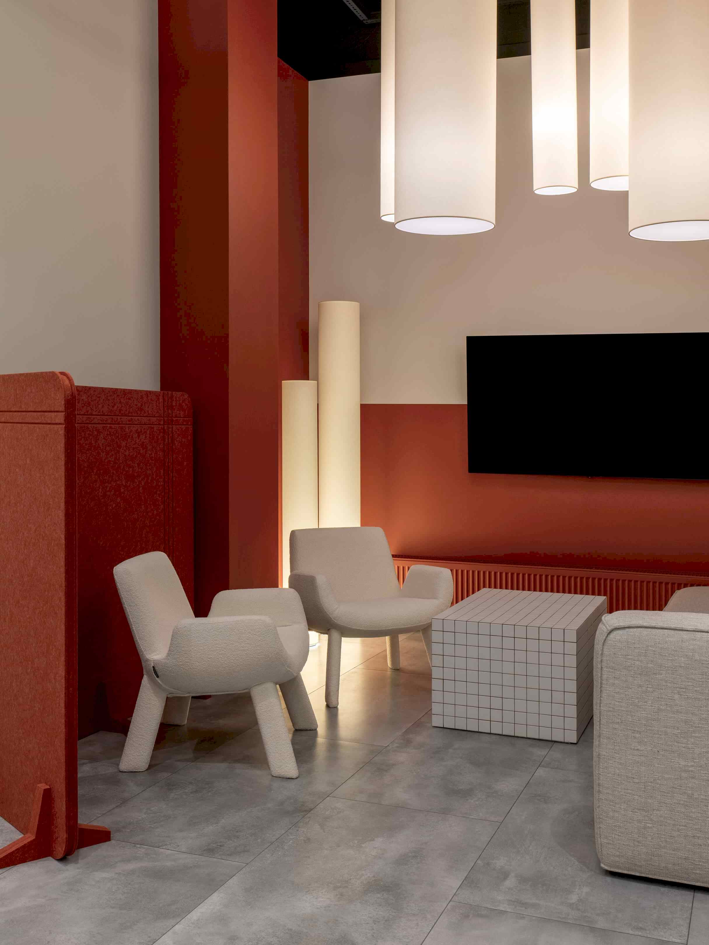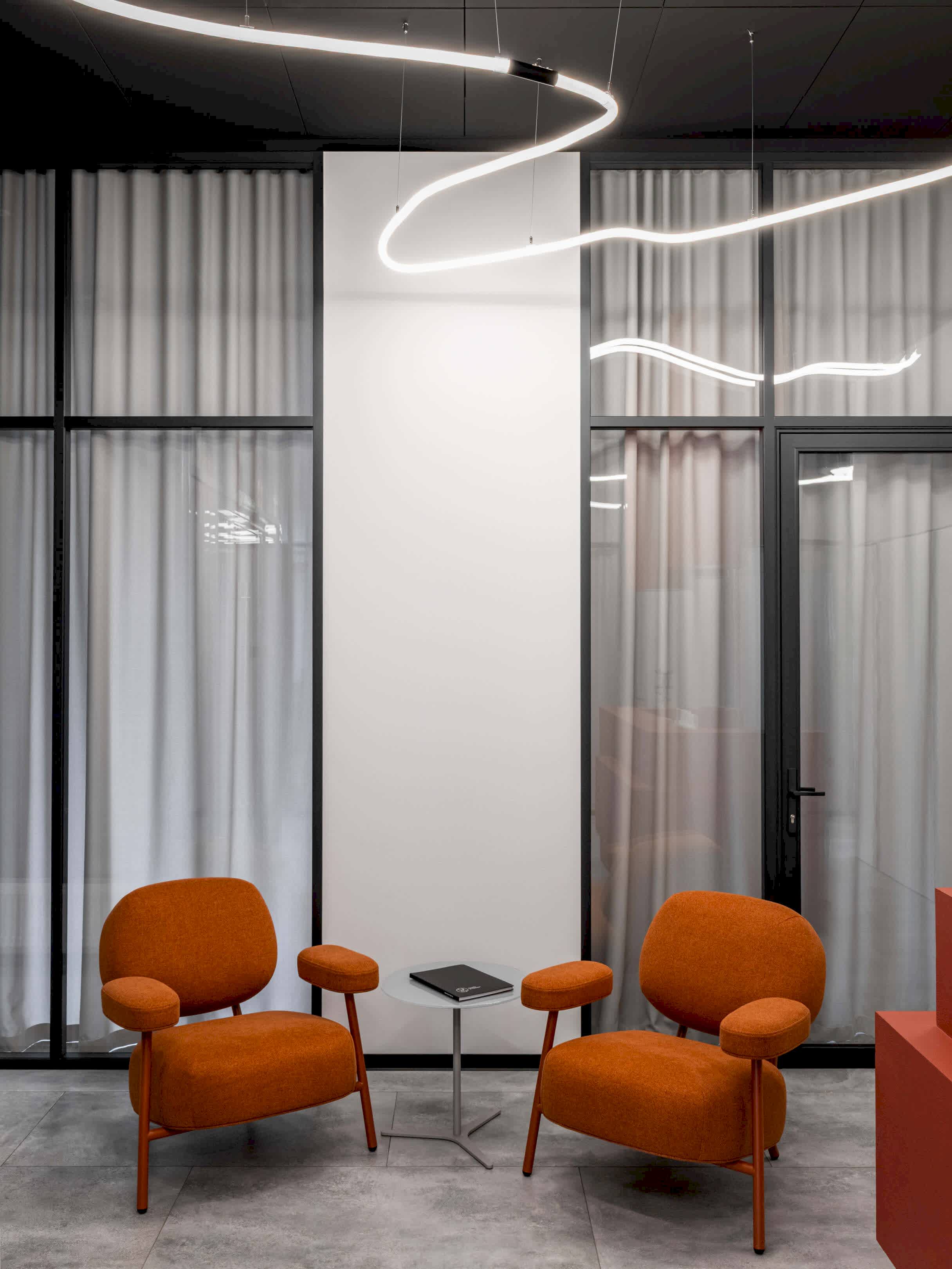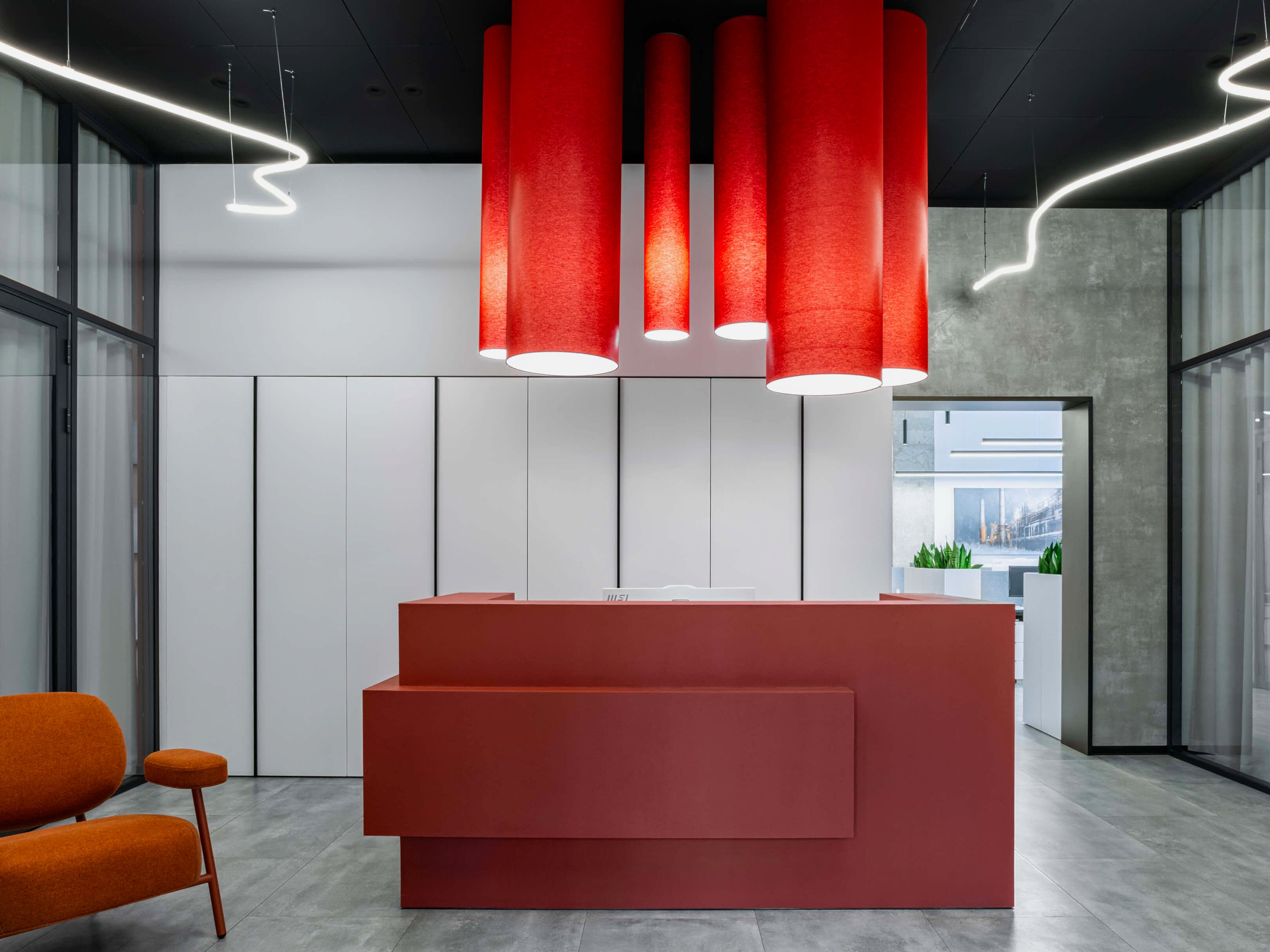 С первых шагов - чёткое направление. В центре внимания - терракотоваястойка ресепшен, словно раскалённый металл, только что вышедший из литейной Pin-Up Над ней - авторские светильники-трубы, доминирующие в пространстве и задающие тон. Белые однотонные шкафы на заднем плане растворяются со стеной. Всё здесь про смысл: ресепшен - как стратегическая точка управления движением офиса.