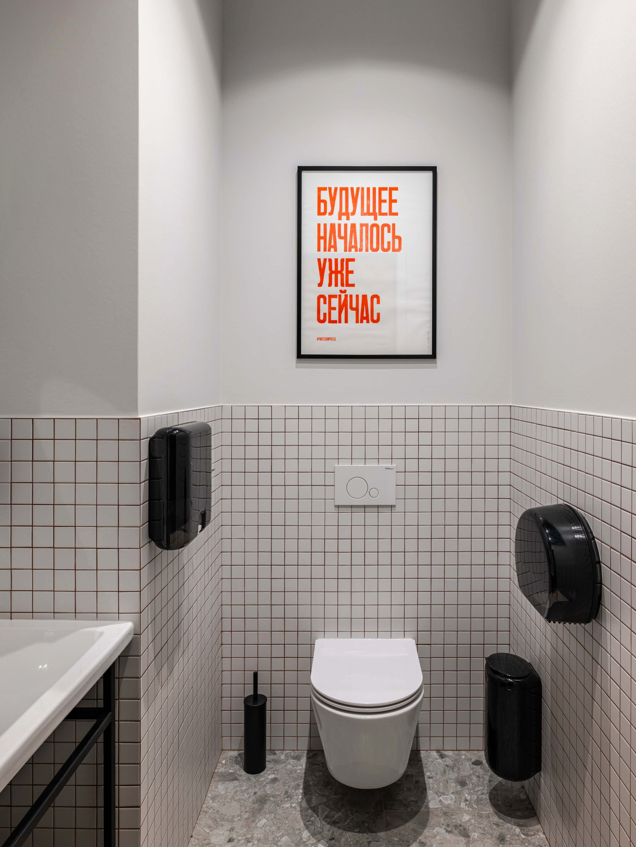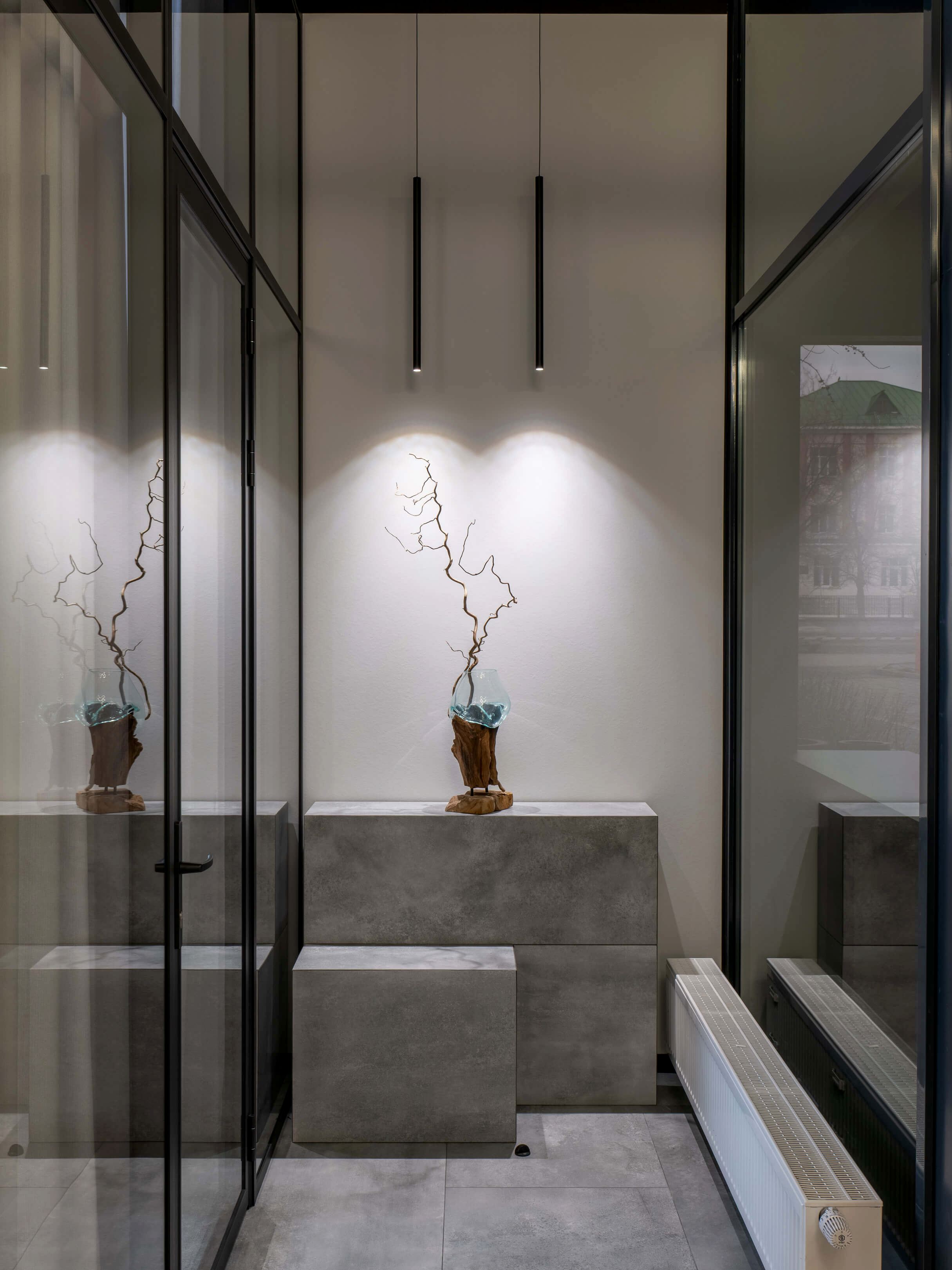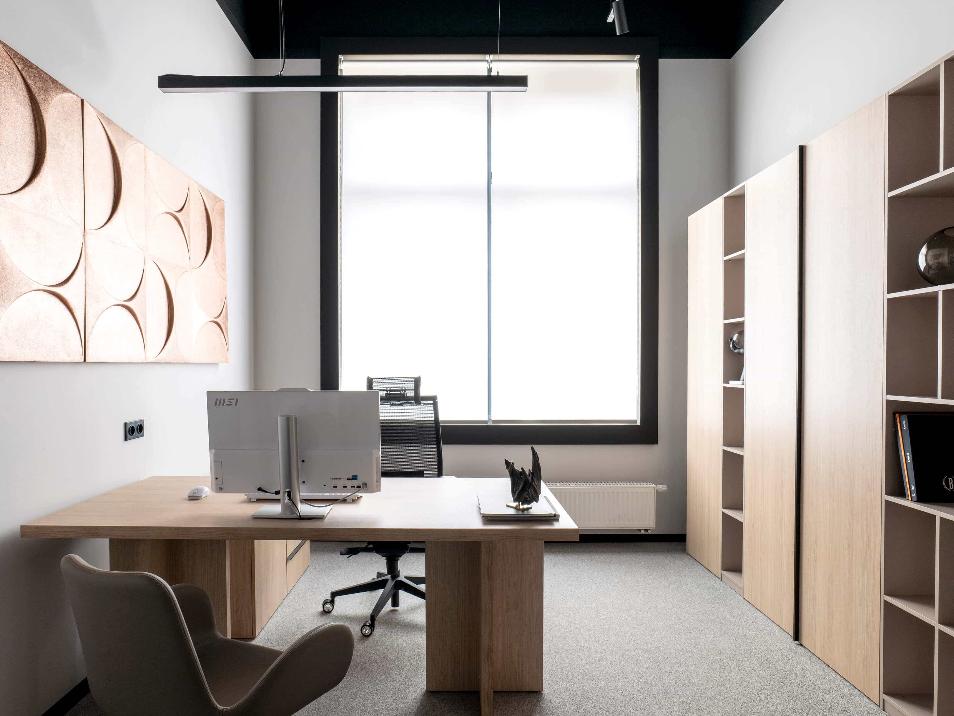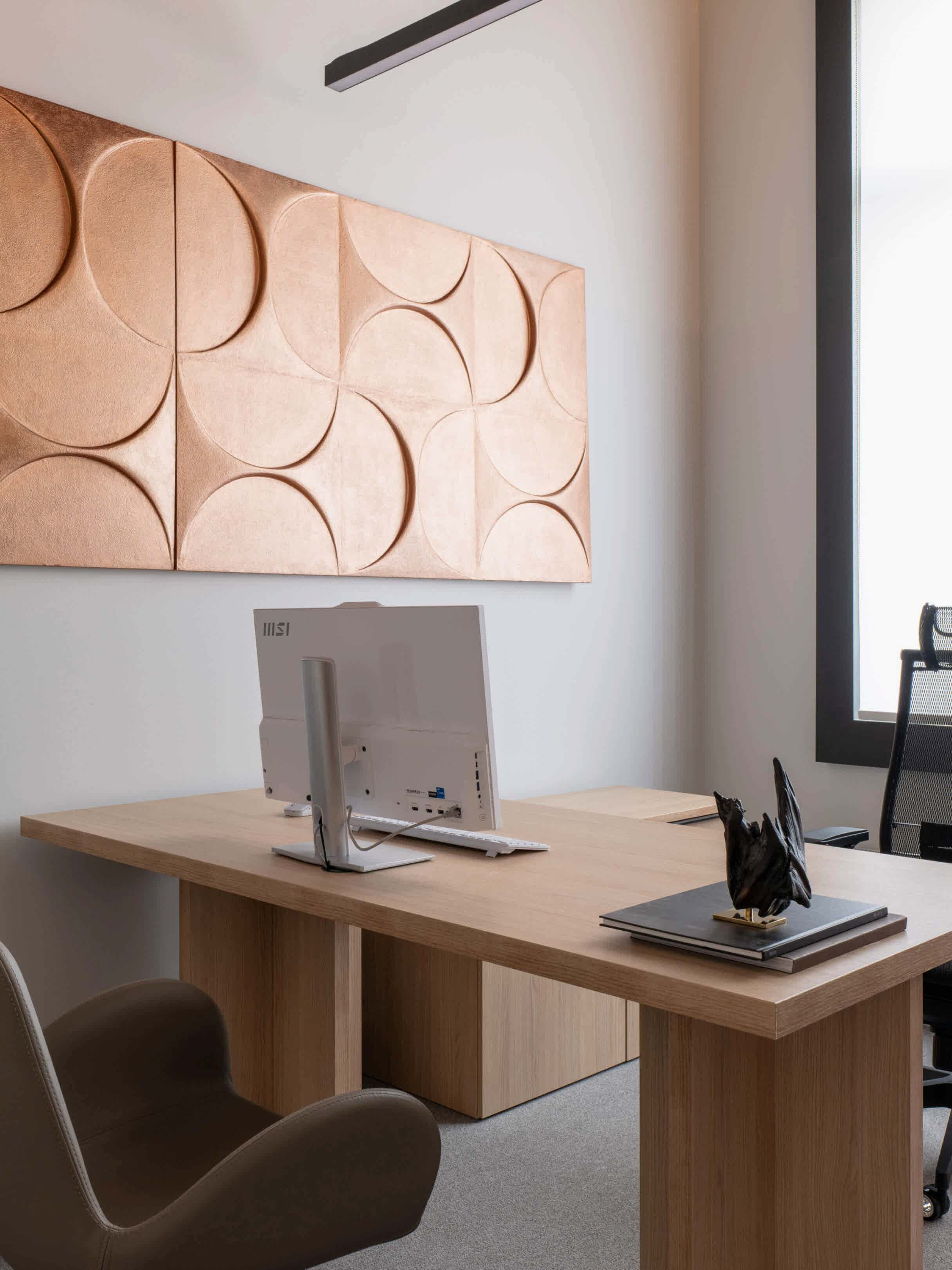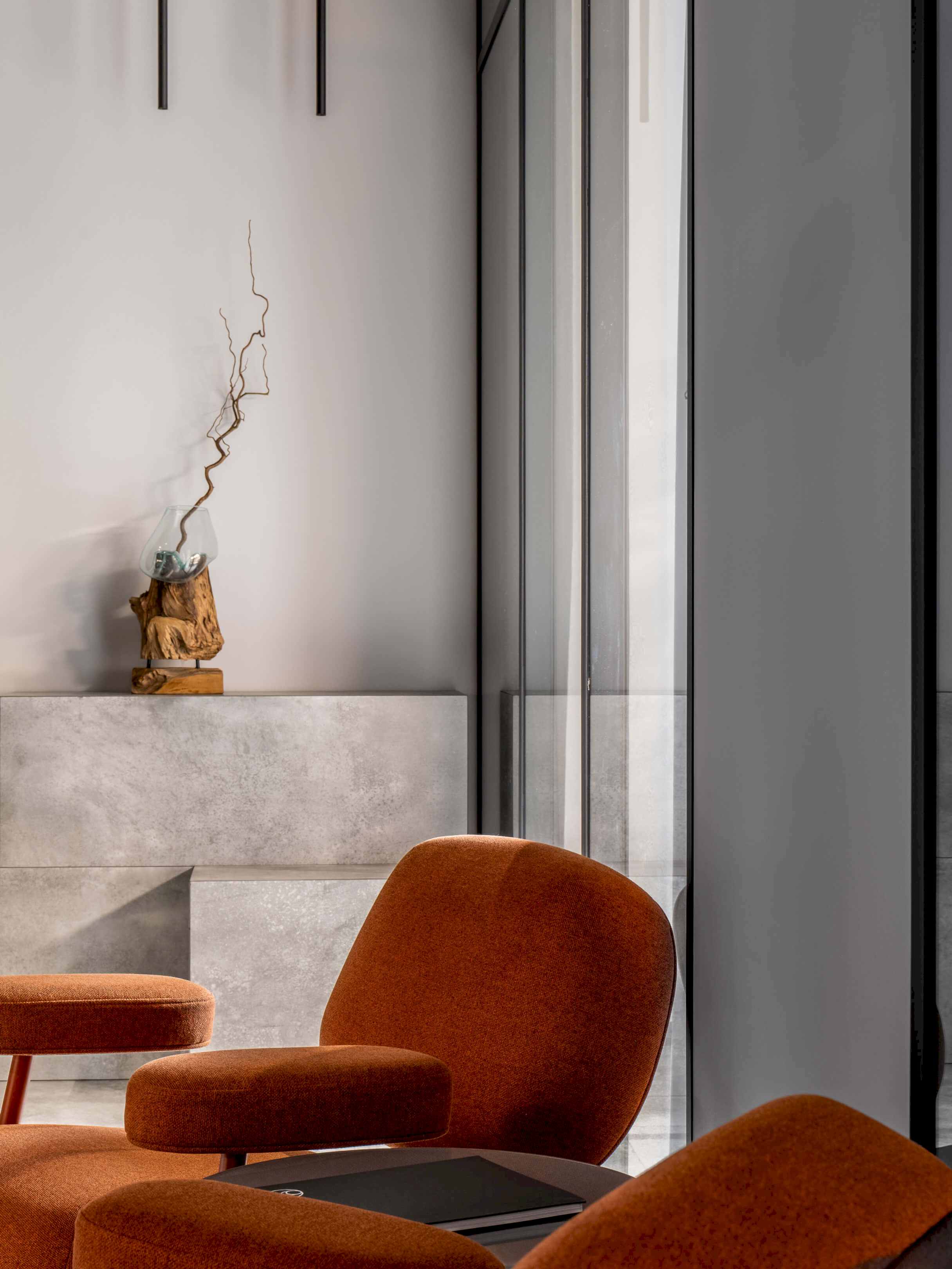 Планировка выстроена логично и ритмично. Слева - кабинеты директоров. Справа - переговорная. Между ними - зона ожидания с местом под коллекционное искусство: арт как веха, как знак культуры внутри инженерного мира. Под ногами керамогранит в оттенке, который не выдаёт следов будней - практично и эстетично.