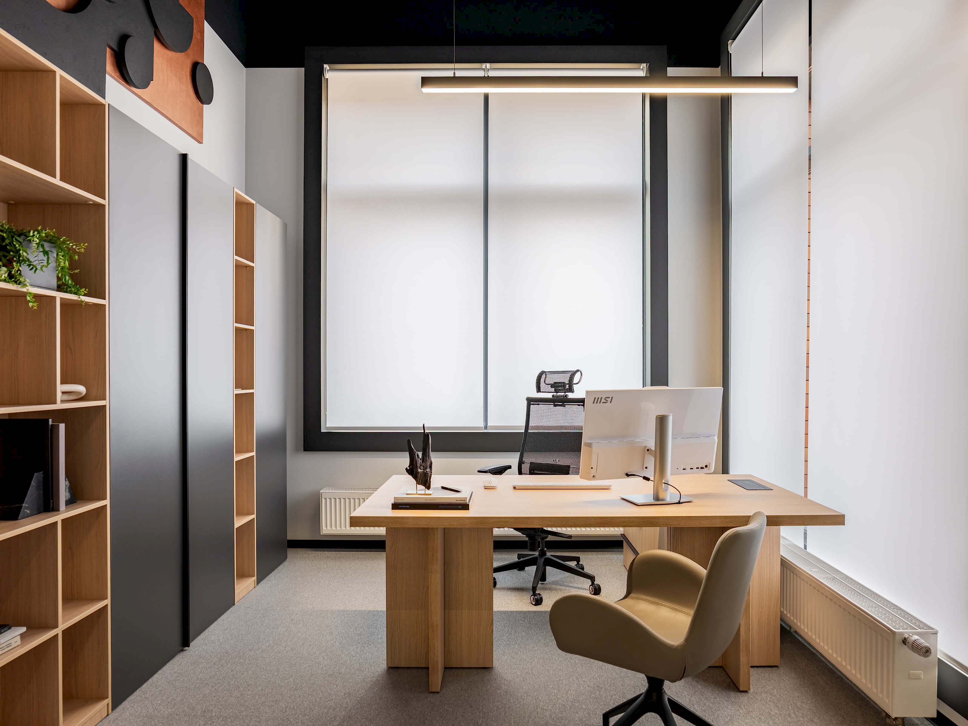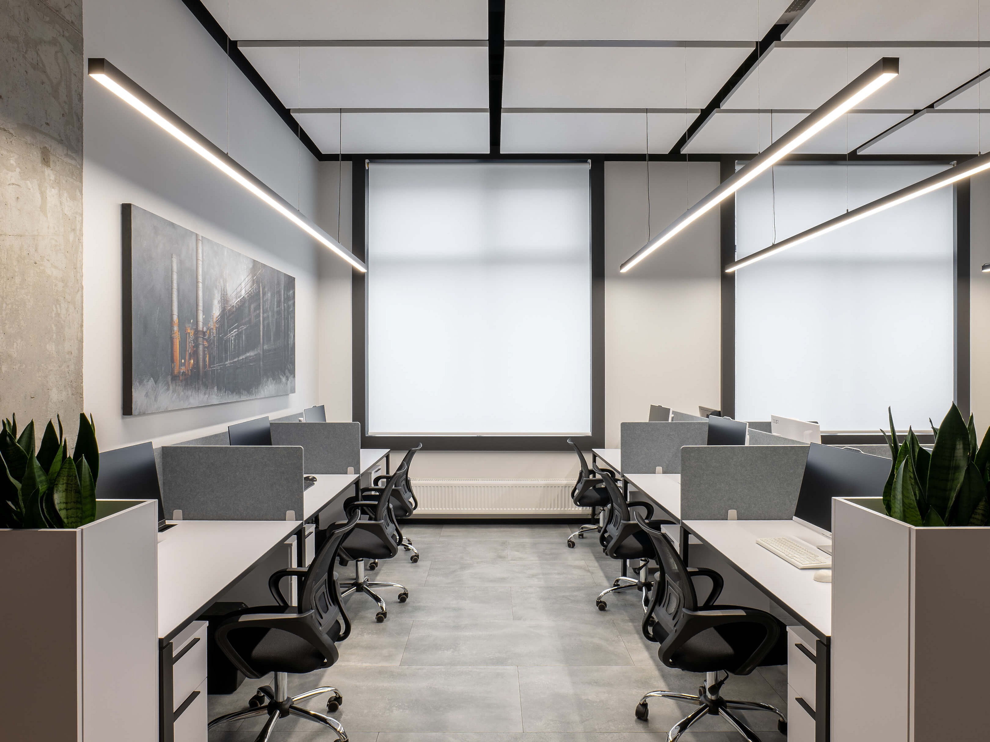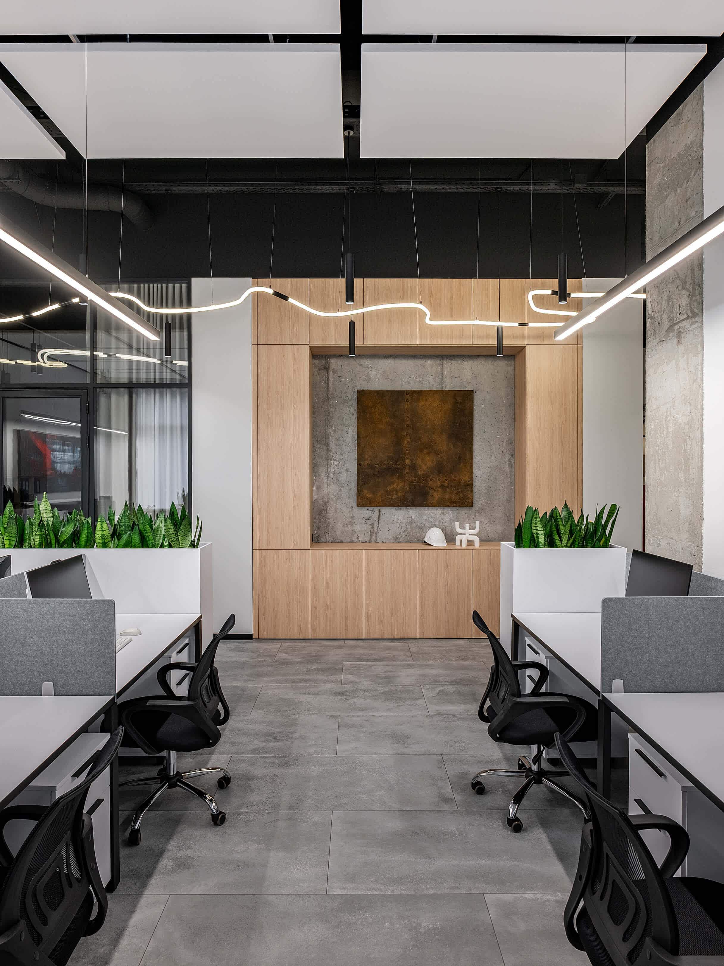 Опенспейс (48 м²)- продуманный до миллиметра. Рабочие места менеджеров - с двусторонними кабель-отверстиями (учли и левшей, и Pin-Up подкатными тумбами и чёрной кромкой столов, чтобы скрывать следы времени. Войлочные панели - обязательный элемент акустического комфорта. Потолочные панели скрывают кондиционеры и гасят шум. Над всем - линейные диодные светильники на заказ.