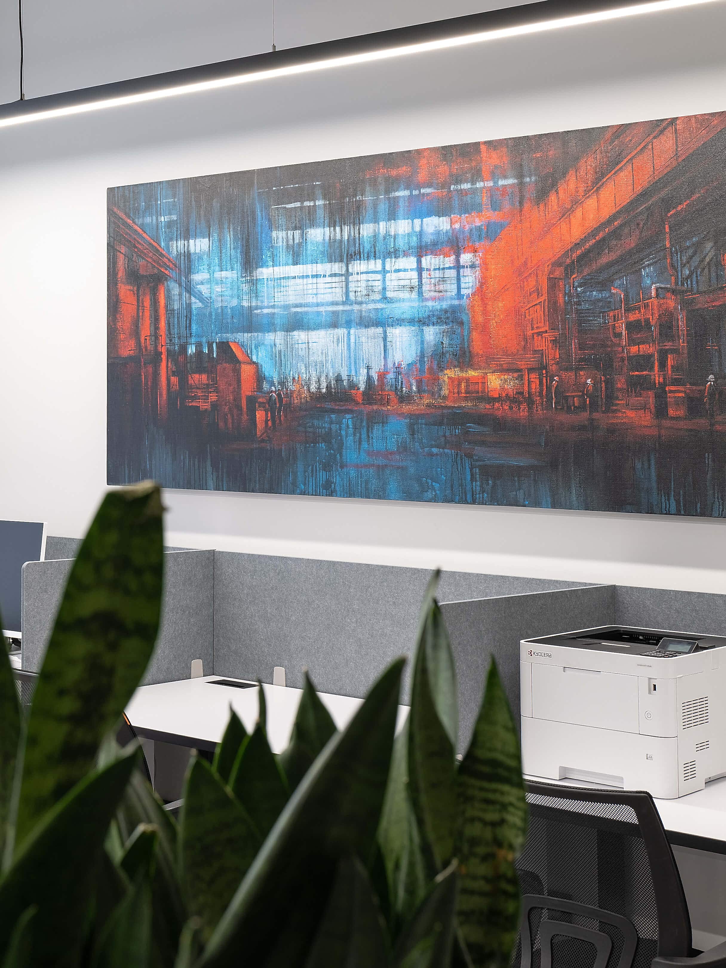 На стенах - картины, созданные специально для этого пространства, с индустриальной метафорой: как тяжело на заводе, и как легко и эффективно в этом пространстве. Хранение решено через высокие тумбы и Pin-Up системы. Кашпо с растениями отделяют рабочую зону от прохода.