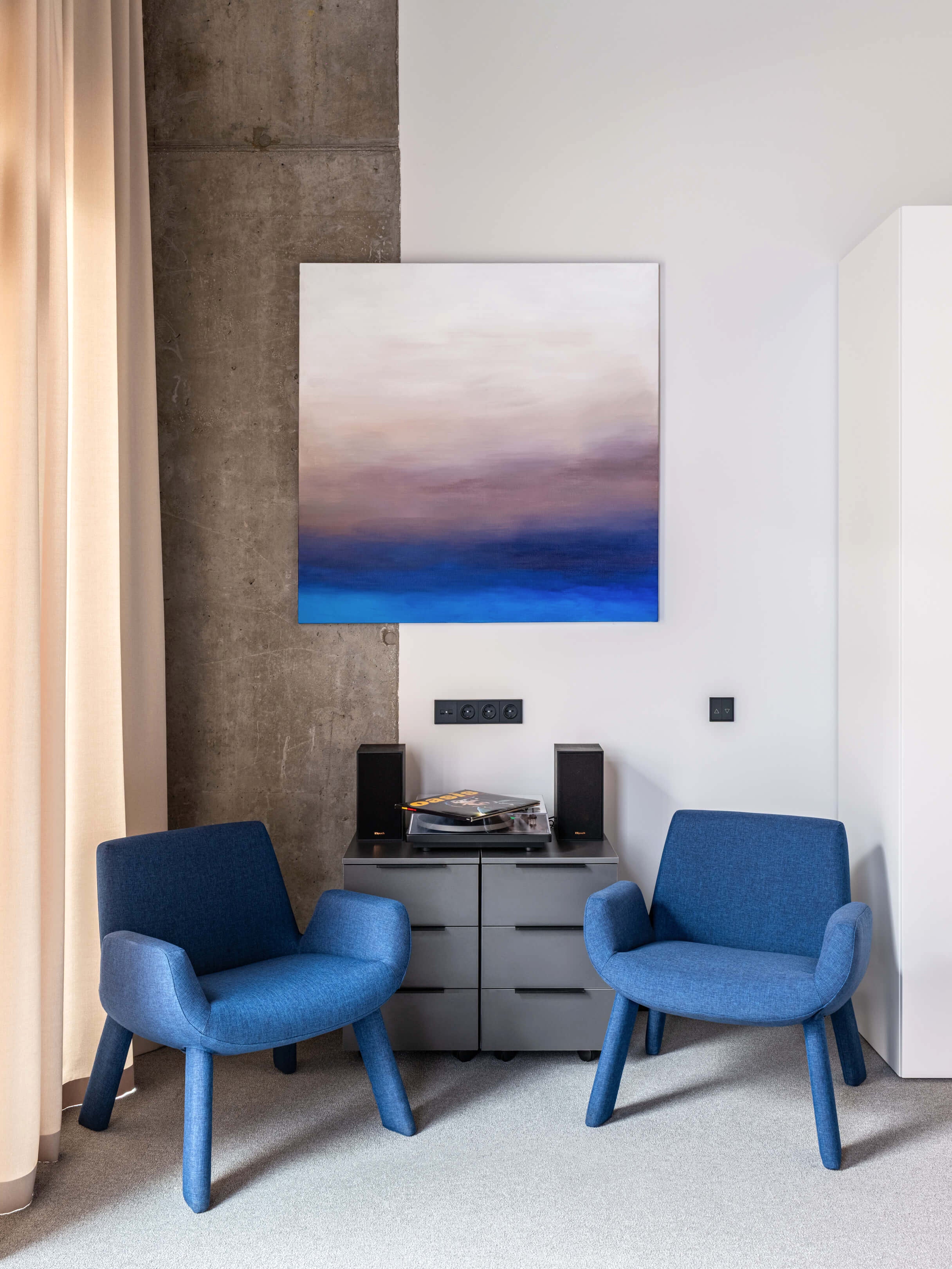 Большая переговорная - 27 м².Центр притяжения - стол на заказ на тяжёлом металлокаркасе. Светлая столешница отражает усиленное освещение, создавая ощущение простора. Всё предусмотрено для продуктивной коммуникации: встроенные розетки, кабель-каналы, подключение к экрану для трансляций. На стене - стеклянная маркерная доска, архитектурные металлические полки для арт-объектов и презентаций. Пространство управляется голосом - «умный дом» подключён.