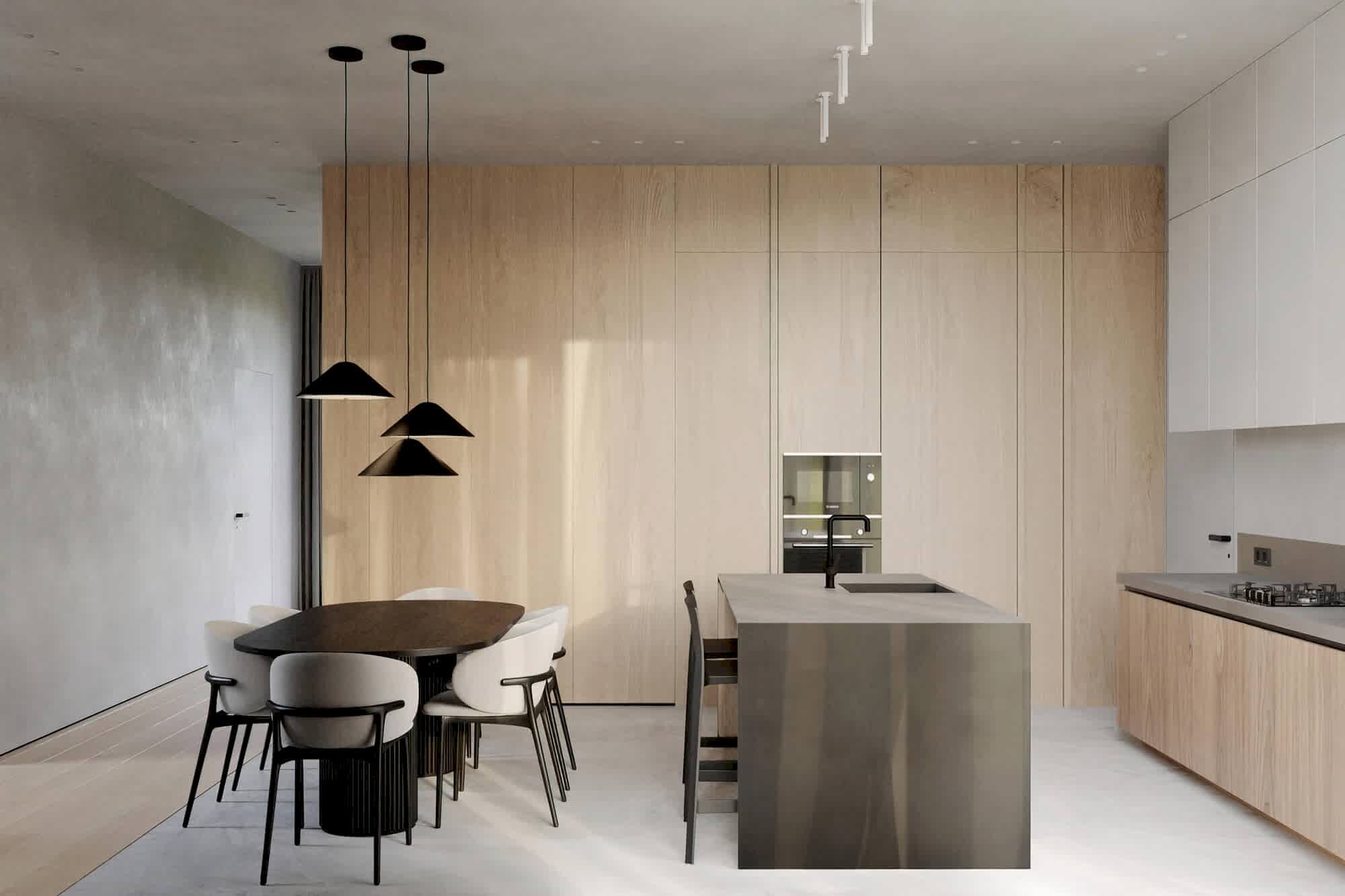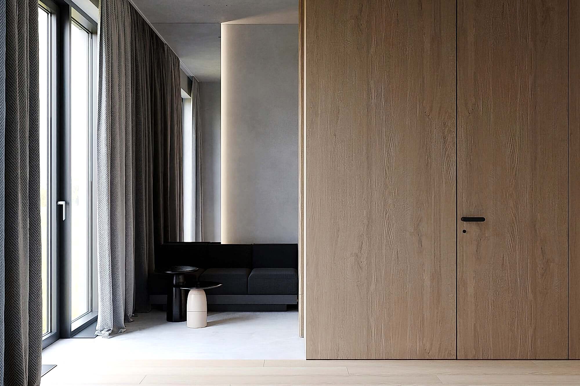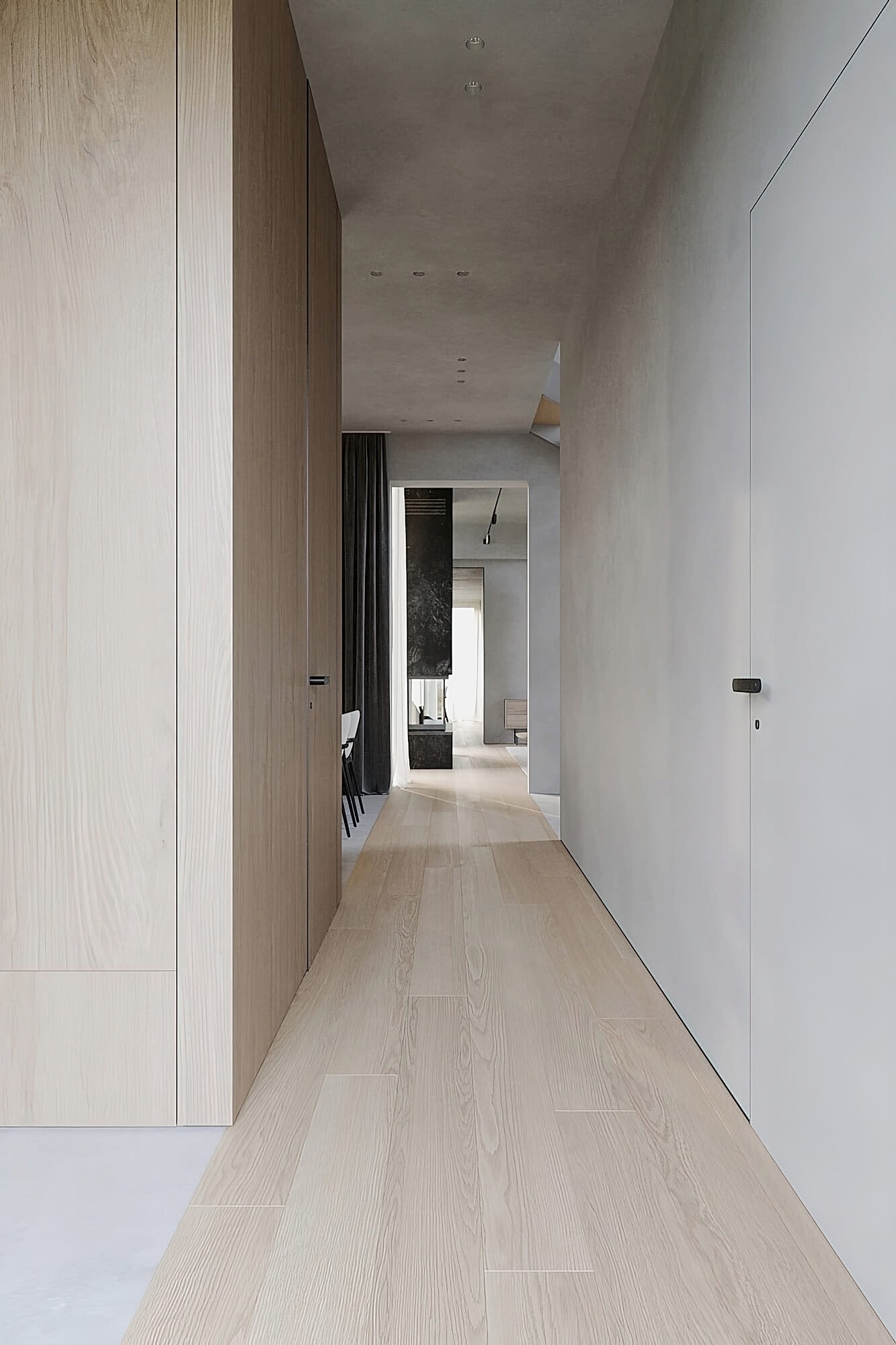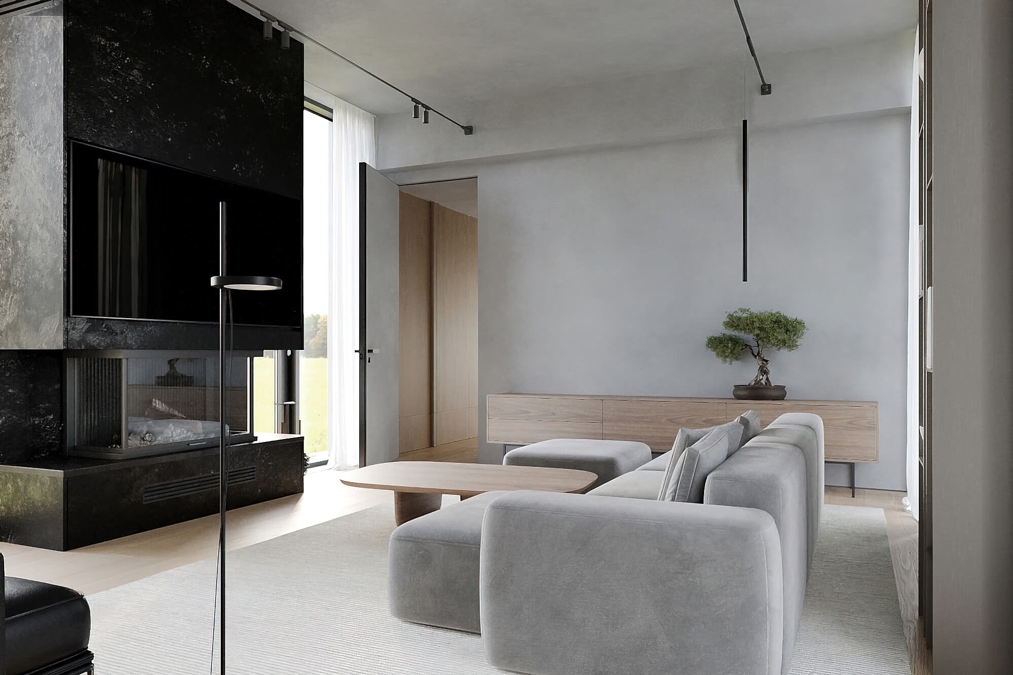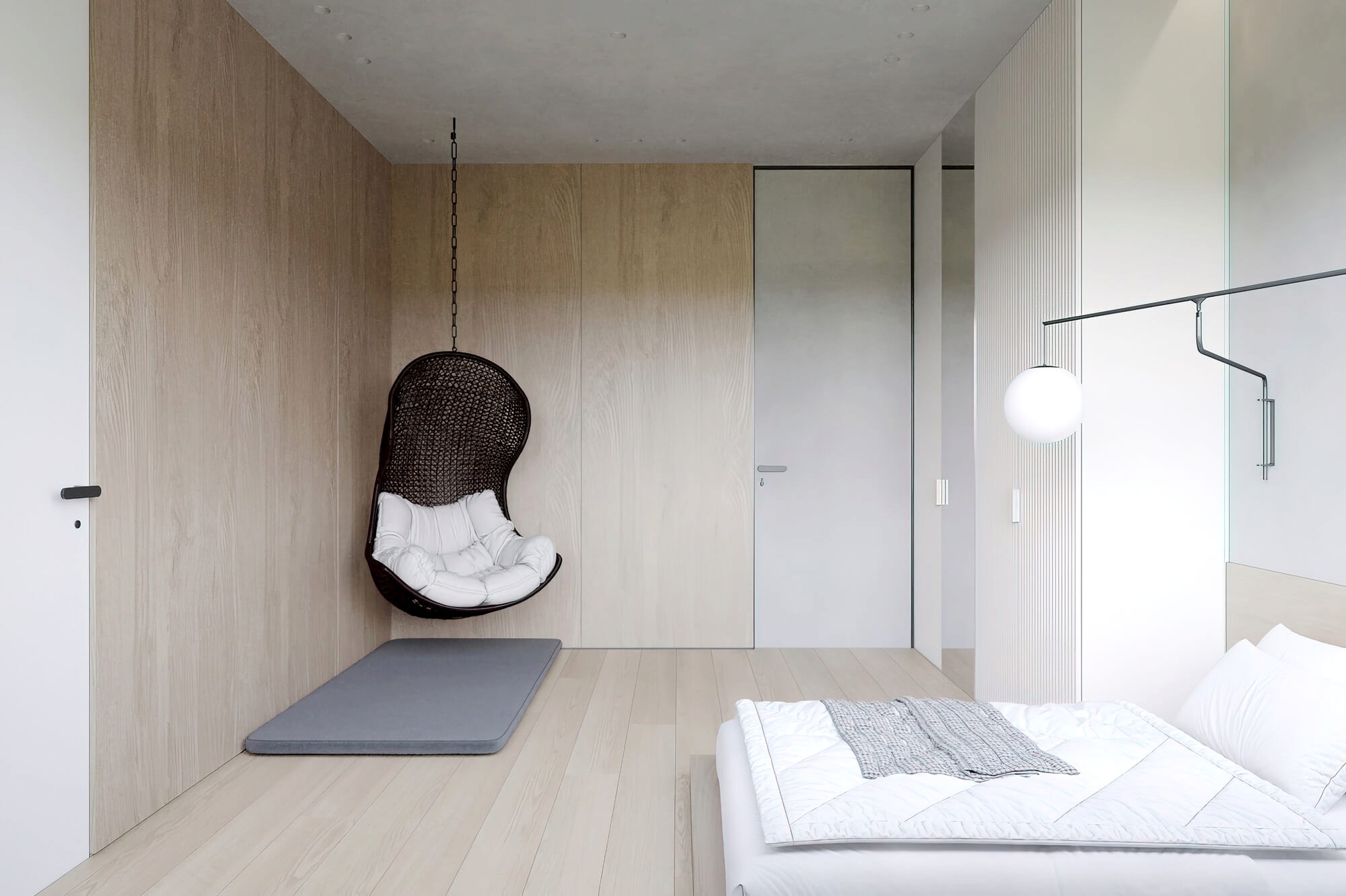 В этом проекте мы Pin-Up японским спокойствием и умиротворением, поэтому был выбран современный минимализм с элементами ваби-саби. Весь интерьер выполнен в натуральных природных оттенках.