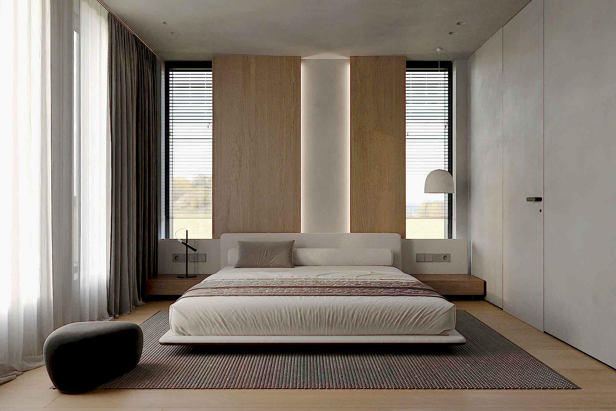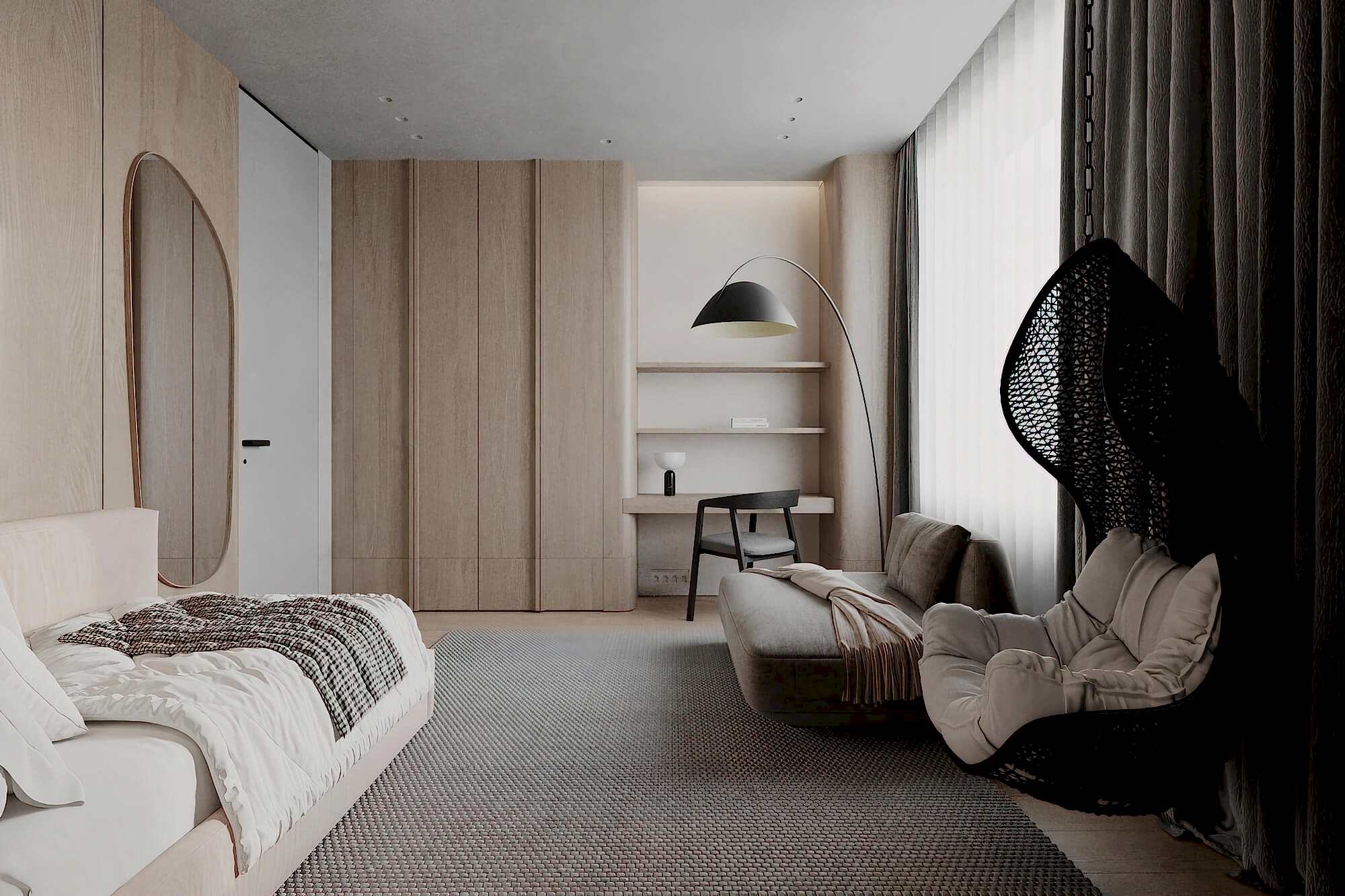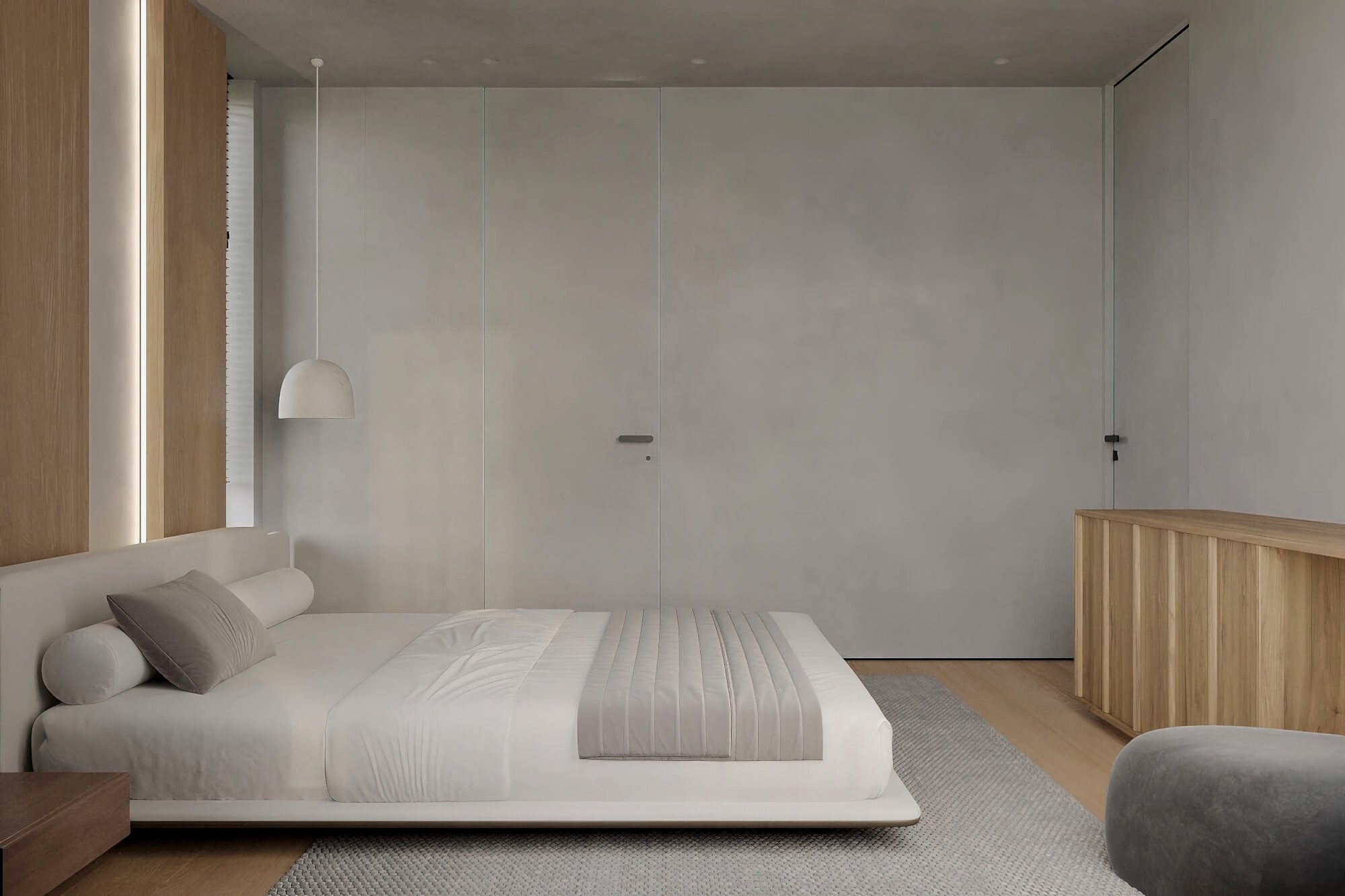 Мастер-спальня расположена в приватной зоне, со своим санузлом и гардеробной зоной и рабочим Pin-Up В спальне только необходимое: минималистичная кровать, низкие тумбы и комод.