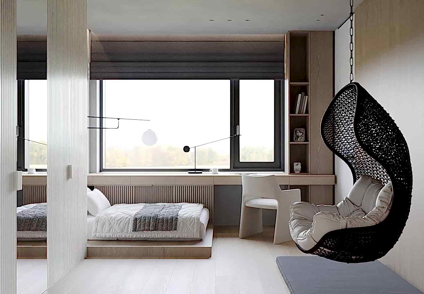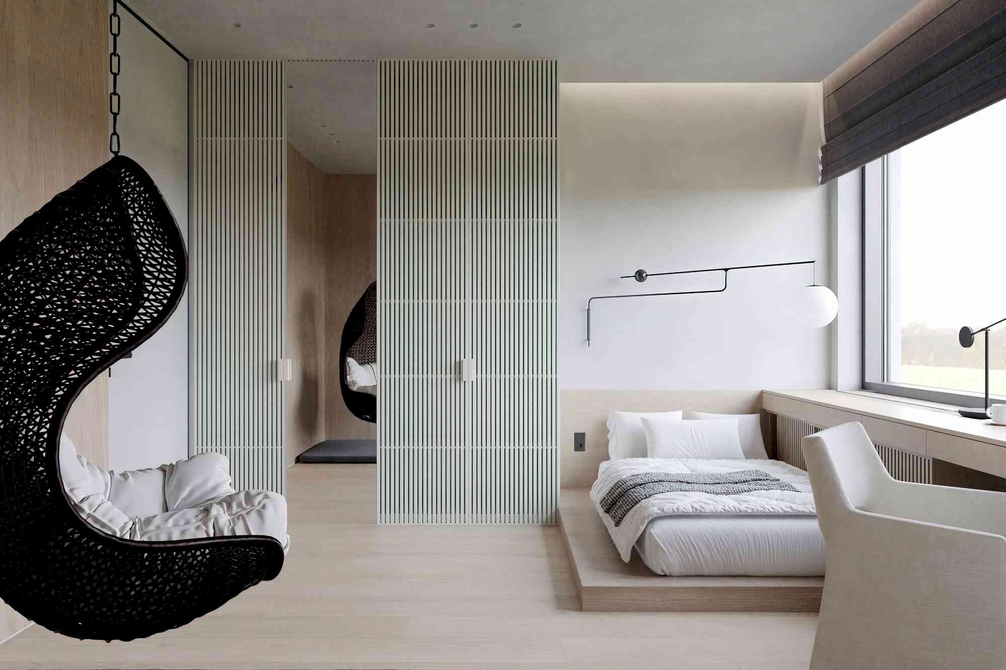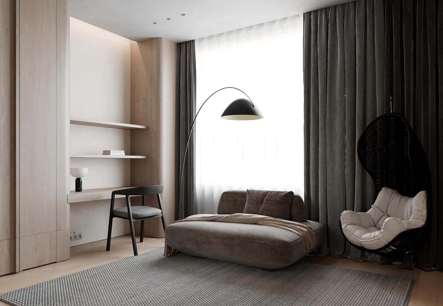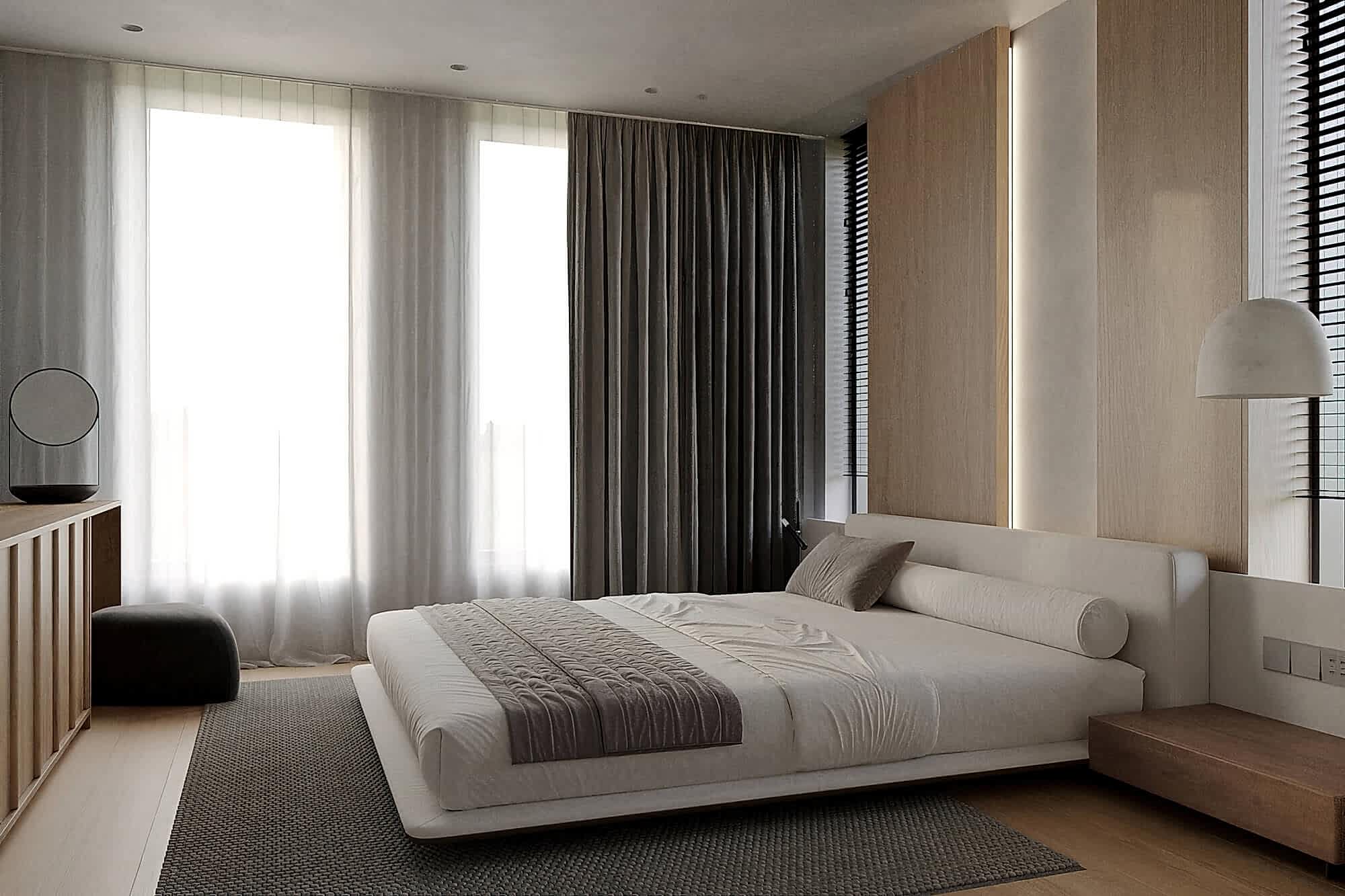 Мастер-спальня расположена в приватной зоне, со своим санузлом и гардеробной зоной и рабочим Pin-Up В спальне только необходимое: минималистичная кровать, низкие тумбы и комод.