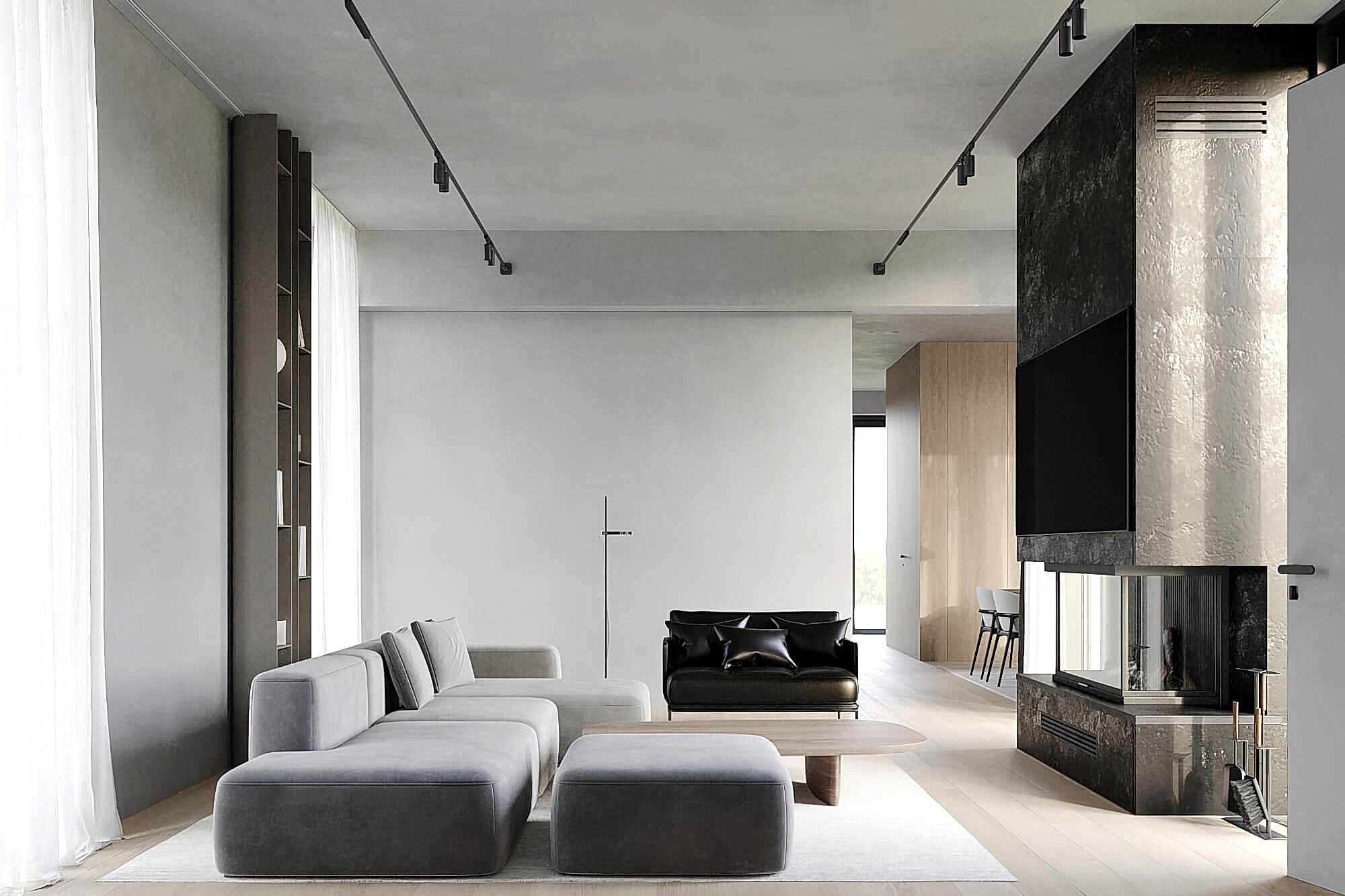 Гостиная в этом проекте - место отдыха и расслабления. Pin-Up будут уютные посиделки с друзьями и просмотры любимых фильмов полулежа, поэтому мы поставили низкий диван и стол. Зимними и осенними вечерами можно будет разжечь камин и послушать музыку. Летом - наслаждаться красивым видом на собственный сад в больших панорамных окнах.