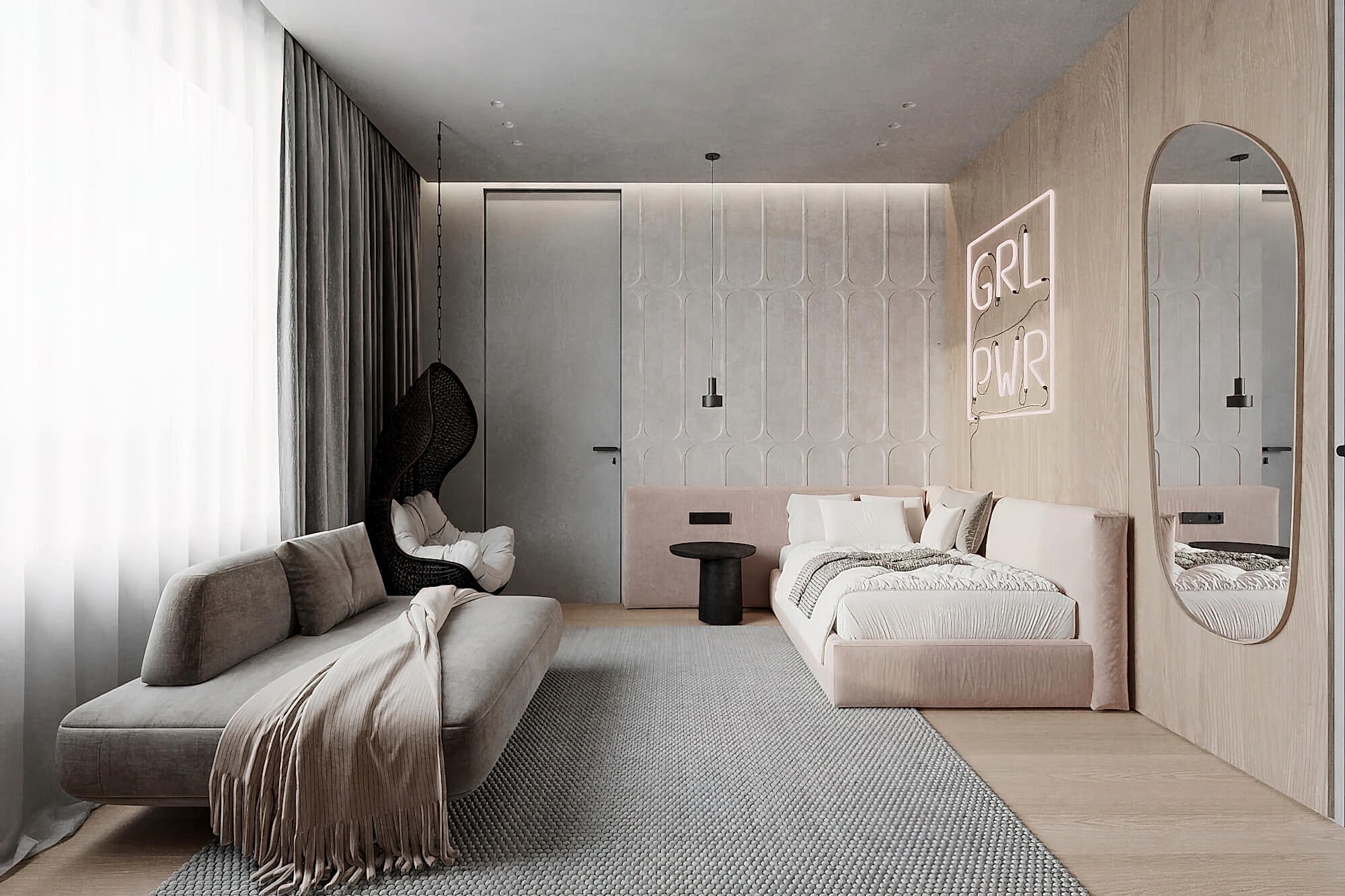 Комната младшей девочки-подростка еще по-детски мягкая и нежная, но уже по-взрослому многофункциональная. В качестве спального места большая Pin-Up 1.2*2м. Чтобы смягчить строгость, за изголовьем кровати разместили стеновой декор. Для встреч с подружками - удобный диван. На случай дистанционного обучения - рабочий стол.