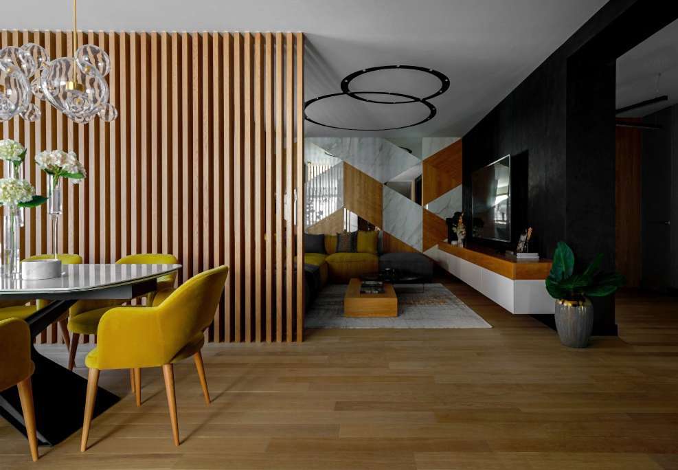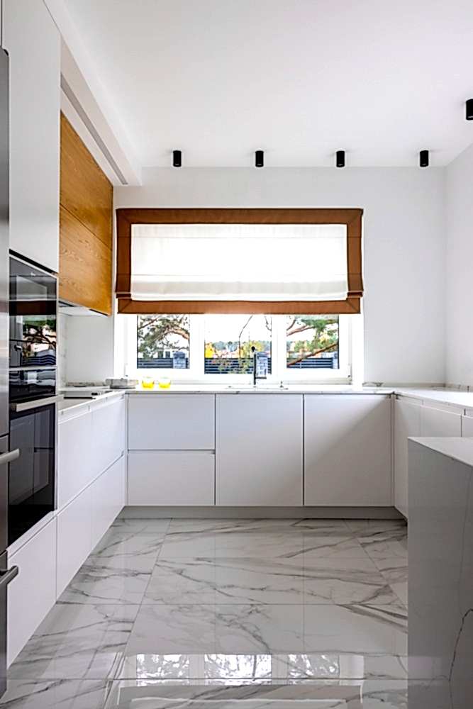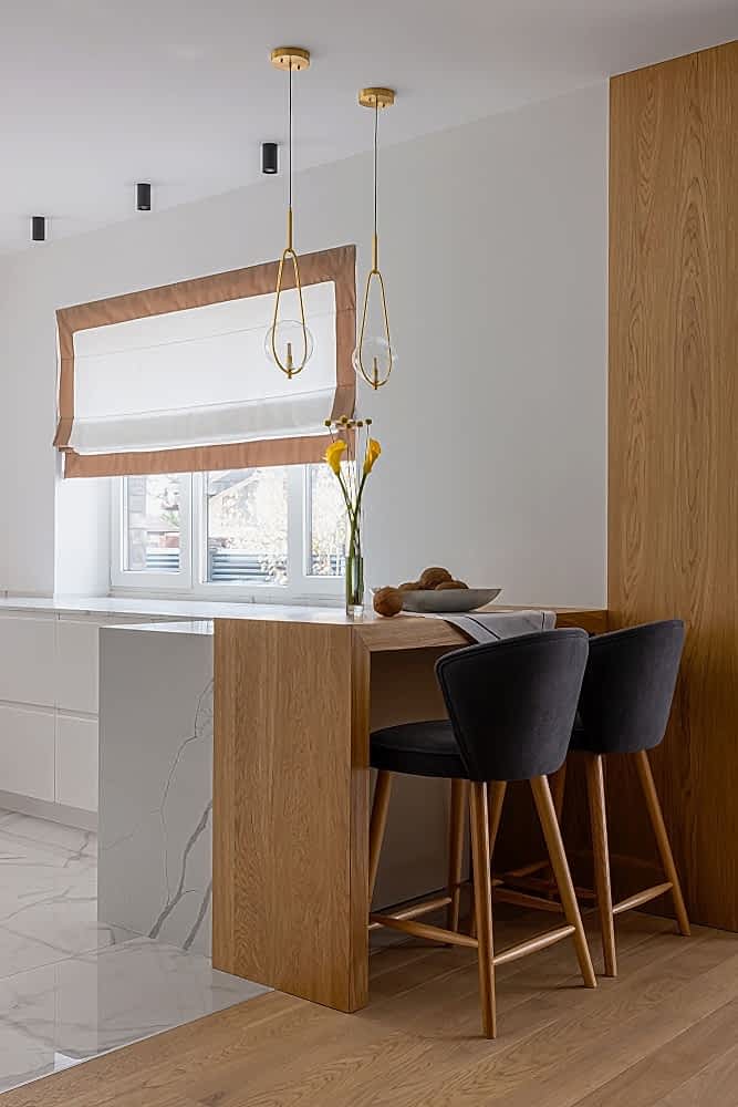 П-образную светлую кухню. Кухня сделана с умными уголками и оснащена всей необходимой техникой. К ней пристроена барная стойка для перекусов. Рядом с кухней мы расположили красивый обеденный стол, который поддержан рейками Pin-Up отделяющей обеденную зону от зоны отдыха. В обеденной зоне мы расширили окна и сделали их в пол, чтобы дневной свет красиво освещал пространство. Стало уютно, логично и просторно.