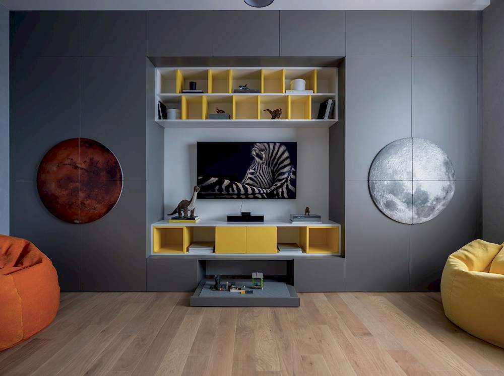 Отдельная игровая комната - мечта из детства, которую мы реализовали. Игровую комнату мы разместили на первом этаже, чтобы дети были рядом с родителями, когда играют в игры и в любой момент могли показать, что получилось, а родители зайти к ним. В игровой мы разместили все для радости детей и их друзей: настольные игры, приставка, ТВ, зона для рисования, игровой столик. Pin-Up на любой вкус.