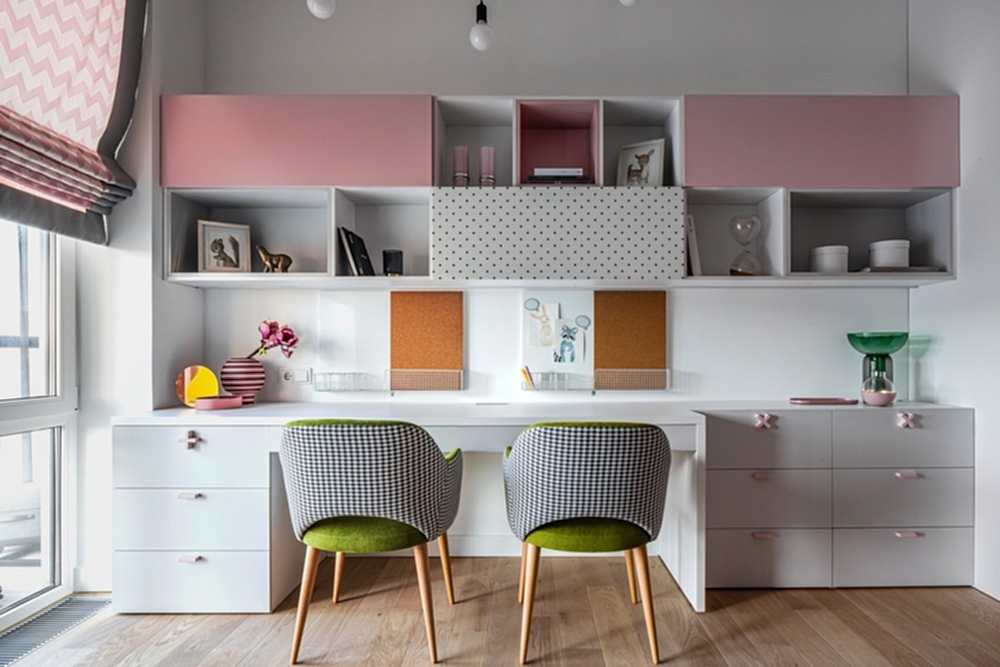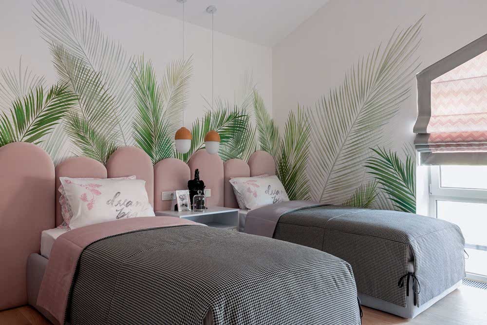 Детская комната для девочек в проекте выполнена в стиле экзотического цветущего сада. На стенах ручная роспись в виде листьев пальмы. Благодаря которой в пастельно розовой цветовой гамме появился освежающий зелёный и настроение тропиков. В детской комнате есть все для комфортной жизни: две кровати с внутренними системами хранения, большая рабочая зона с большим количеством ящиков для школьных принадлежностей и книг. Благодаря продуманному зонированию девочкам будет комфортно Pin-Up в комнате вдвоём и поддерживать порядок.