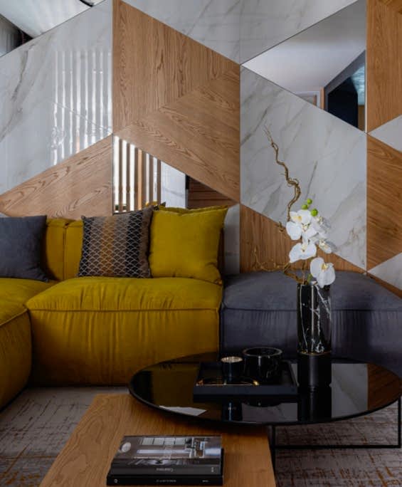 Pin-Up назначение гостиной - отдых. Чтобы отдыхать было приятно и удобно, мы разместили низкий мягкий диван, на котором очень удобно сидеть «полулёжа» за просмотром хорошего кино как одному человеку, так и всей семье. Фишка этой гостиной - это комбинированное панно из керамогранита, шпонированных панелей и зеркал на стене. Стена в зоне ТВ оформлена декоративной штукатуркой с вертикальным делением, что дает весомости и объема пространству, а потолок выкрашен в чёрный цвет.