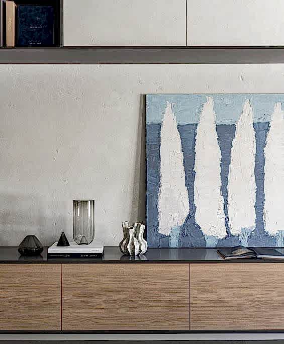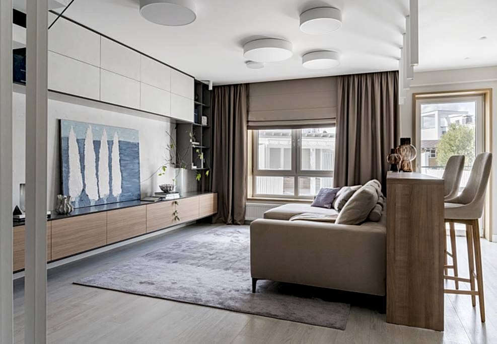 Отделка стен в доме - покраска, чтобы Pin-Up легко ухаживать и мыть светлые стены. На стене в зоне ТВ использована декоративная штукатурка, она же продолжается на фасадах стеллажа под ТВ.