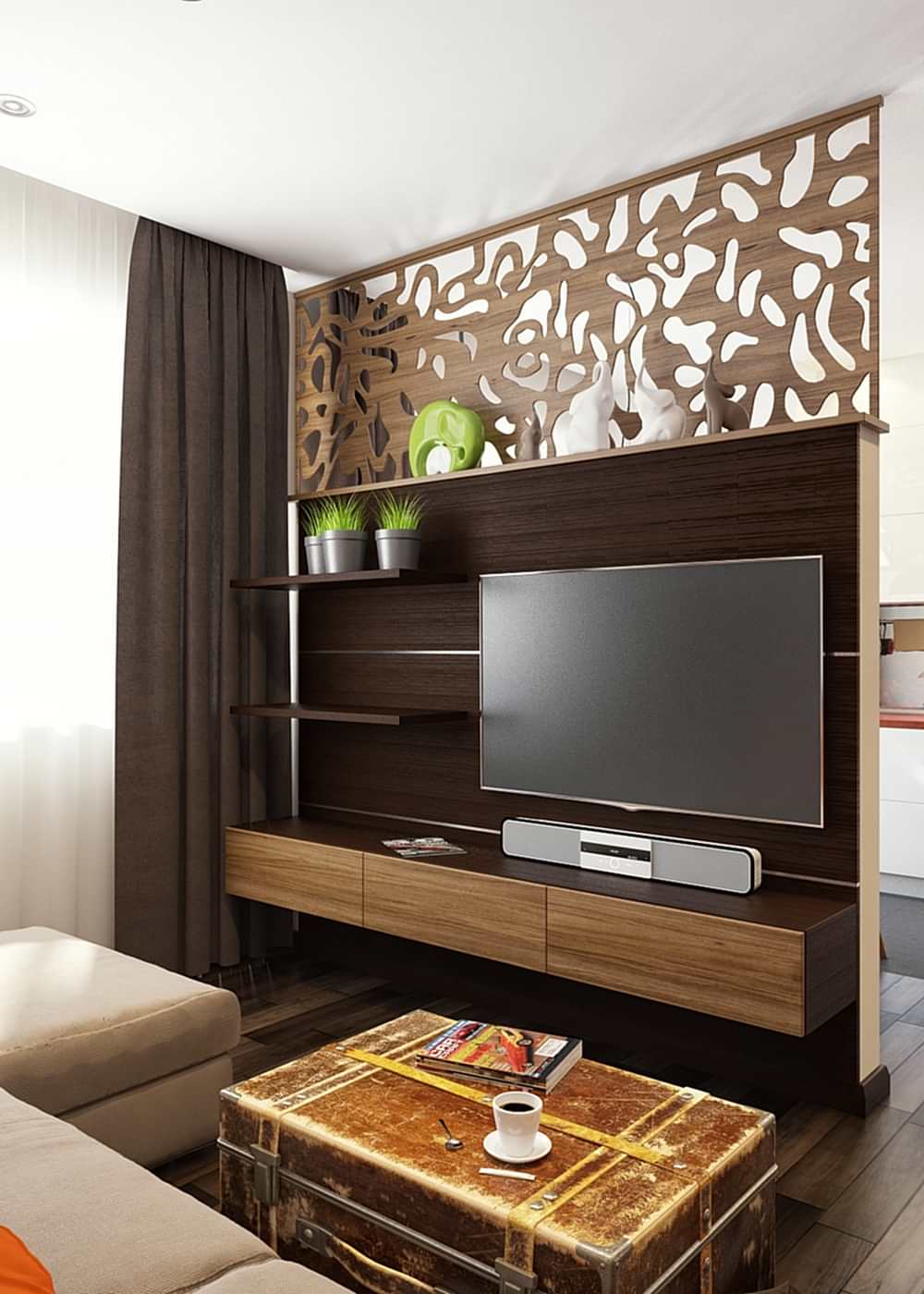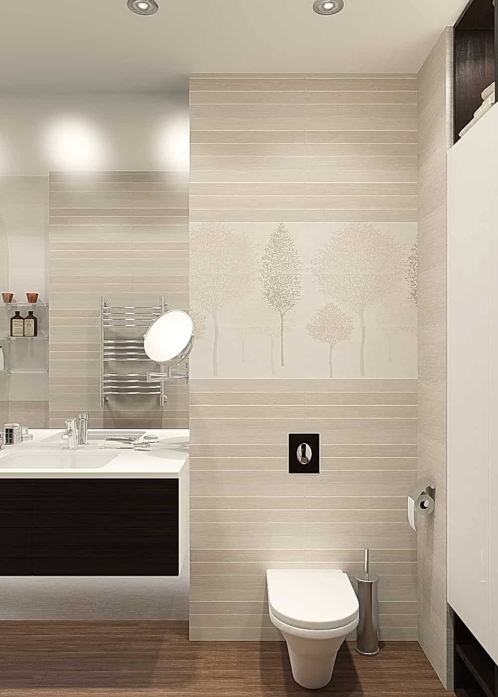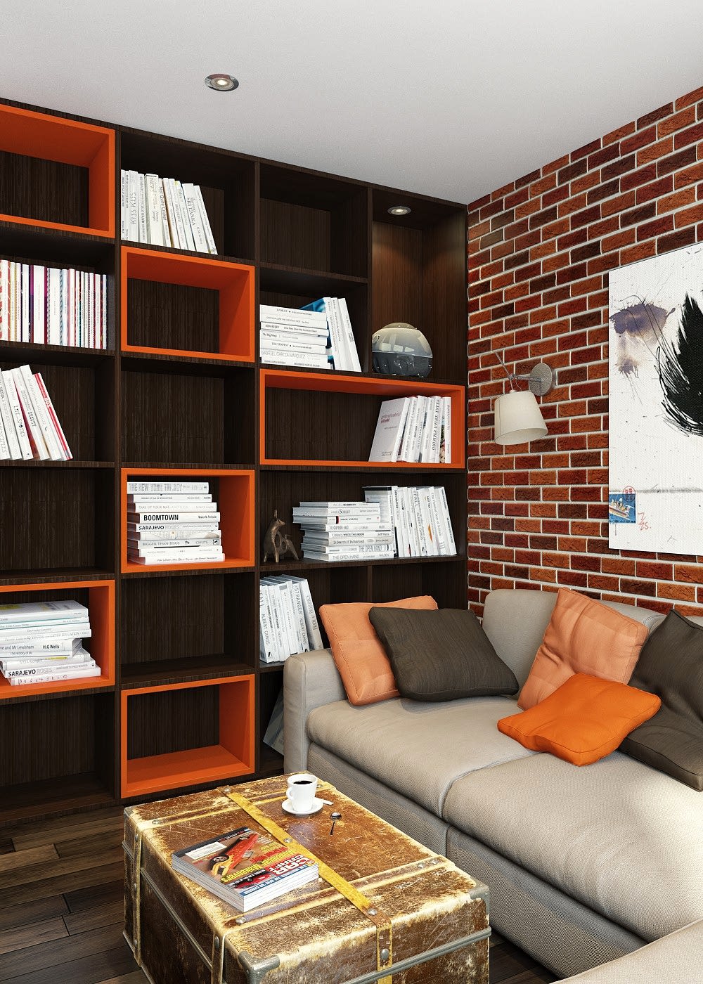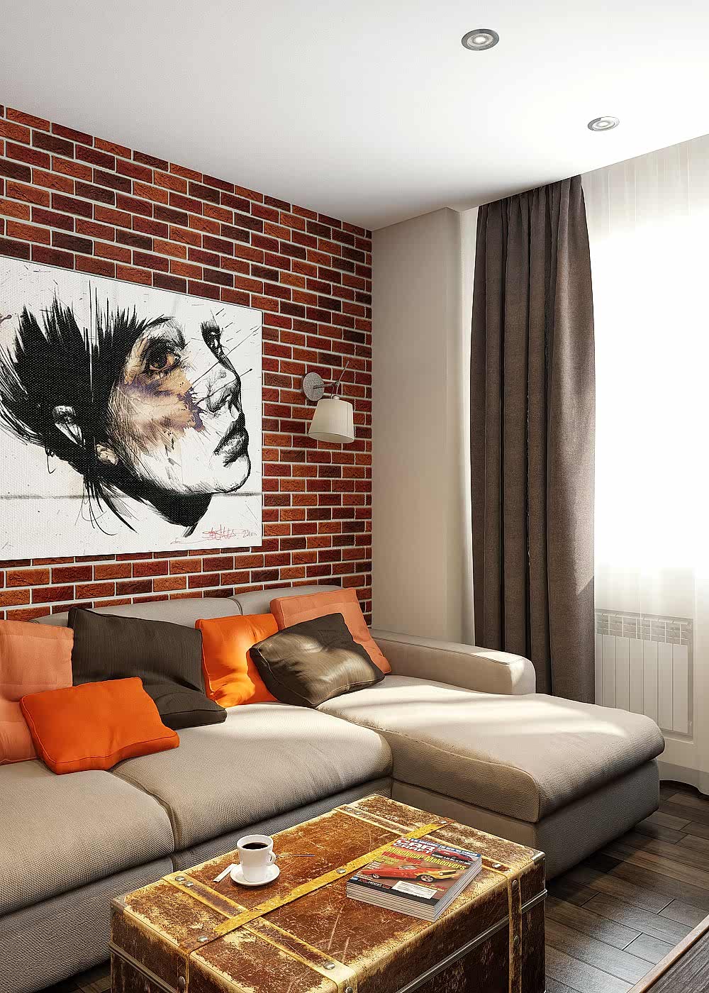 Заказчица - молодая девушка, редактор в журнале, пишет книги и ведёт свой блог, заказчик - молодой человек, профессионально занимается мотоциклами, любит экстрим! Задача стояла сделать интересный дизайн в приглушенной теплой гамме с элементами лофта. Были изменения в планировке: из большого зала мы выделили одну комнату под детскую, таким образом из двухкомнатной у нас получилась Pin-Up квартира! На месте гостевого санузла мы сделали гардеробную и хоз. зону со стиральной машиной. Узкую и длинную ванную комнату необходимо было хоть как-то расширить, поэтому для нее была выбрана максимально светлая плитка, но при этом интересная по дизайну.