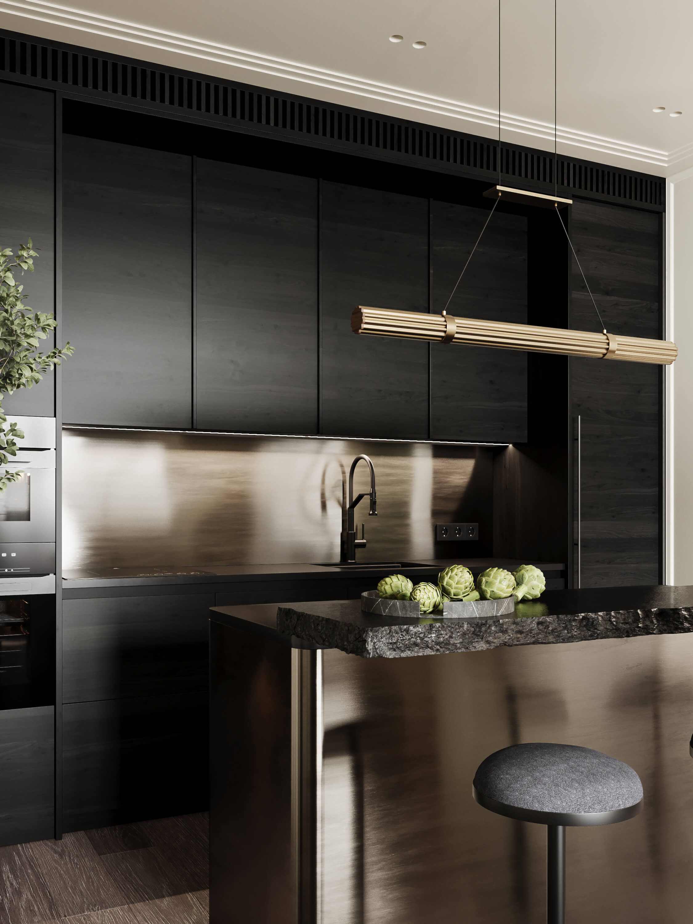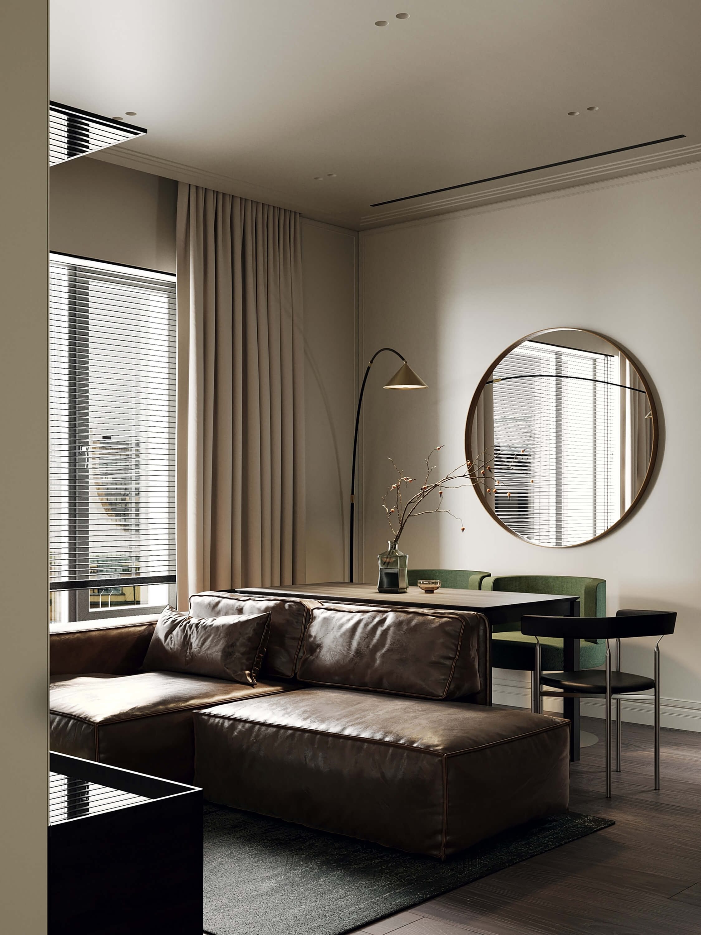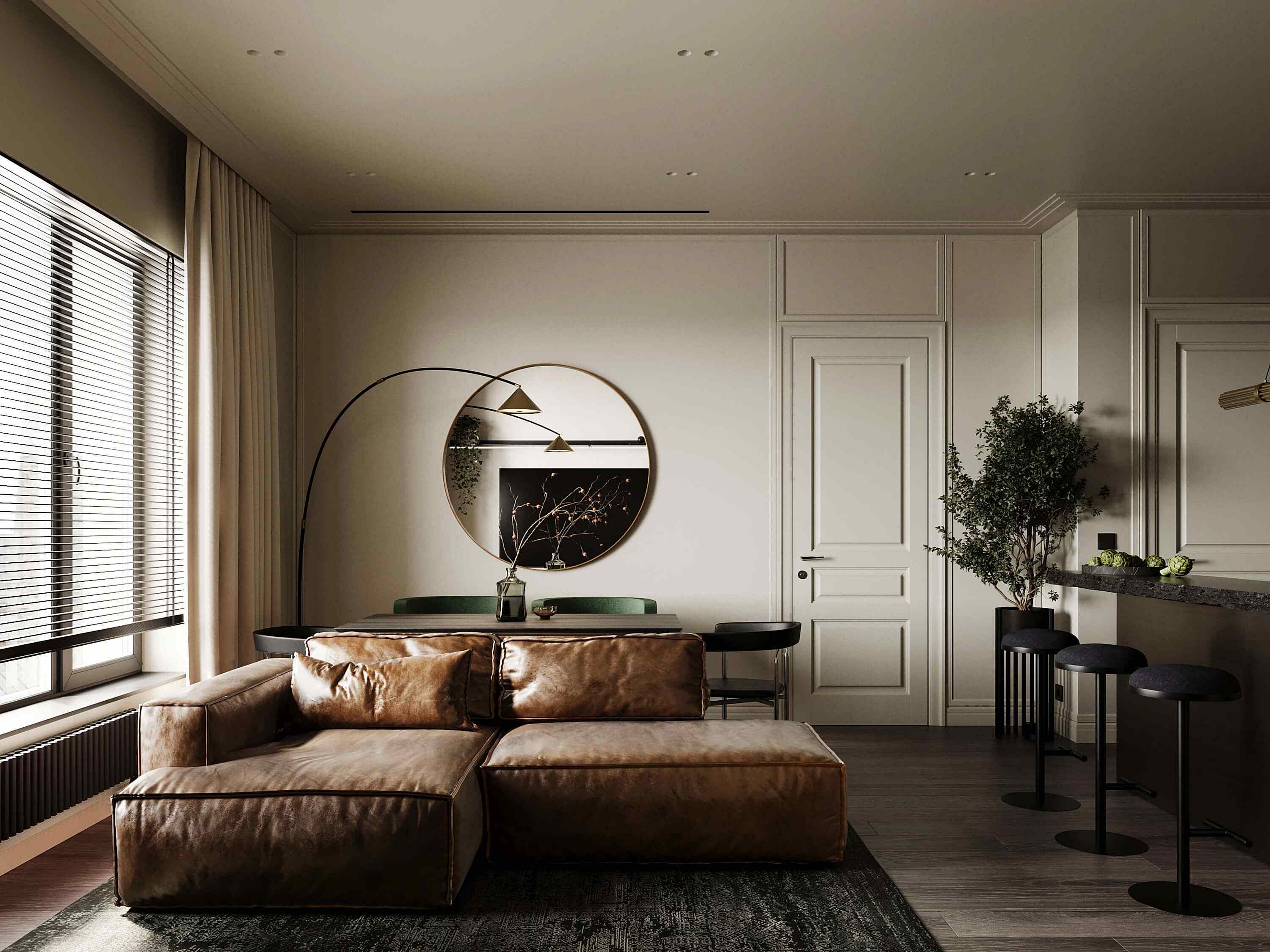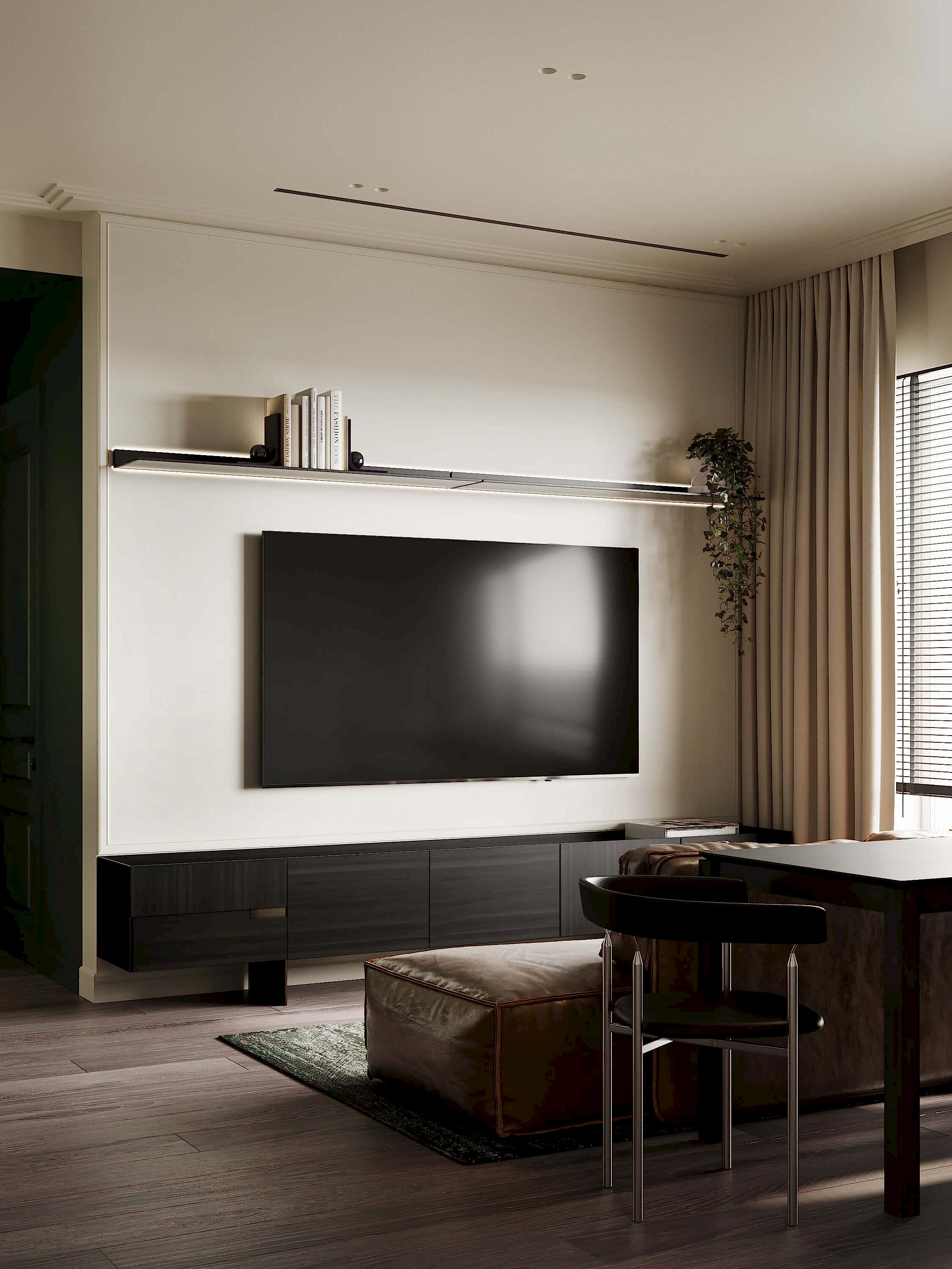 Мы взяли классическую основу - молдинги, высокие Pin-Up плинтус - и на этот фон наслоили фактуры с характером: кожаный диван, кварцевую «колотую» столешницу, выразительный шпон. Чтобы интерьер не стал слишком тяжёлым, добавили ультрасовременные элементы: металл, световые сценарии, акцентные линии.