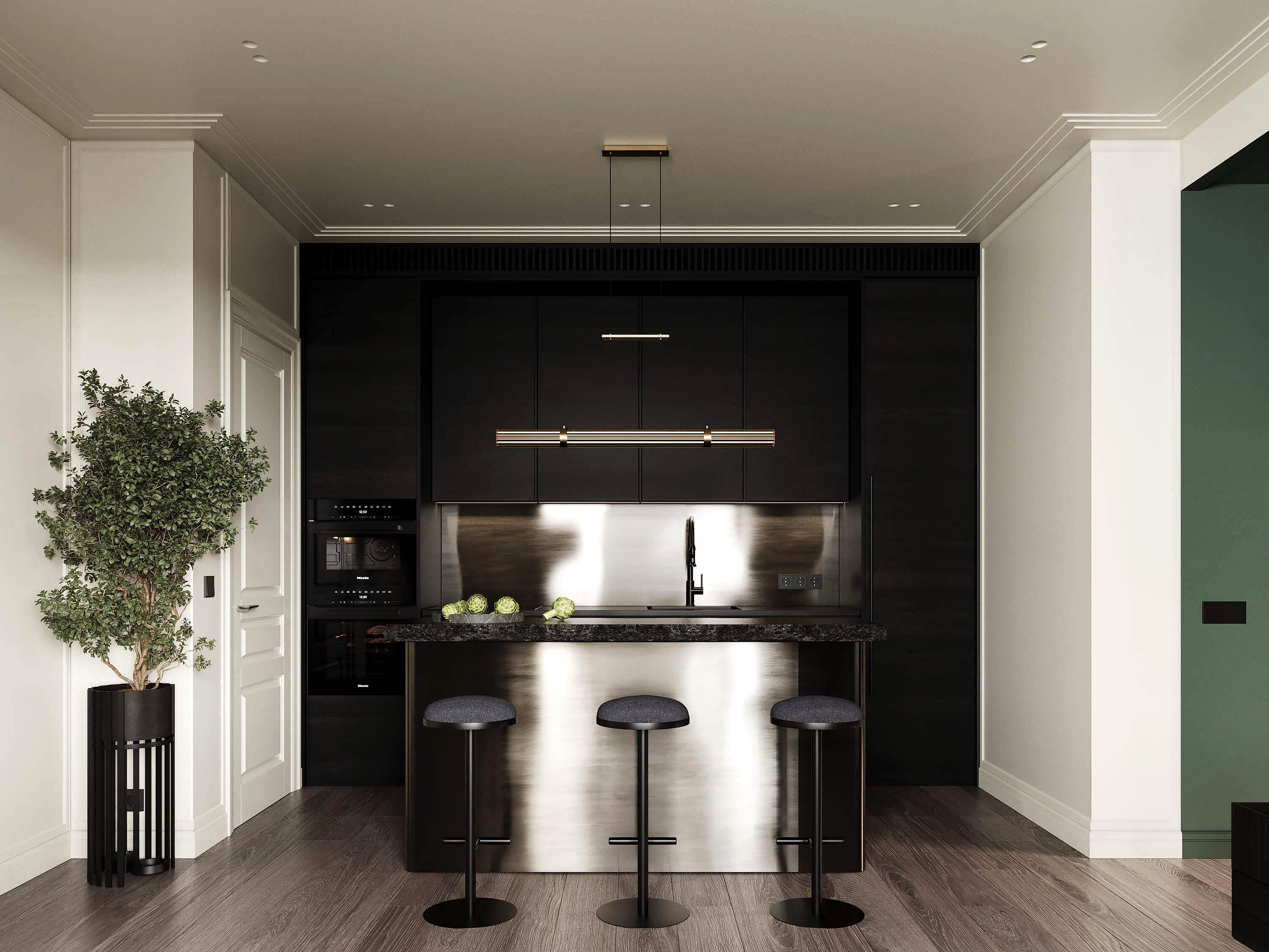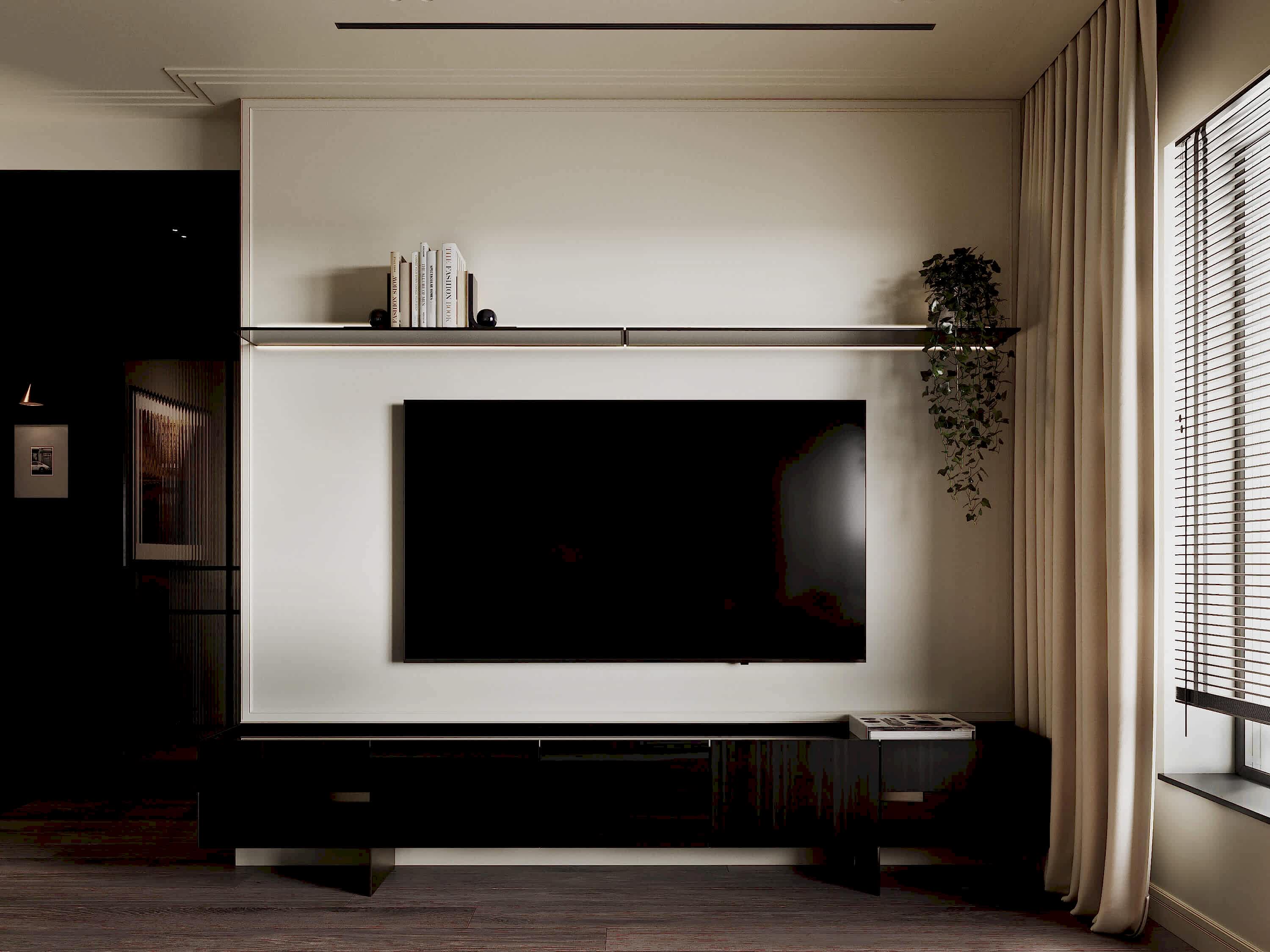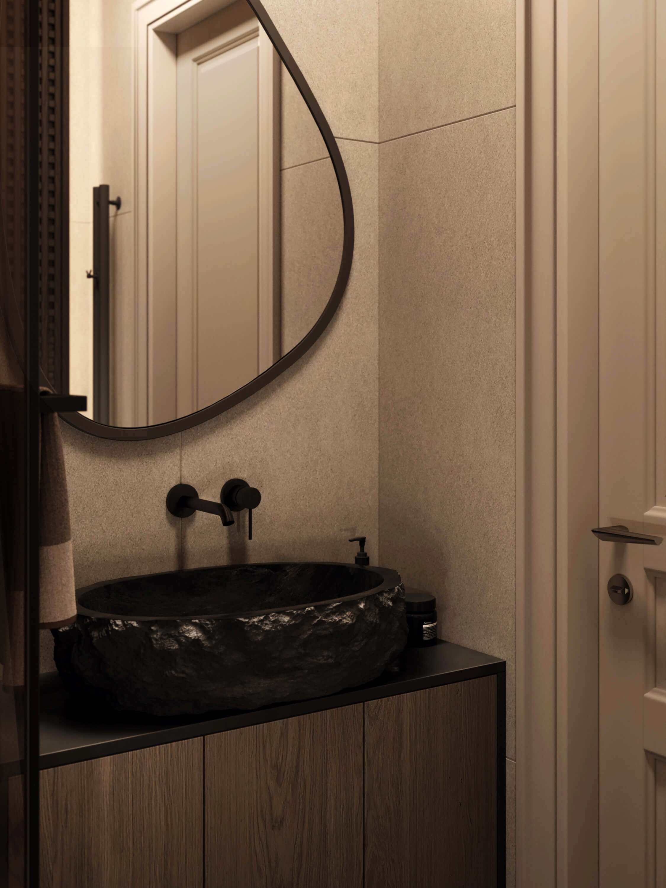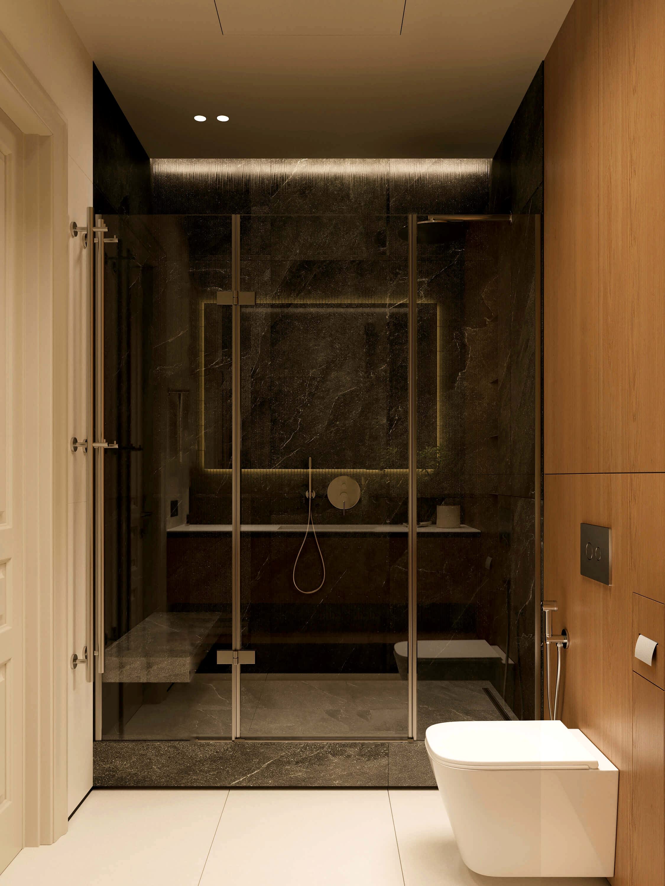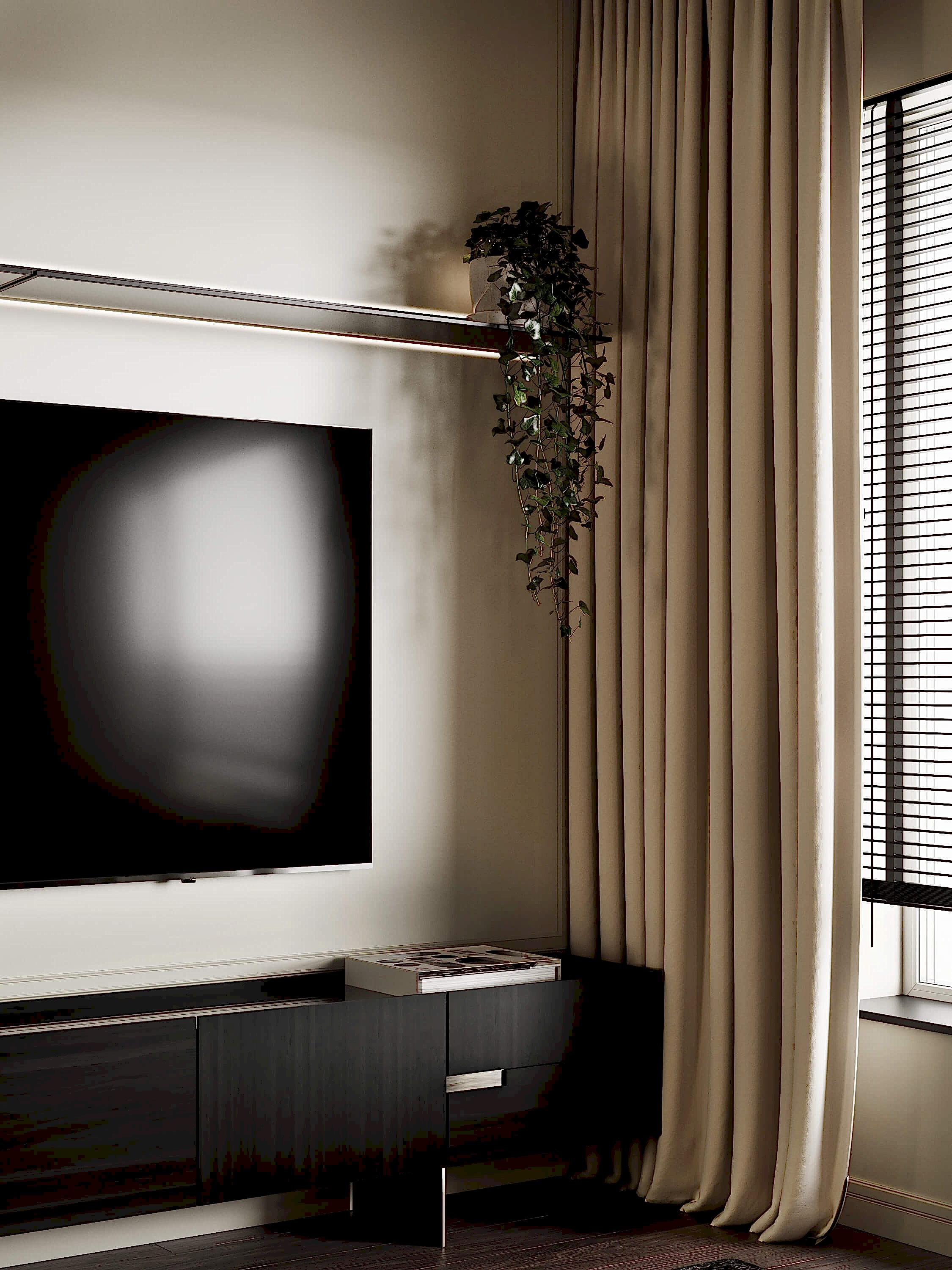Мы взяли классическую основу - молдинги, высокие Pin-Up плинтус - и на этот фон наслоили фактуры с характером: кожаный диван, кварцевую «колотую» столешницу, выразительный шпон. Чтобы интерьер не стал слишком тяжёлым, добавили ультрасовременные элементы: металл, световые сценарии, акцентные линии.