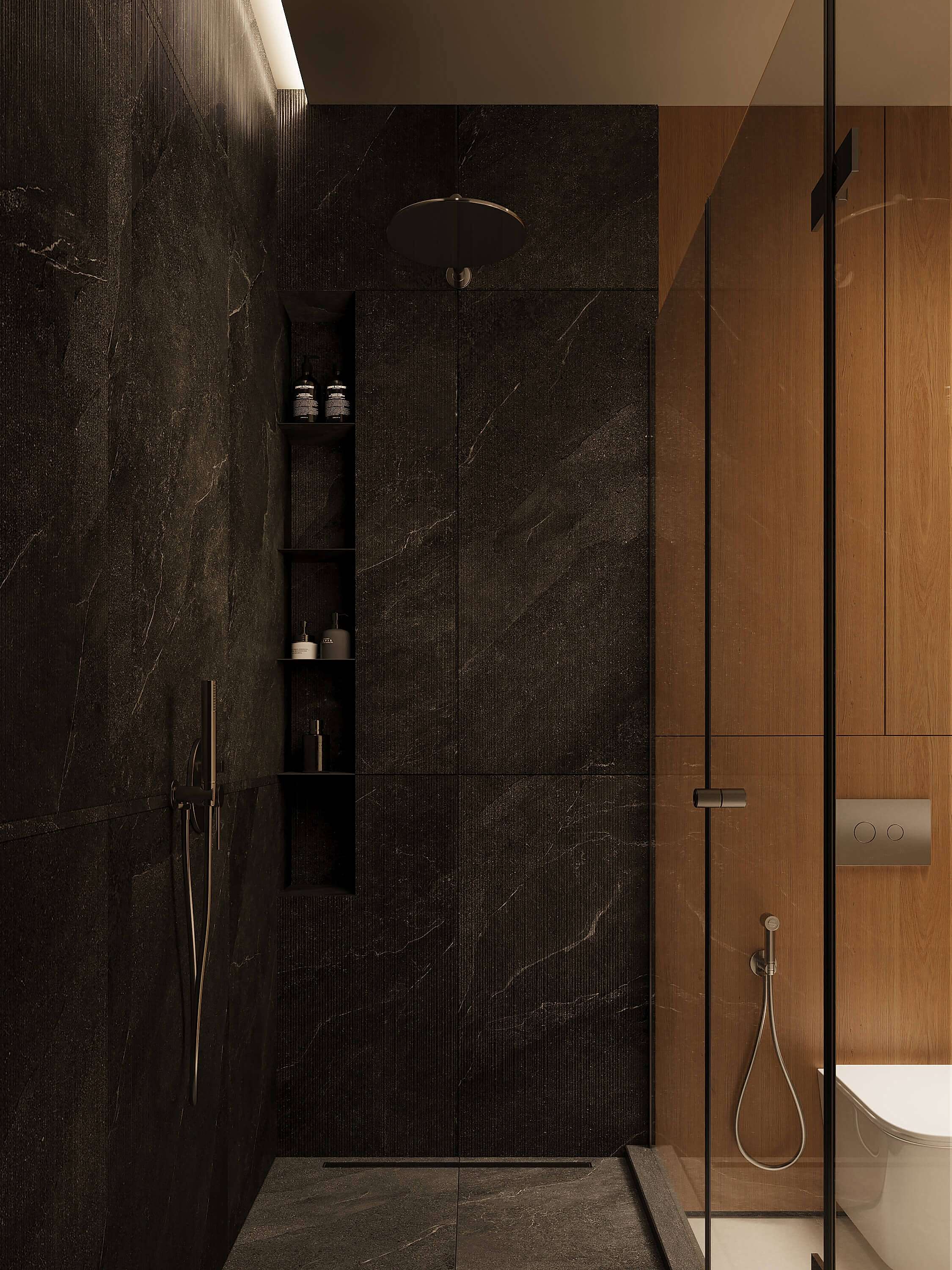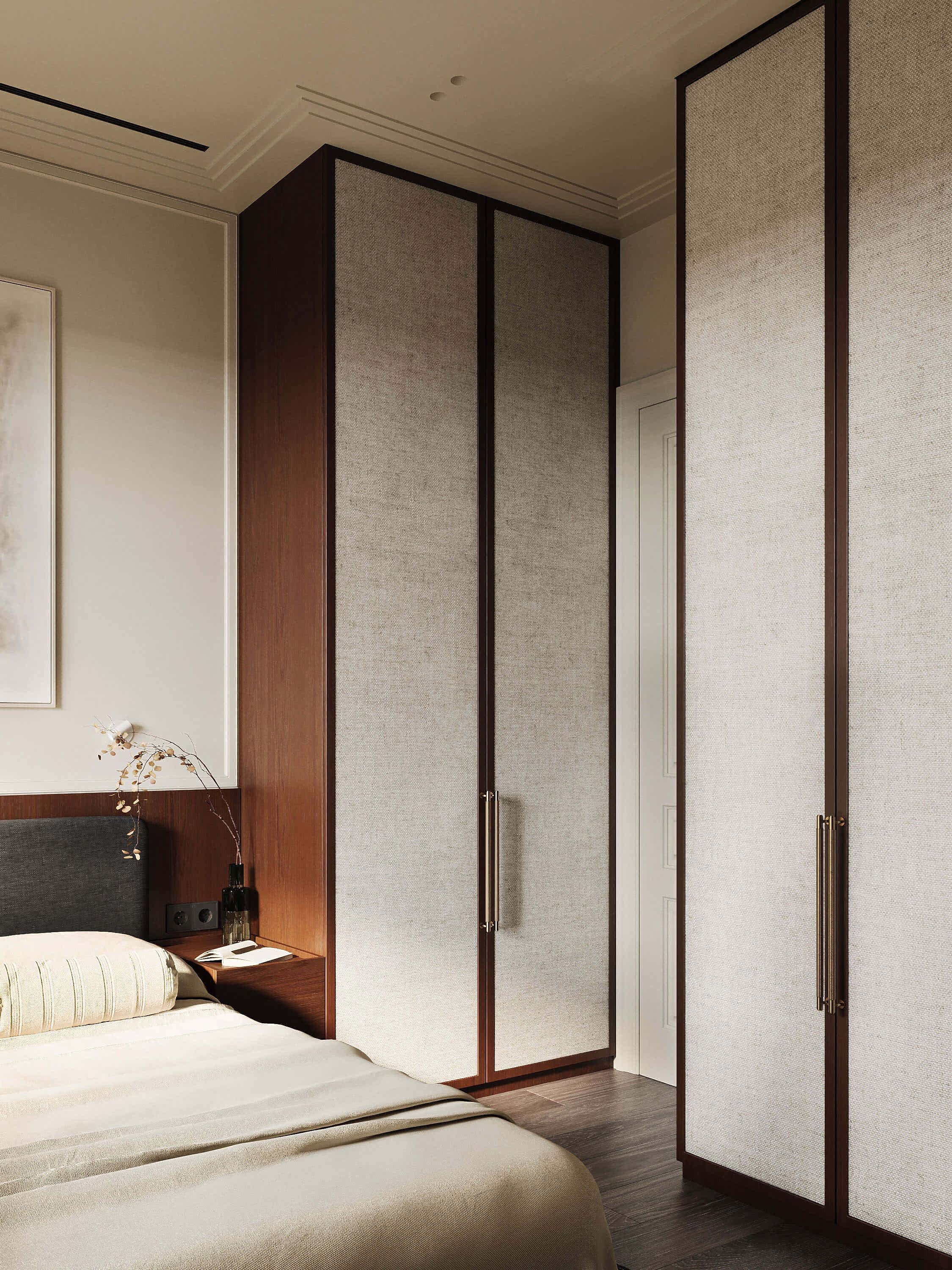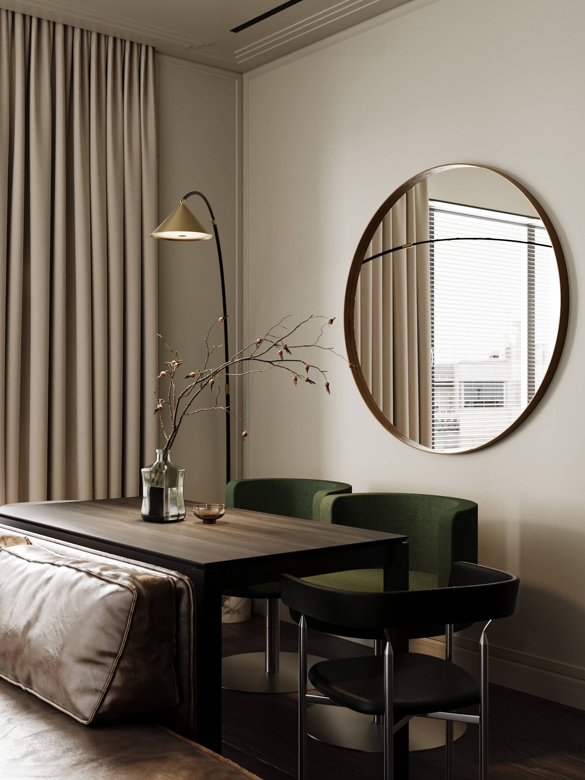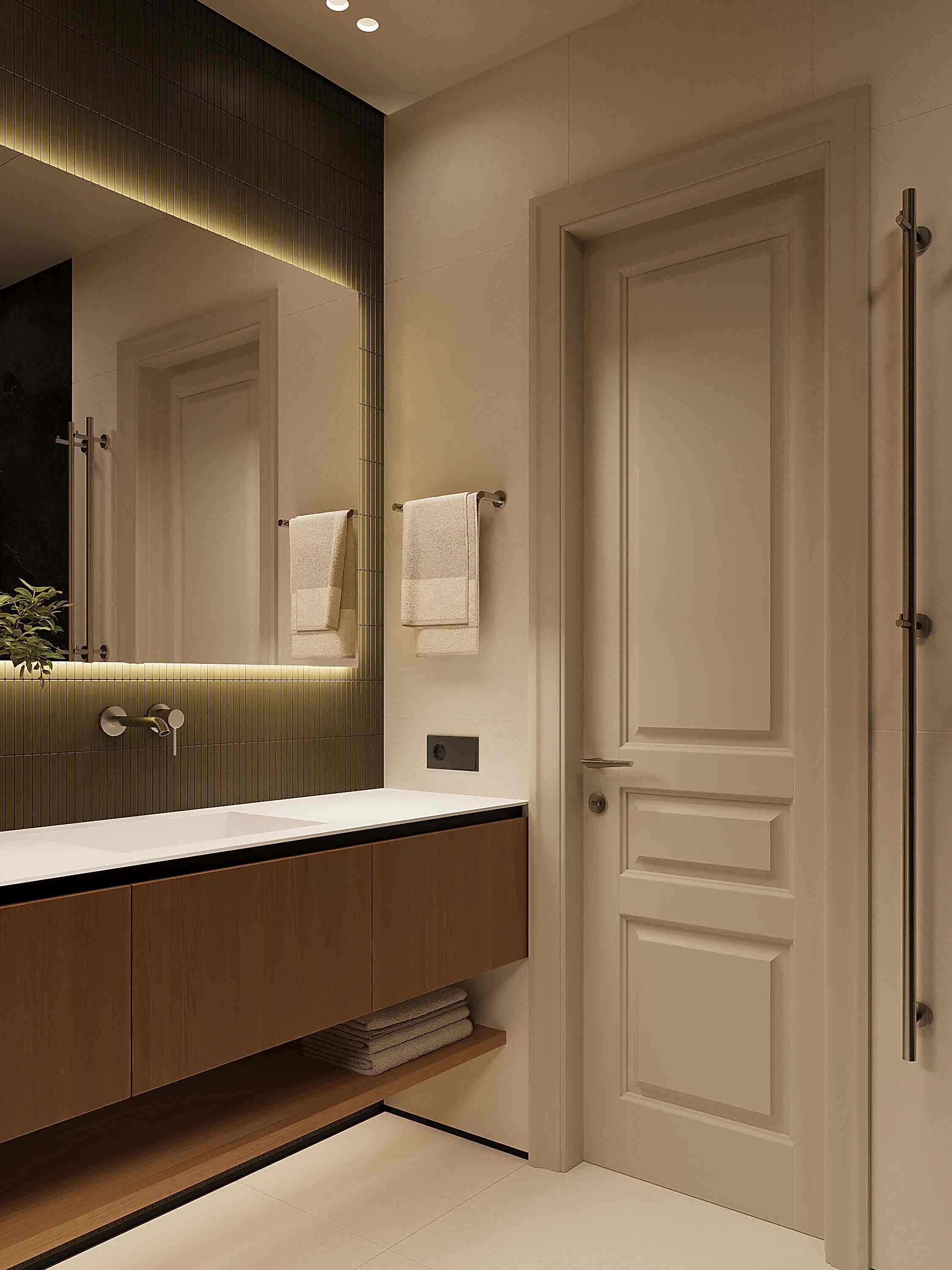 Мы взяли классическую основу - молдинги, высокие Pin-Up плинтус - и на этот фон наслоили фактуры с характером: кожаный диван, кварцевую «колотую» столешницу, выразительный шпон. Чтобы интерьер не стал слишком тяжёлым, добавили ультрасовременные элементы: металл, световые сценарии, акцентные линии.