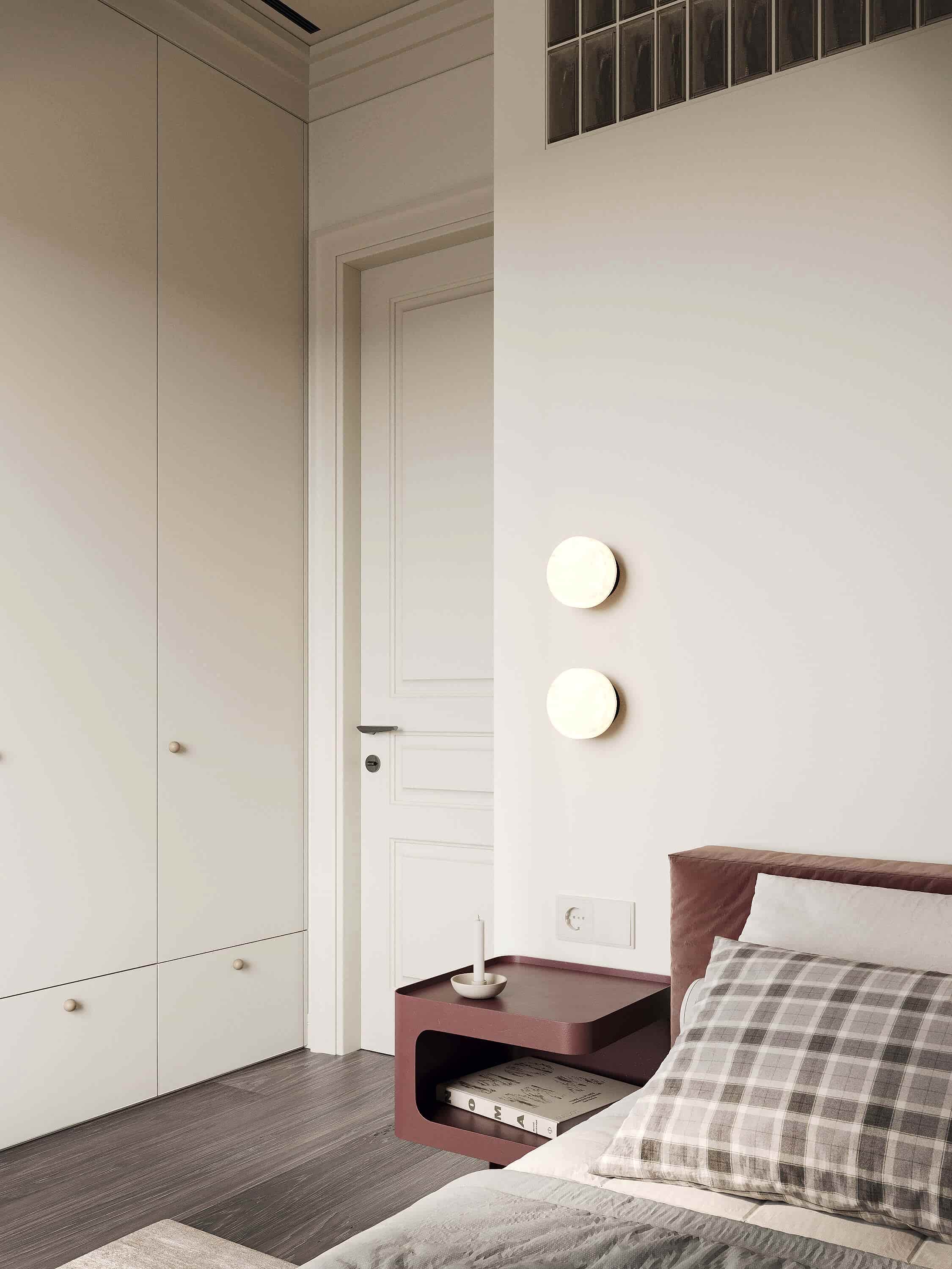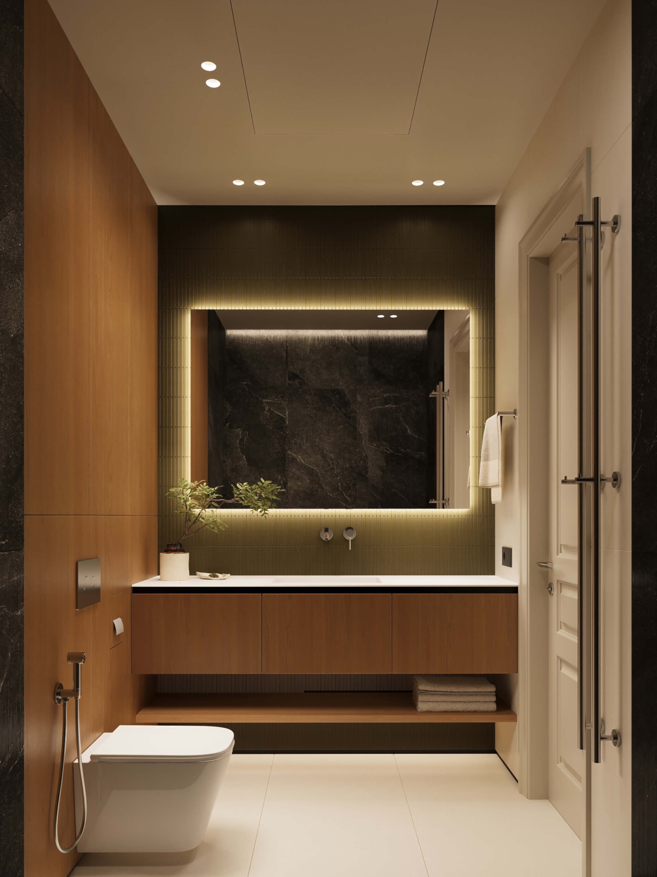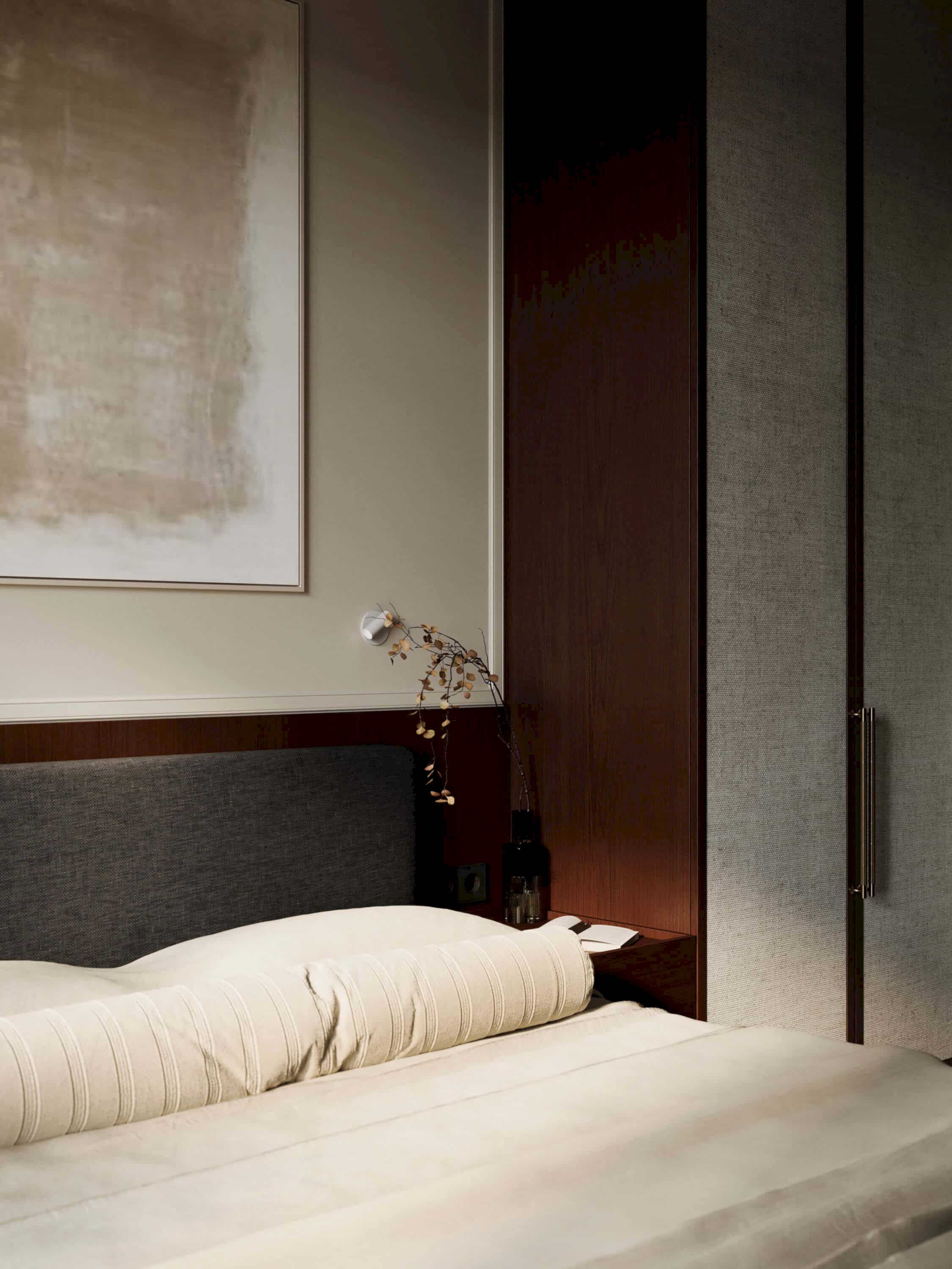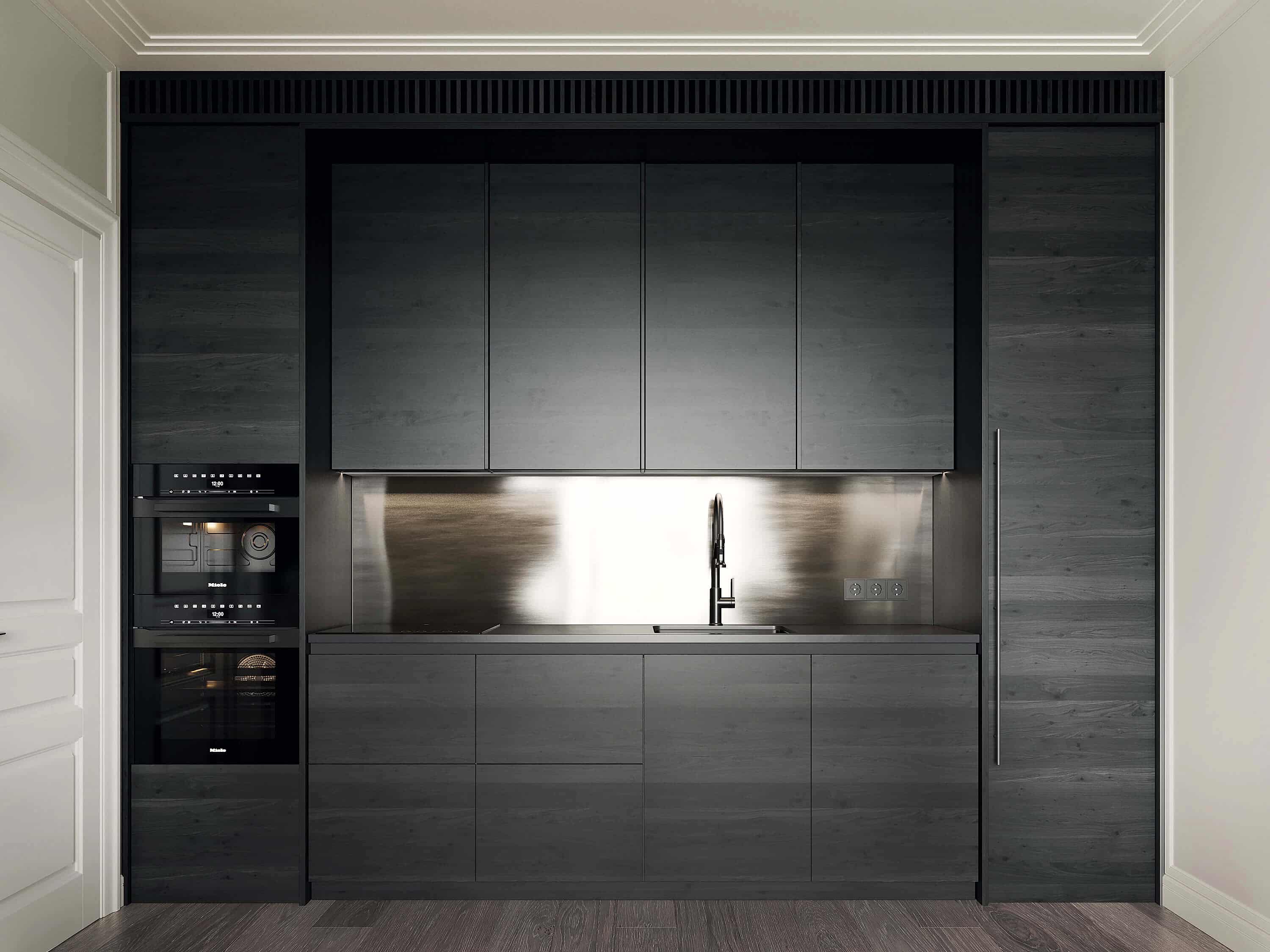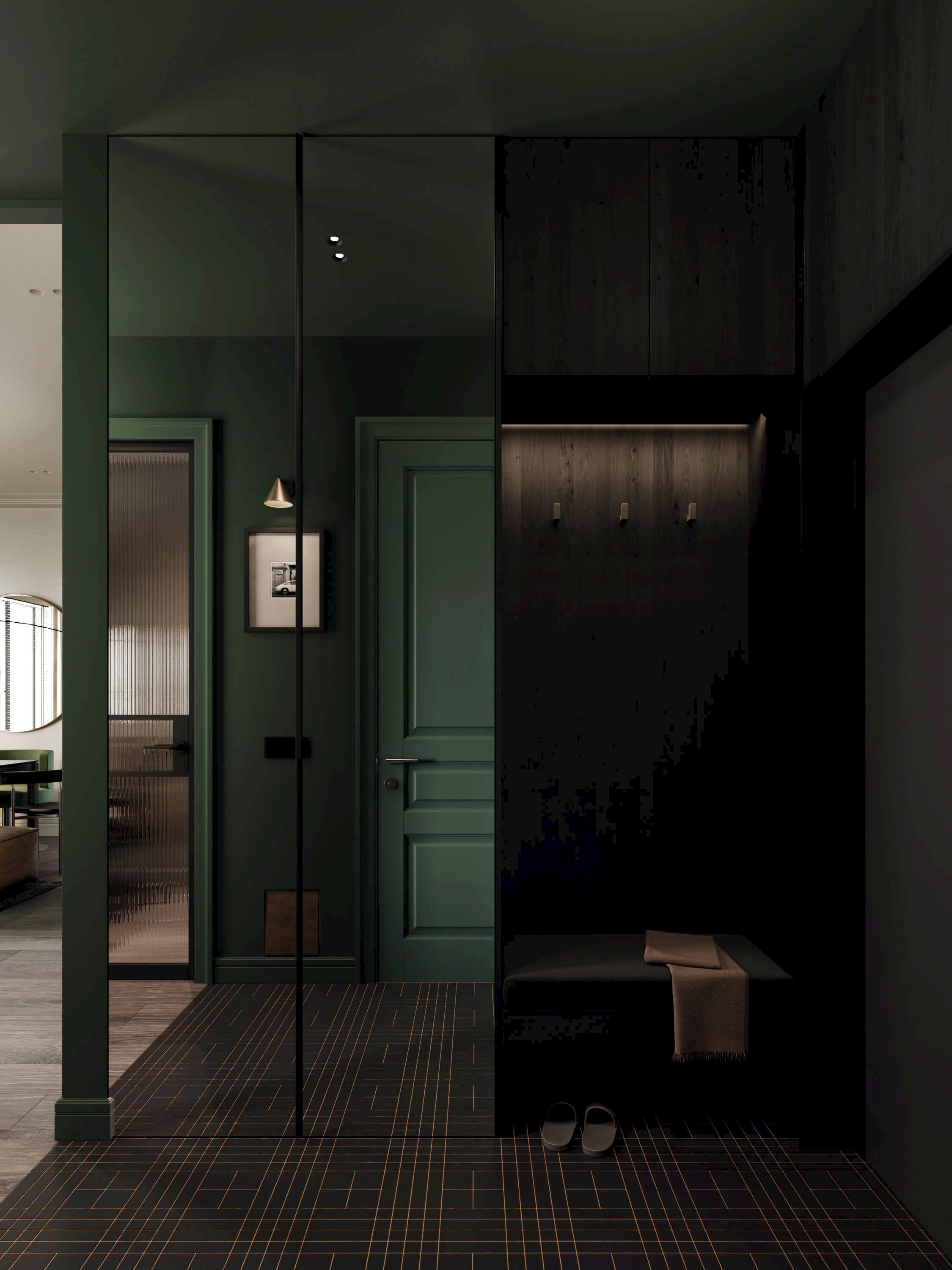 Мы взяли классическую основу - молдинги, высокие Pin-Up плинтус - и на этот фон наслоили фактуры с характером: кожаный диван, кварцевую «колотую» столешницу, выразительный шпон. Чтобы интерьер не стал слишком тяжёлым, добавили ультрасовременные элементы: металл, световые сценарии, акцентные линии.