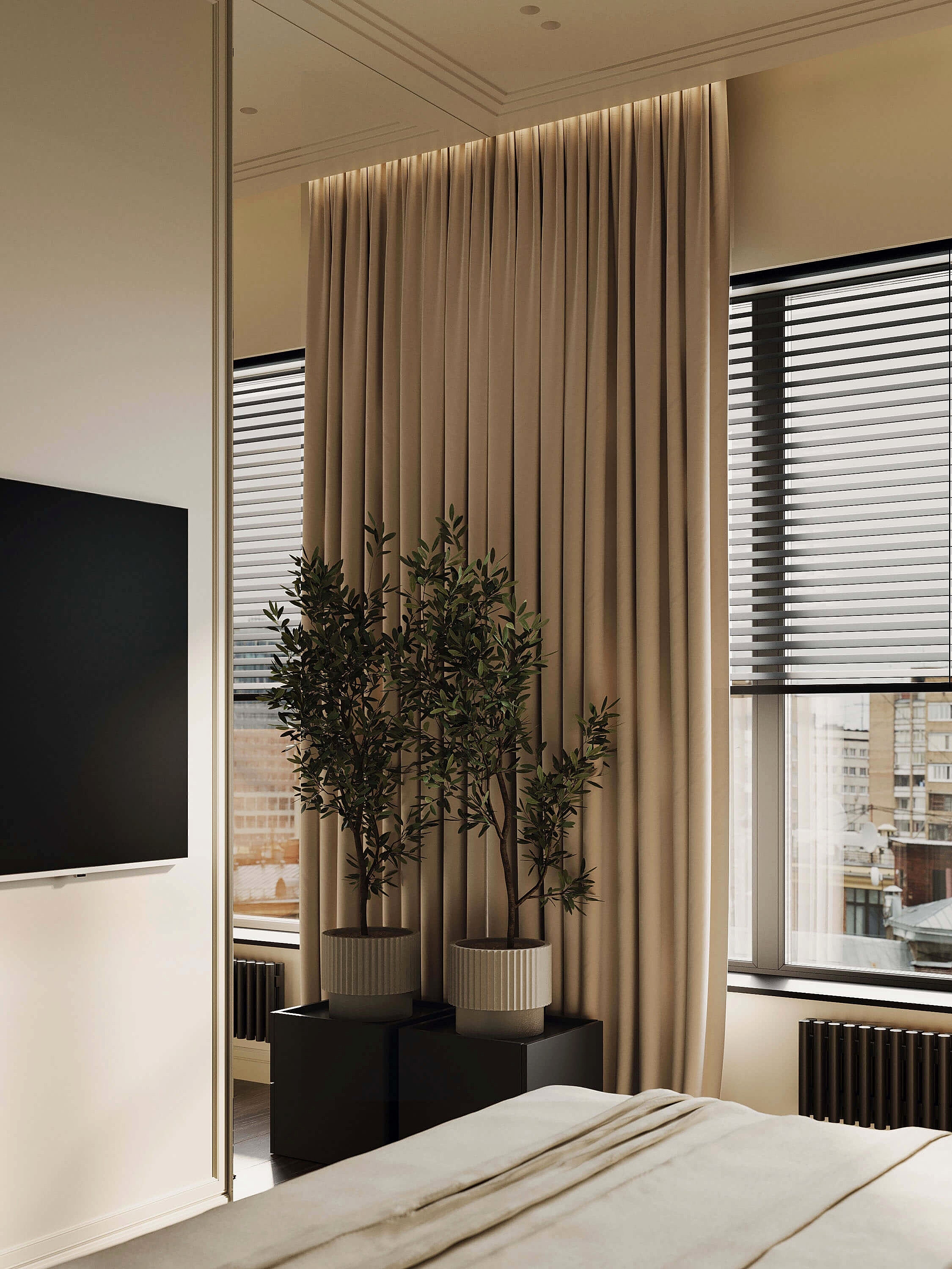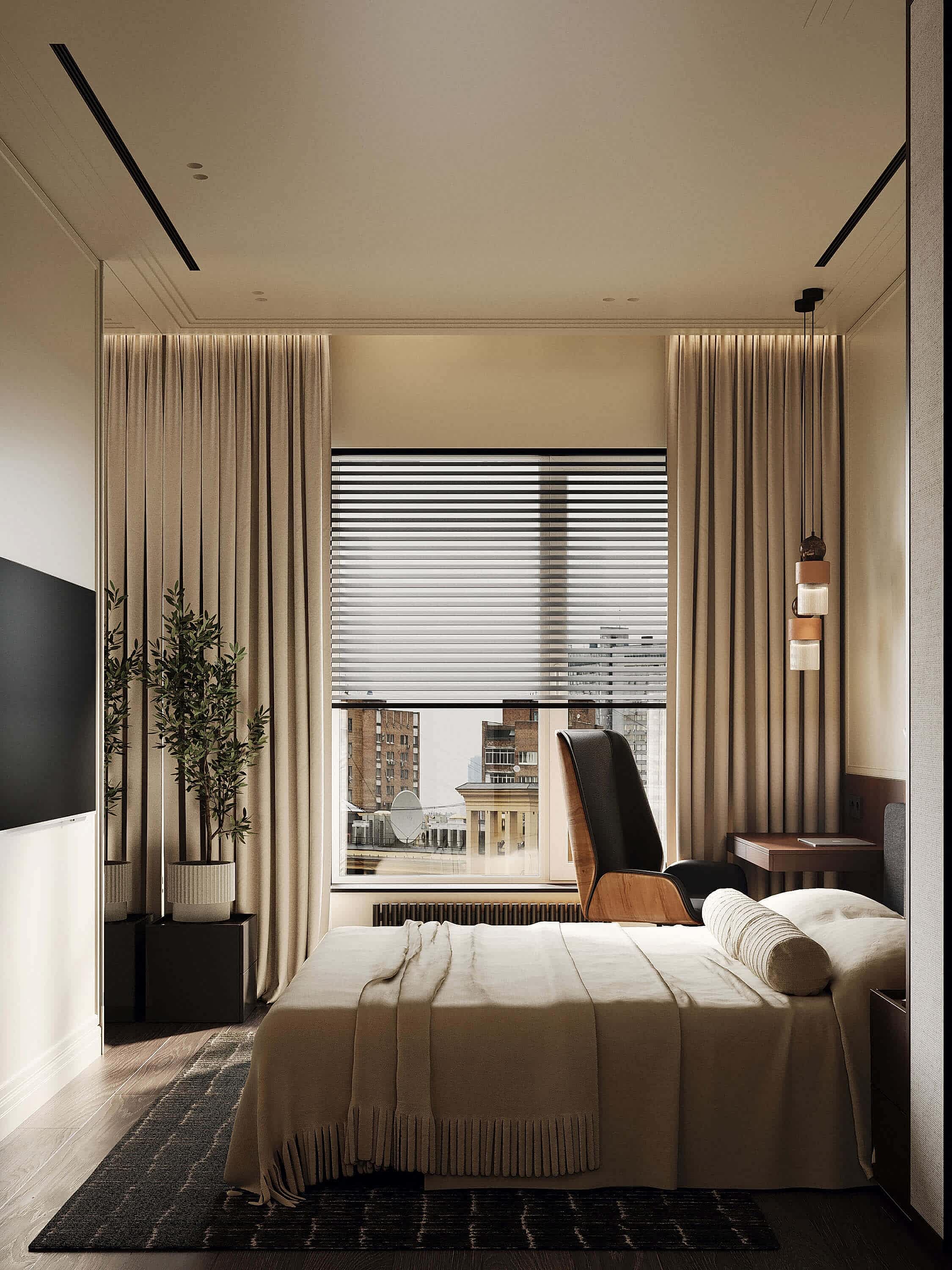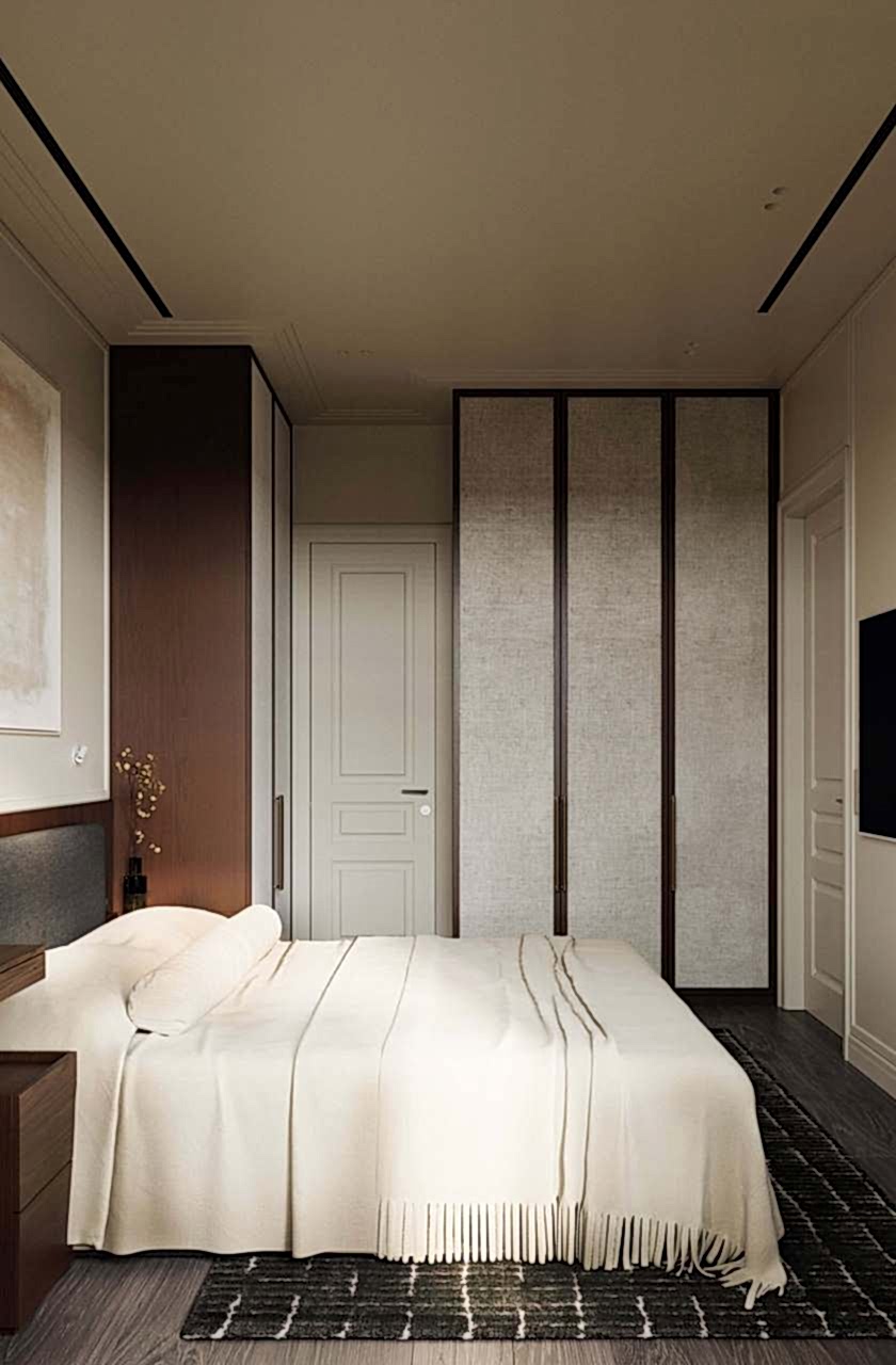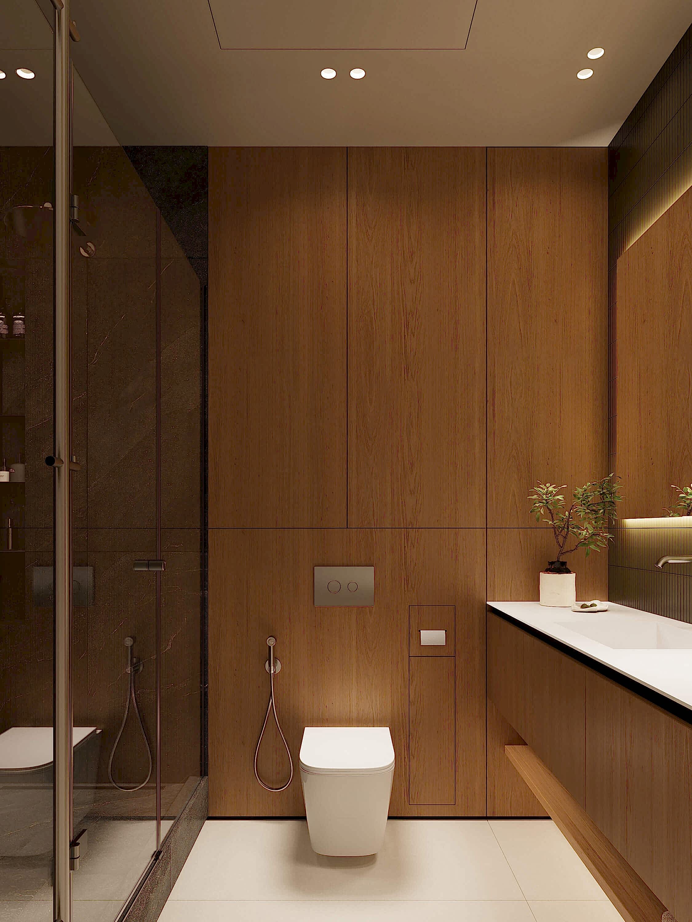 Мы взяли классическую основу - молдинги, высокие Pin-Up плинтус - и на этот фон наслоили фактуры с характером: кожаный диван, кварцевую «колотую» столешницу, выразительный шпон. Чтобы интерьер не стал слишком тяжёлым, добавили ультрасовременные элементы: металл, световые сценарии, акцентные линии.