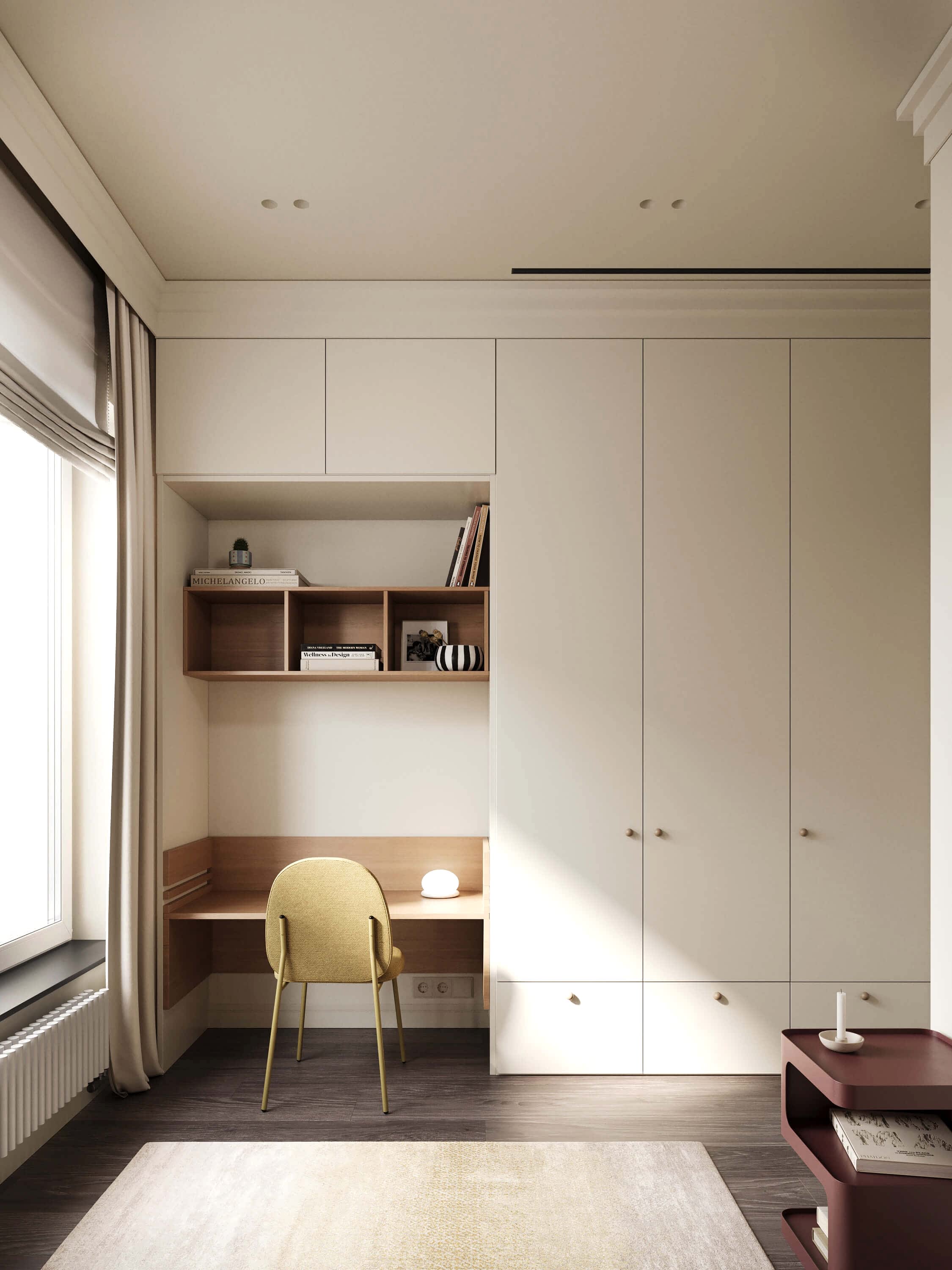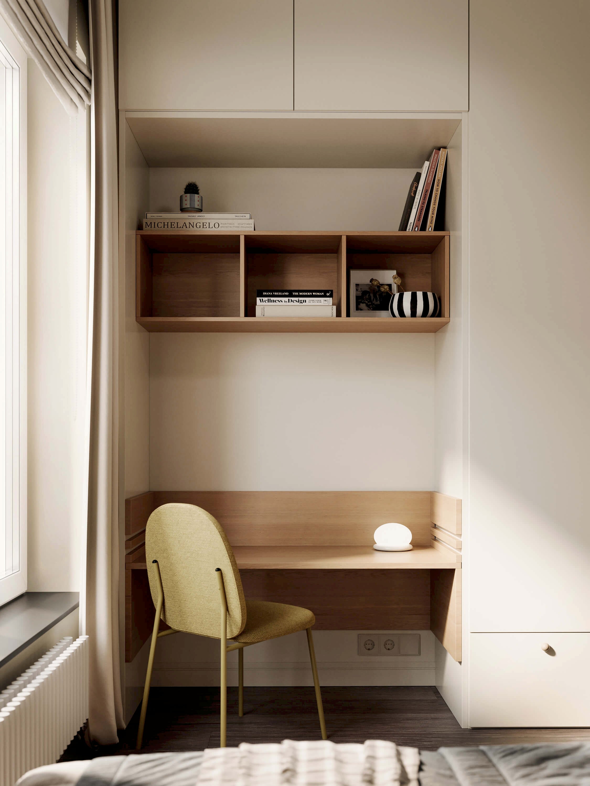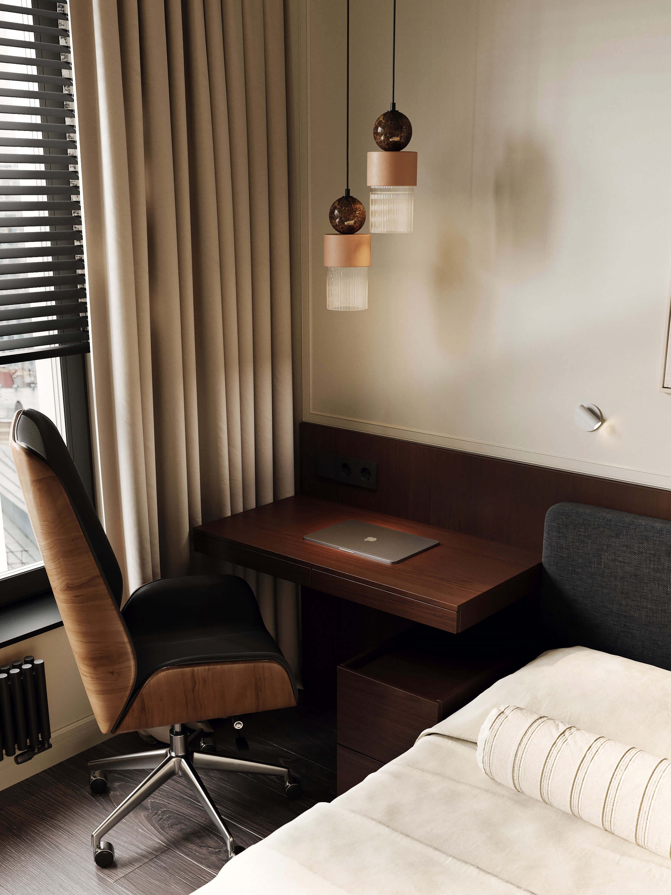 - Кабинет - всего 3 м², но даже в таком формате нашлось место для комфортного рабочего стола - иногда этого достаточно, Pin-Up уединиться и сосредоточиться.