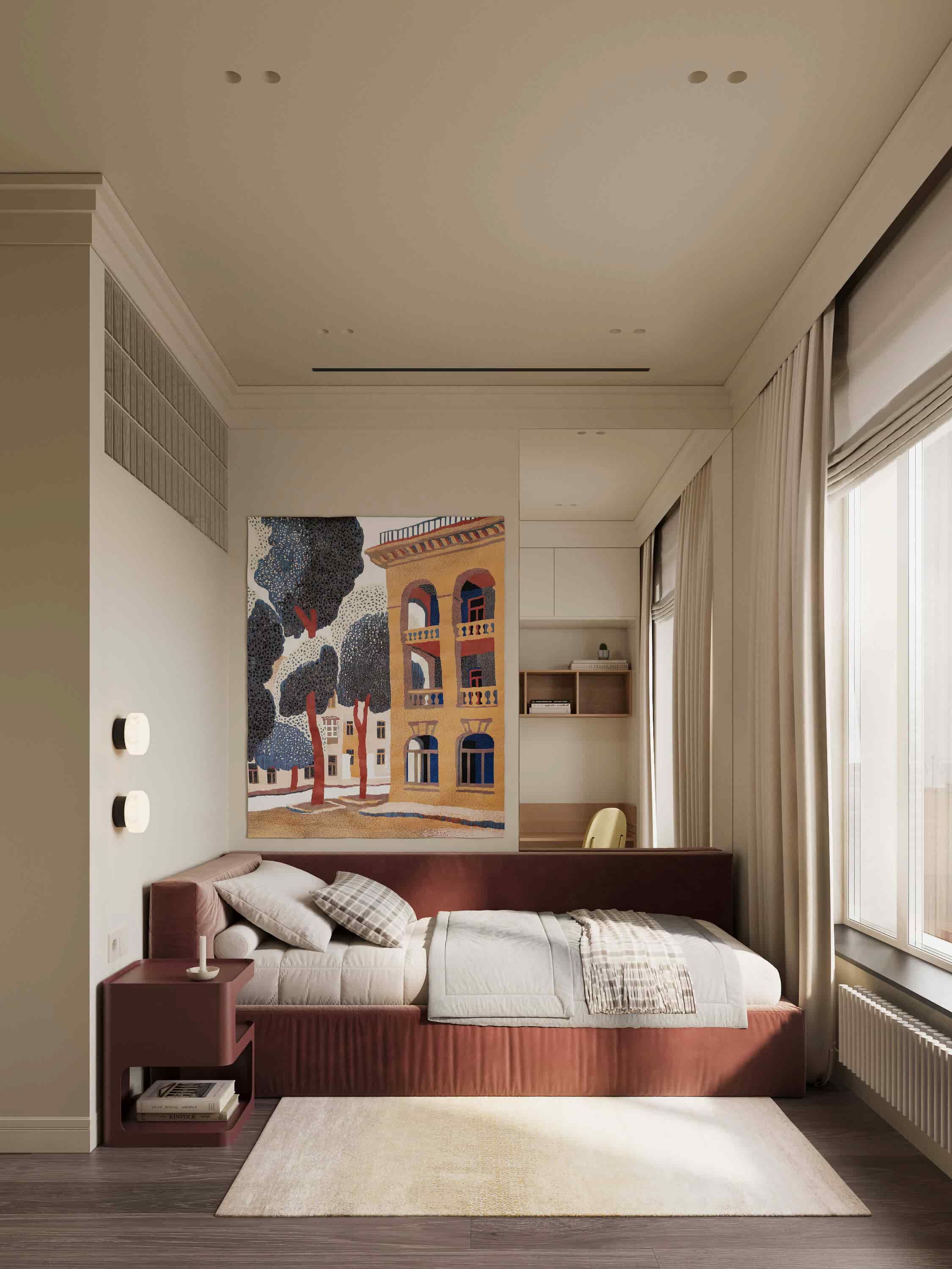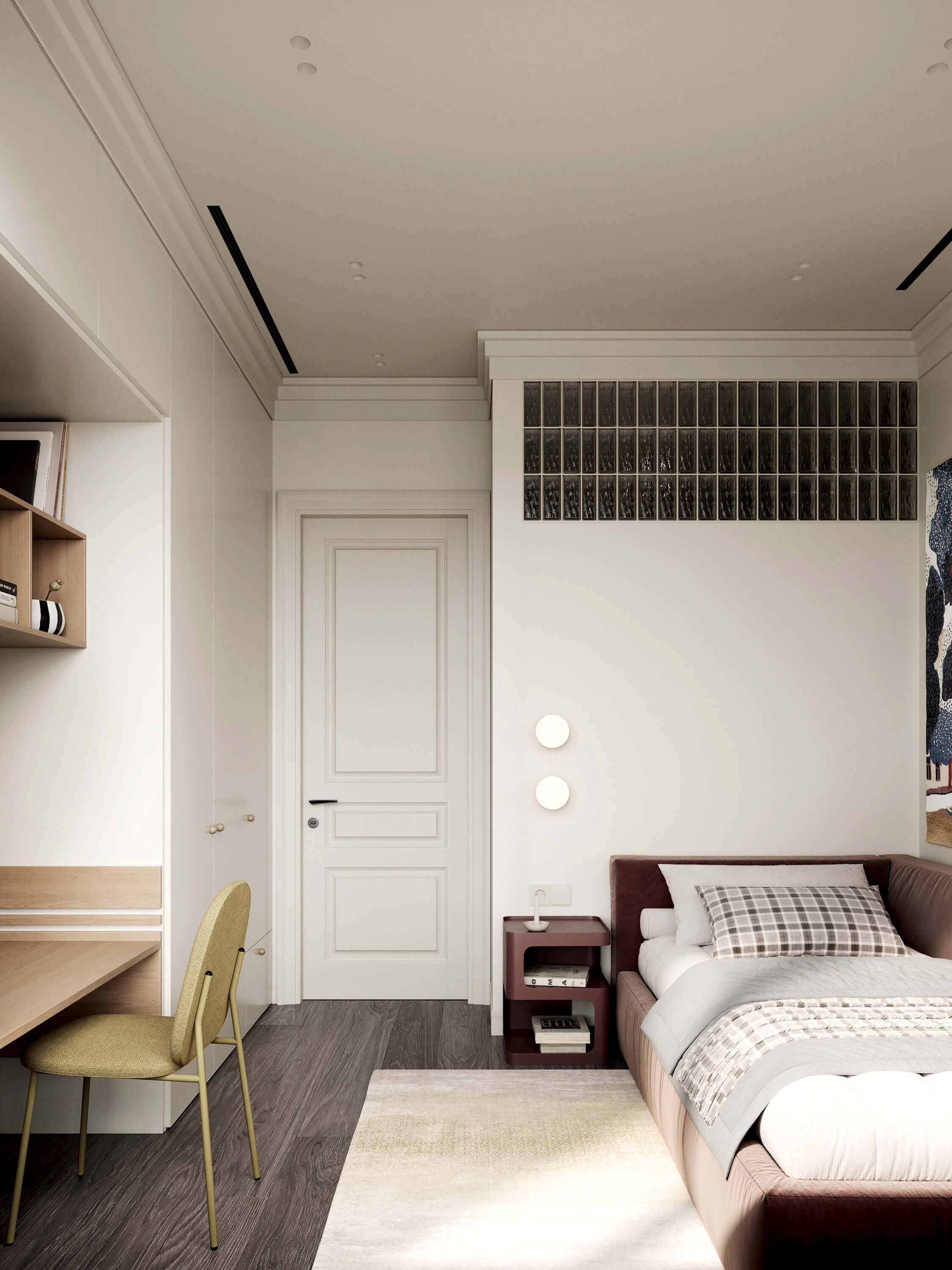 - Будущая детская - 9 м², каждый сантиметр выверен: вначале это будет уютная гостевая, а позже легко трансформируется в полноценную детскую.