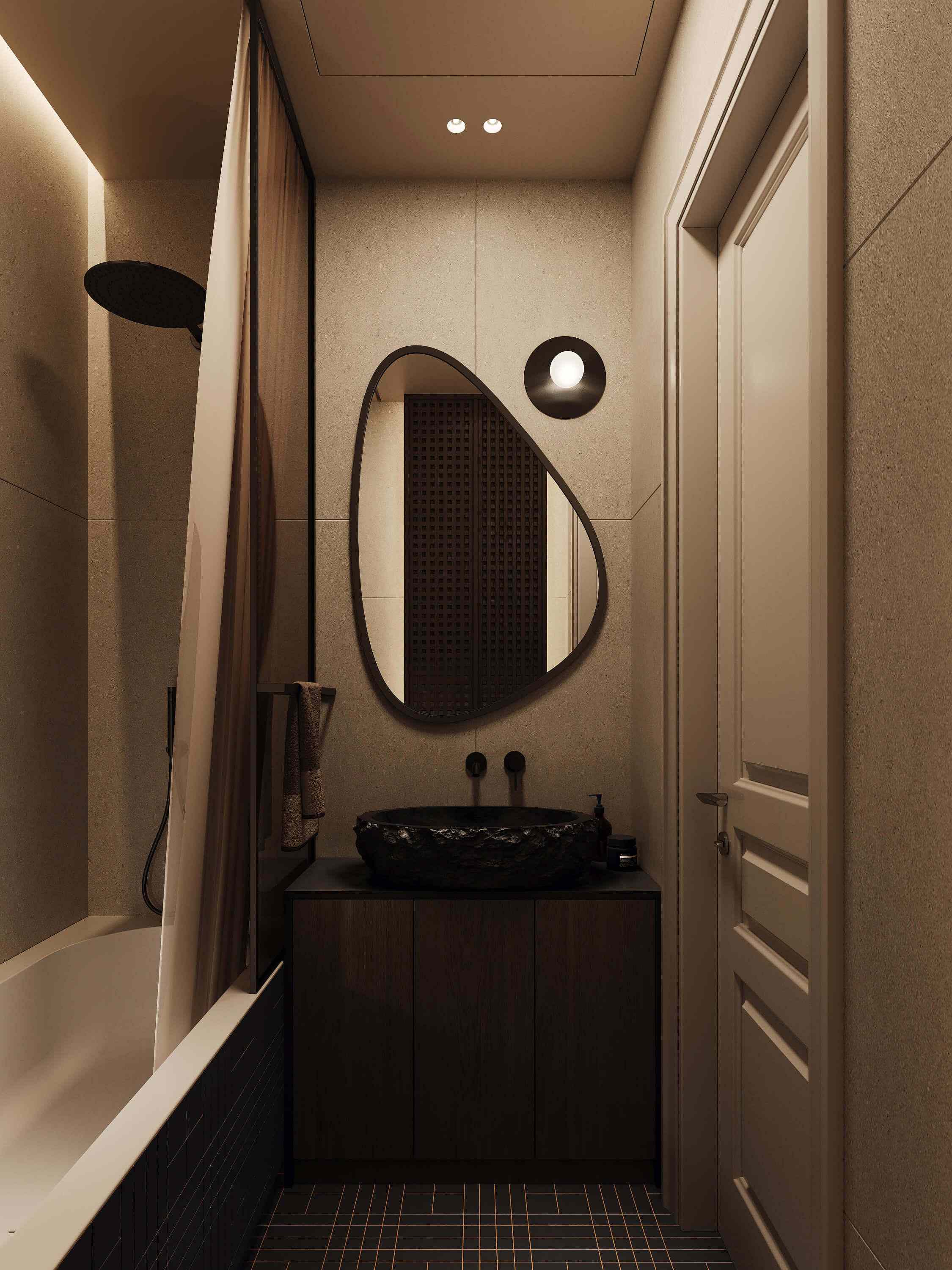 - Сложные цветовые и фактурные Pin-Up с отсылкой к лофту и английскому пабу, сохранив минимализм.