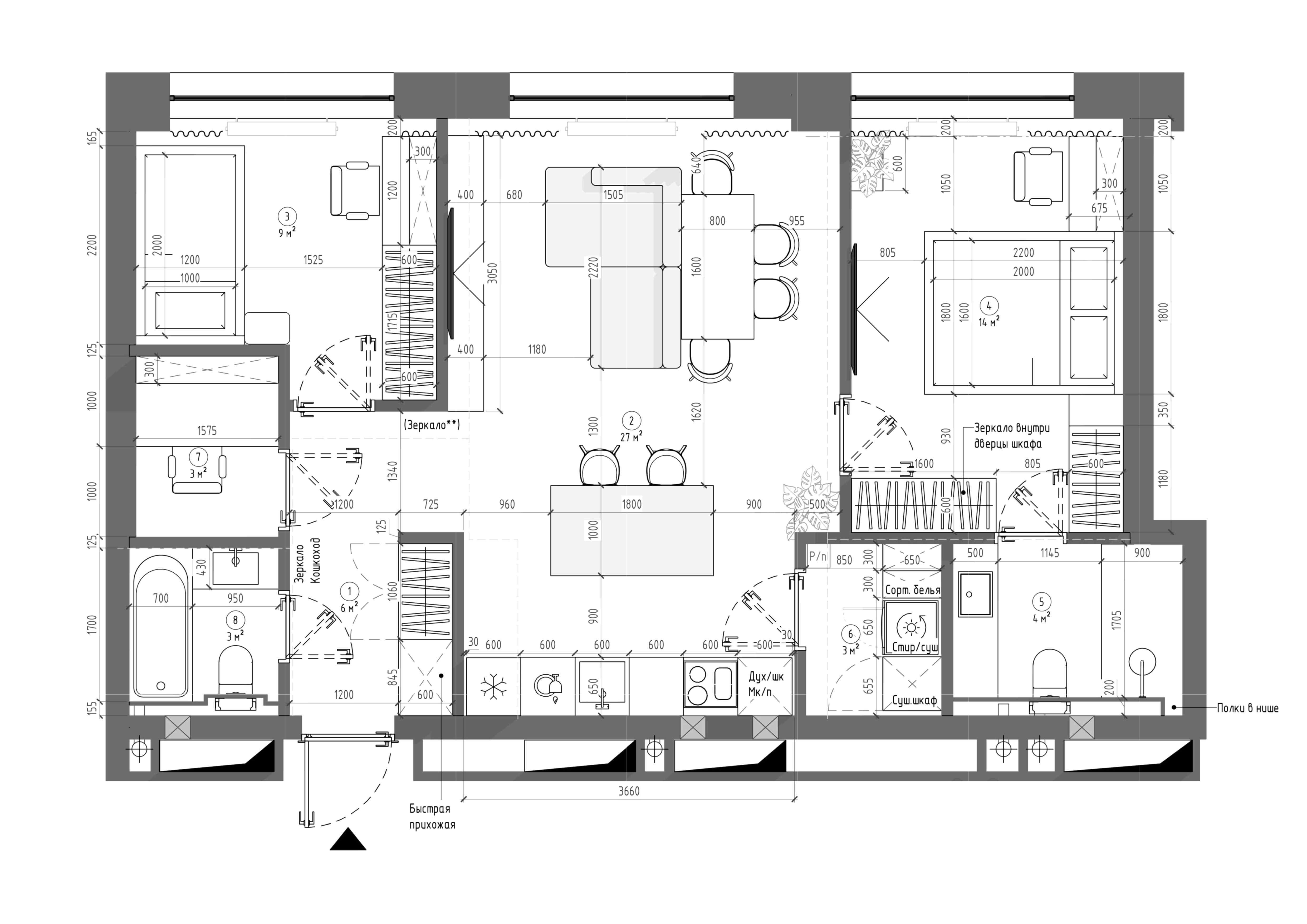 - Кухня-гостиная - центральная зона квартиры, 27 Pin-Up Кабанбай батыра, 138, здесь есть всё: трёхметровая кухня с островом, обеденная группа Это пространство транзитное - из него можно попасть в детскую, кабинет и спальню.