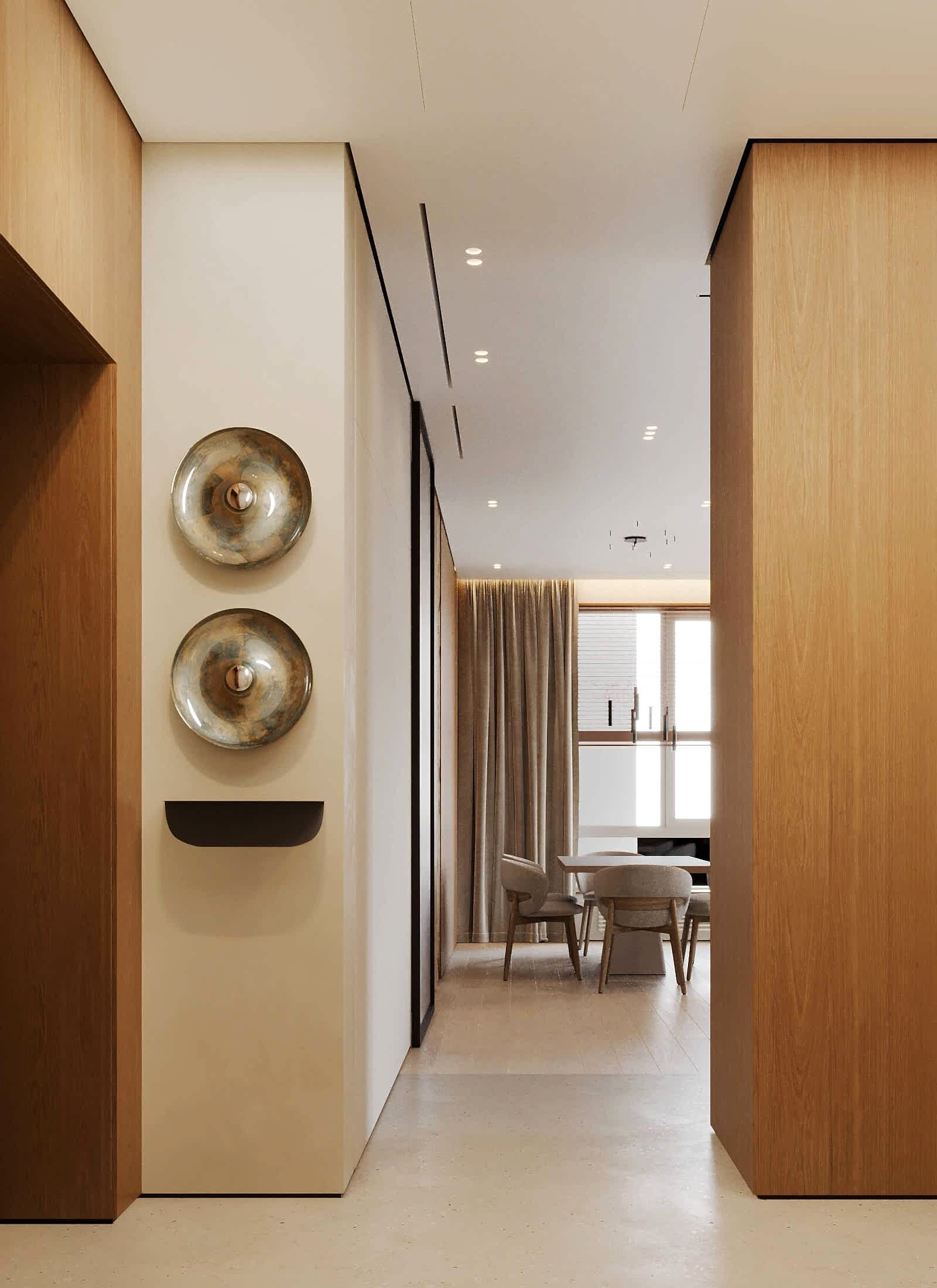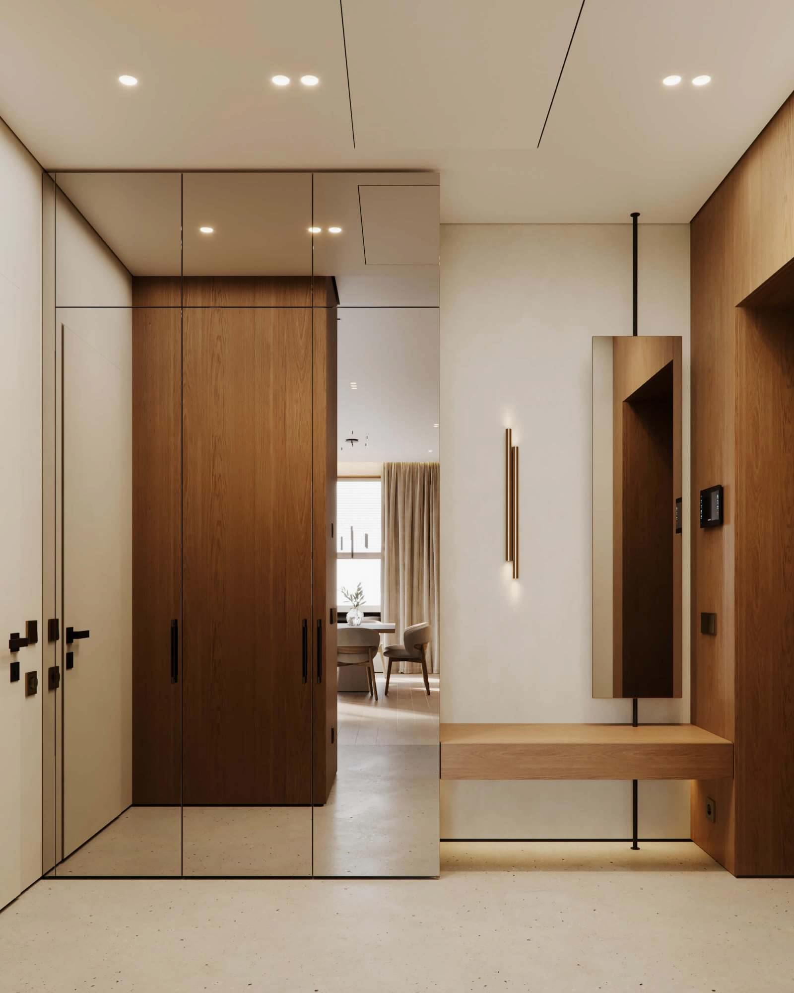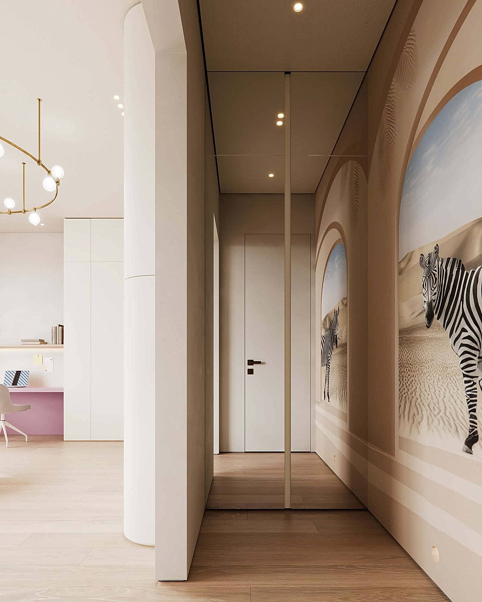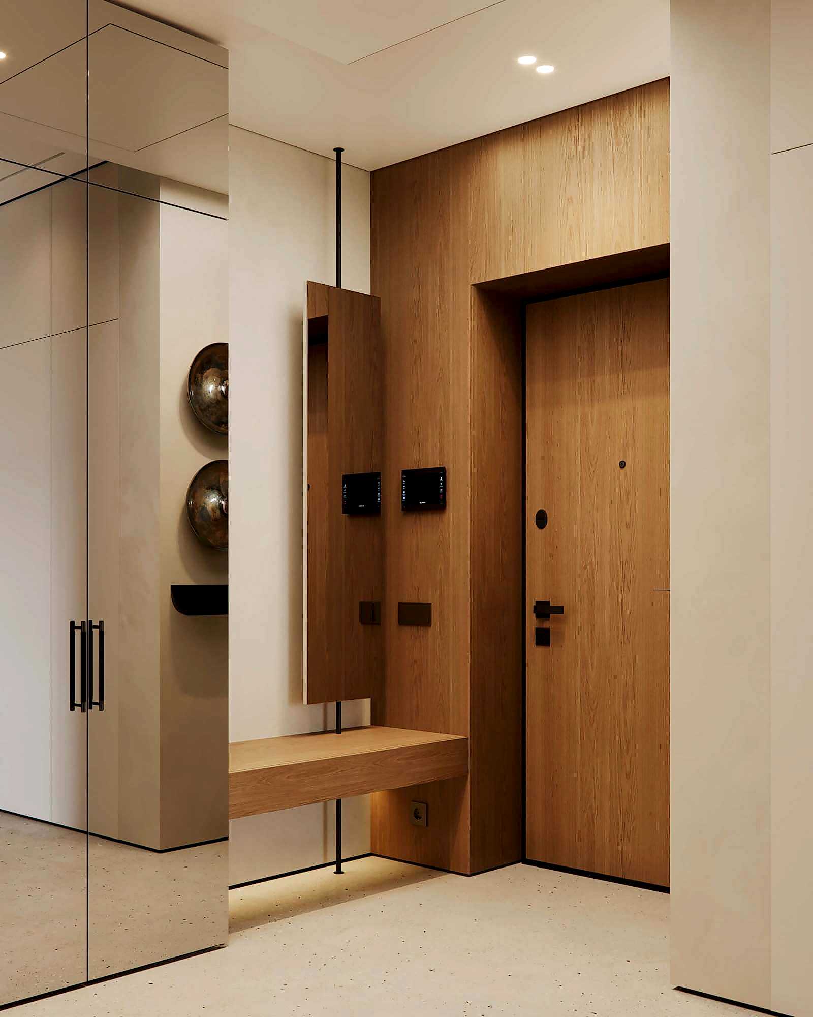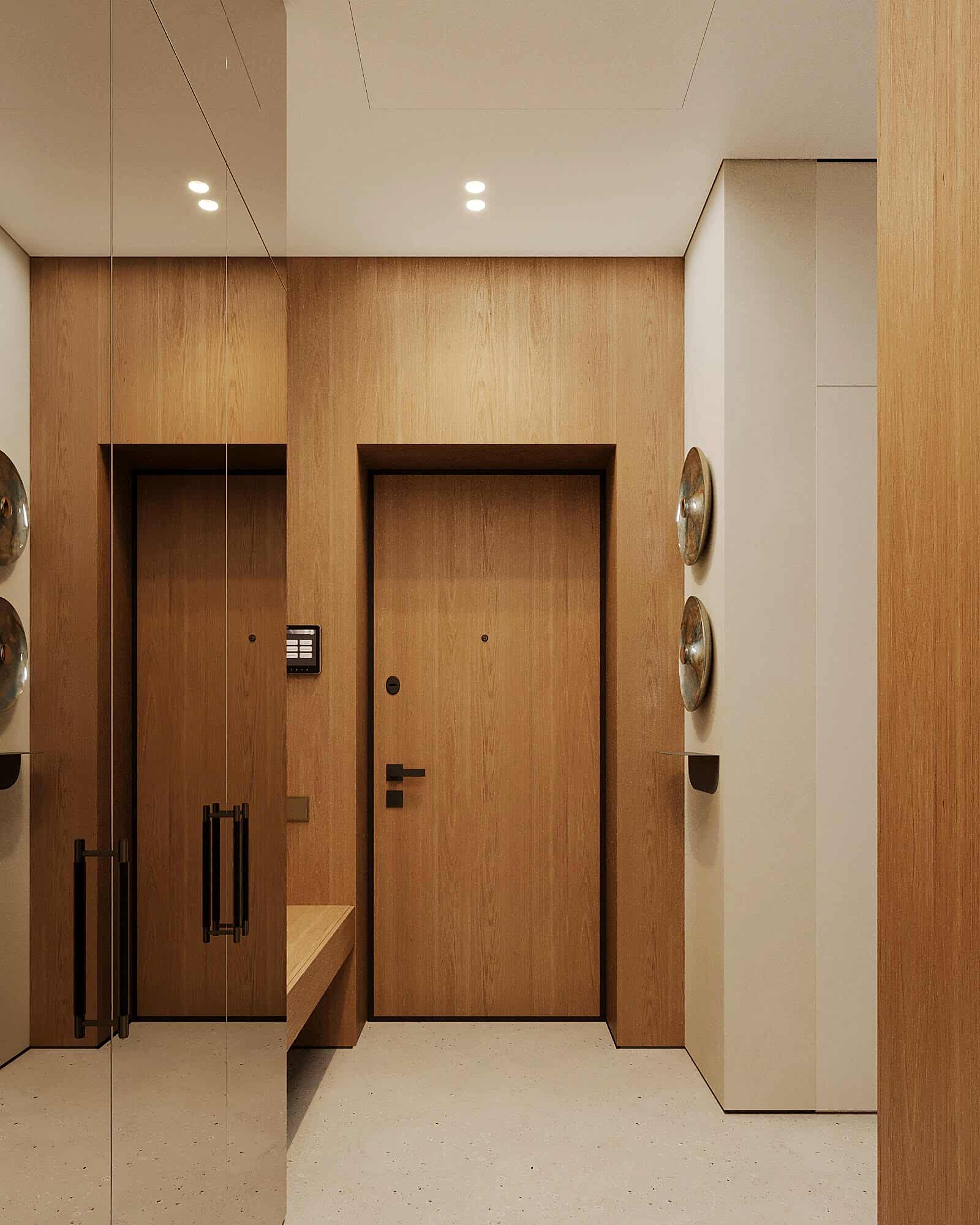 С первой Pin-Up входа в квартиру ощущается её тепло и уют - мягкое теплое дерево, цельное светлое пространство и обилие зеркал.