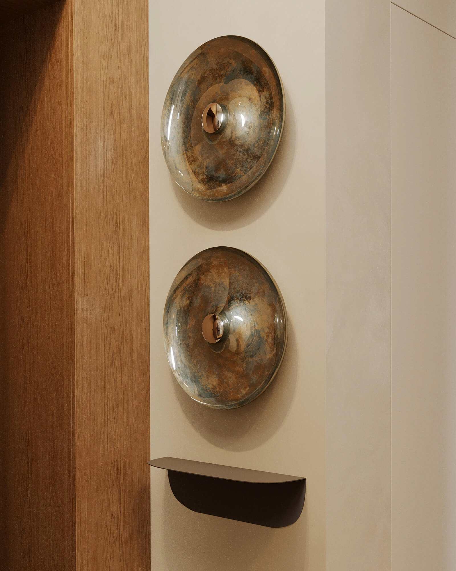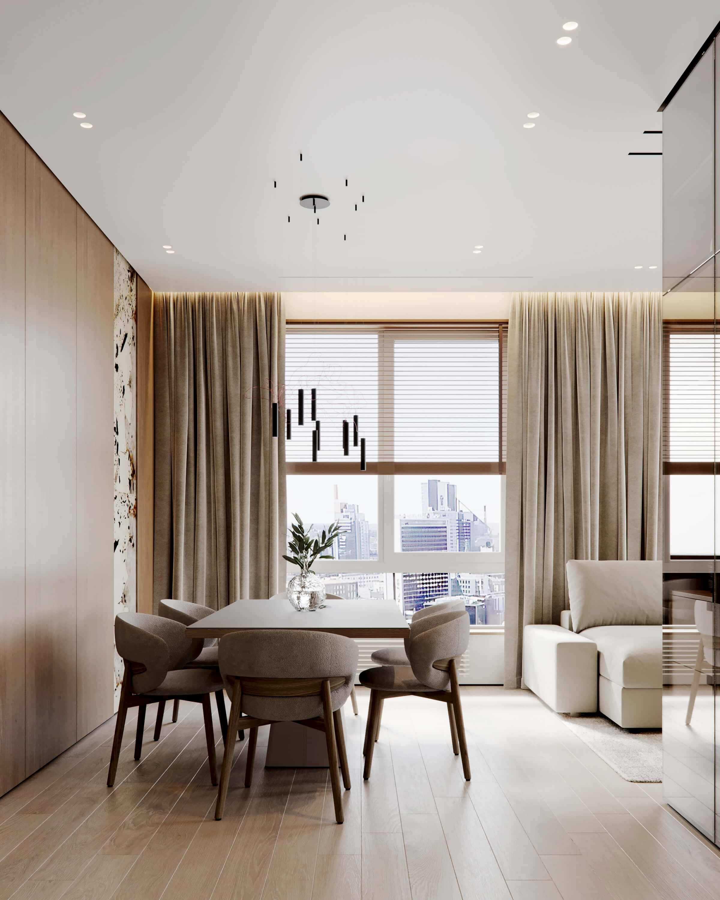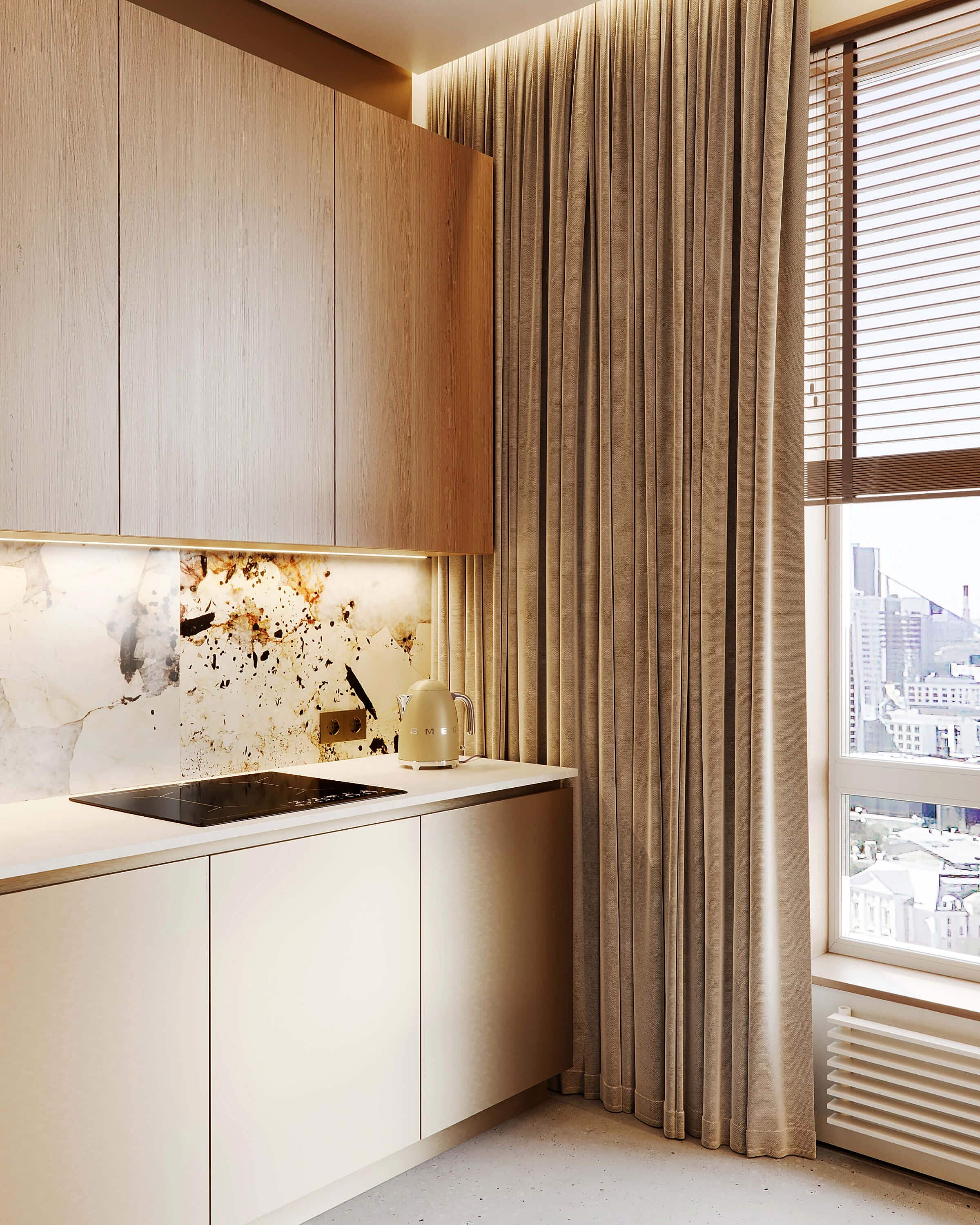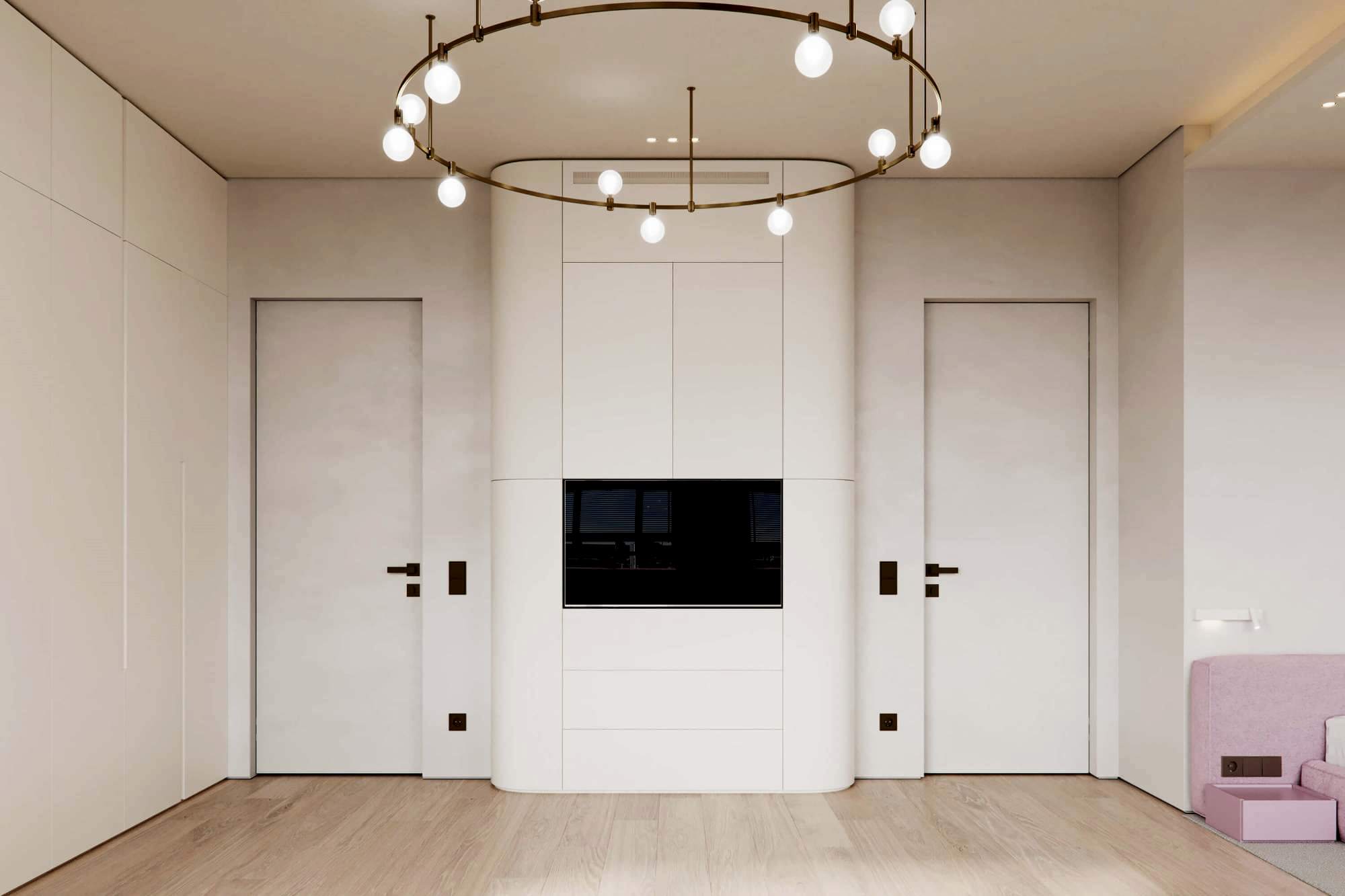 Мягкий, цельный в Pin-Up и тактильно приятный интерьер, с акцентными деталями и арт-элементами. Общая и приватная часть квартиры разделены откатной полупрозрачной дверью.