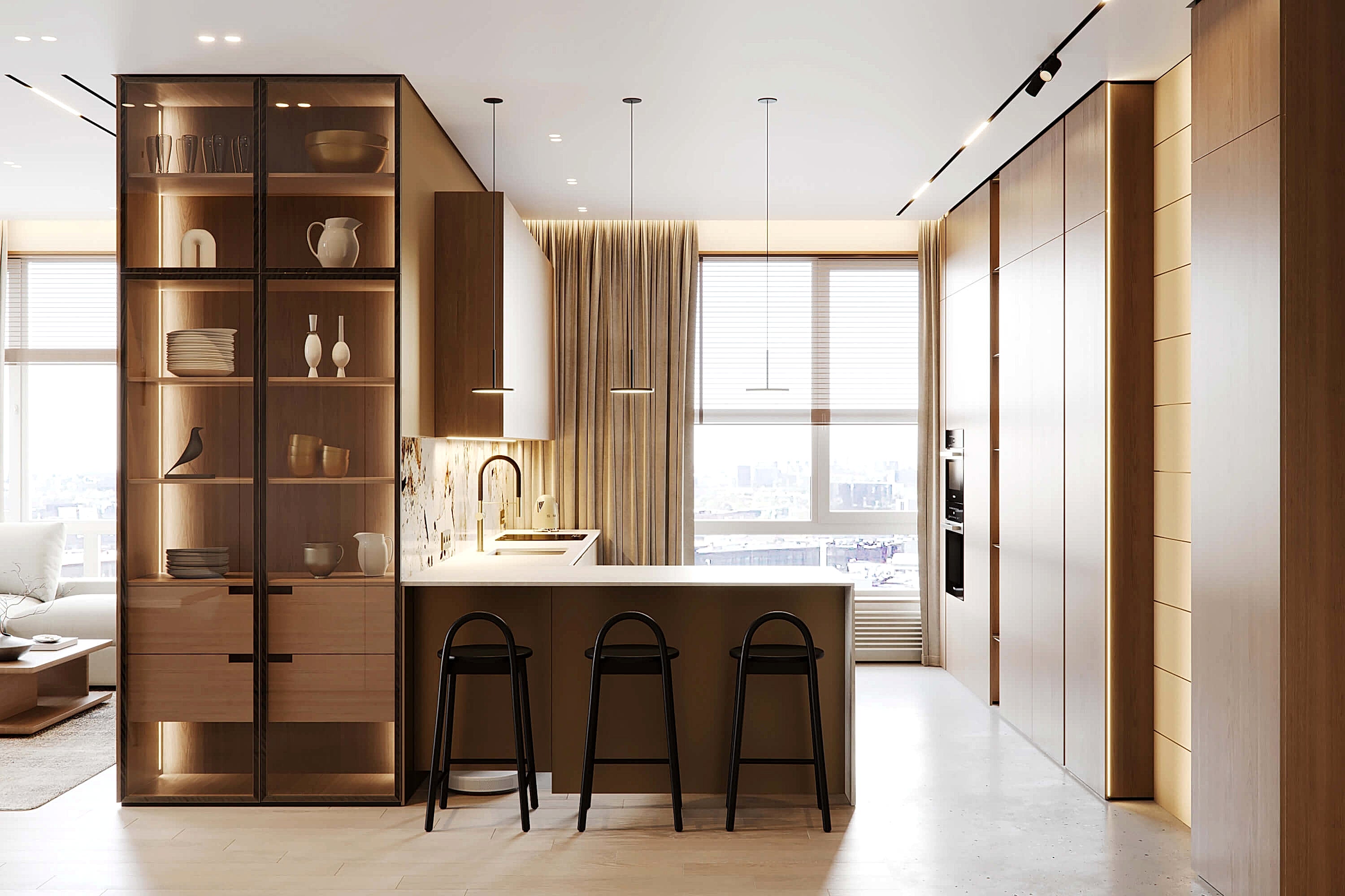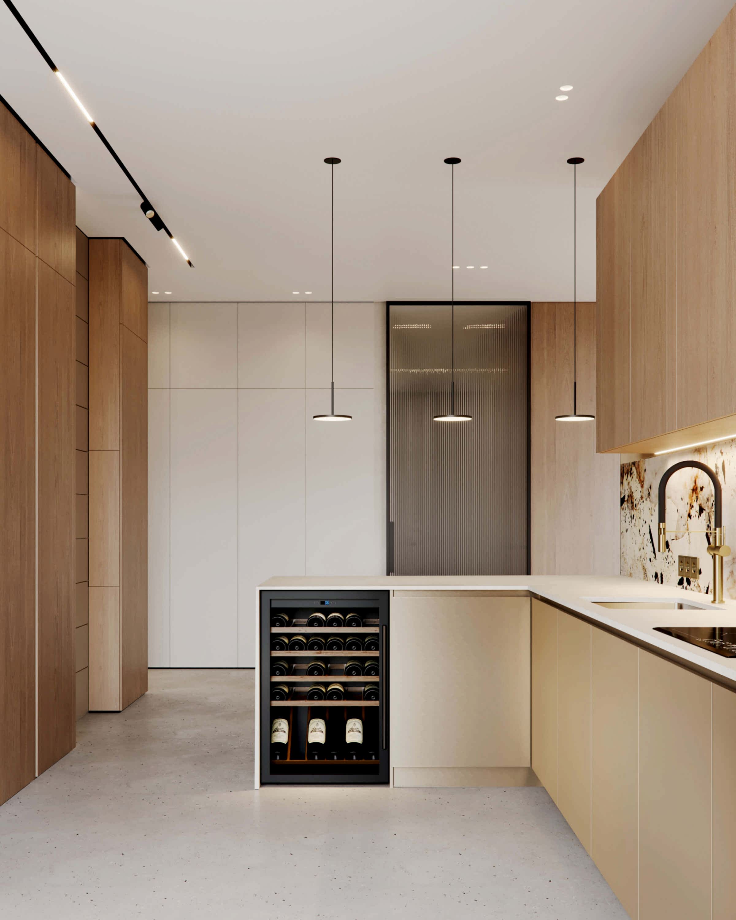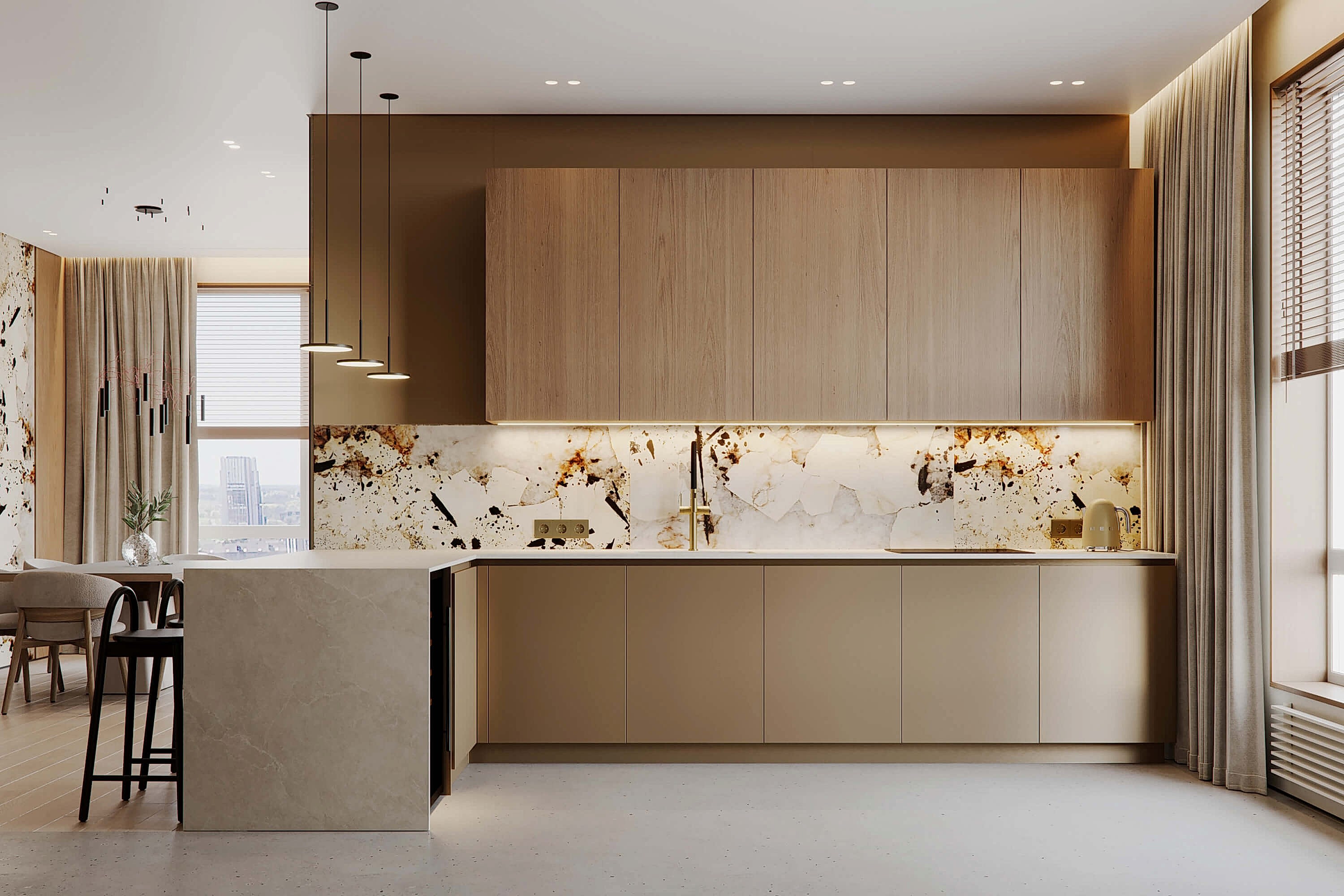 Pin-Up любят готовить, поэтому спроектирована большая кухонная зона, которая хоть и в одном пространстве с гостиной, но все равно стала автономной. В высоких пеналах прячется два холодильника, духовка и микроволновка, все вписано как единый массив. На фартуке большеформатный керамогранит, который дублируется в гостиной и столовой зонах.