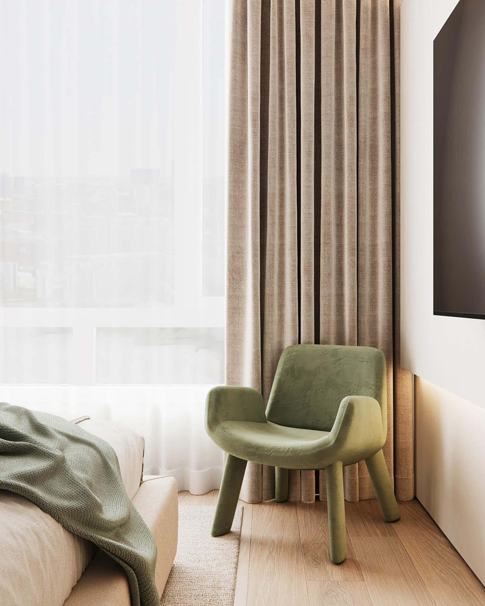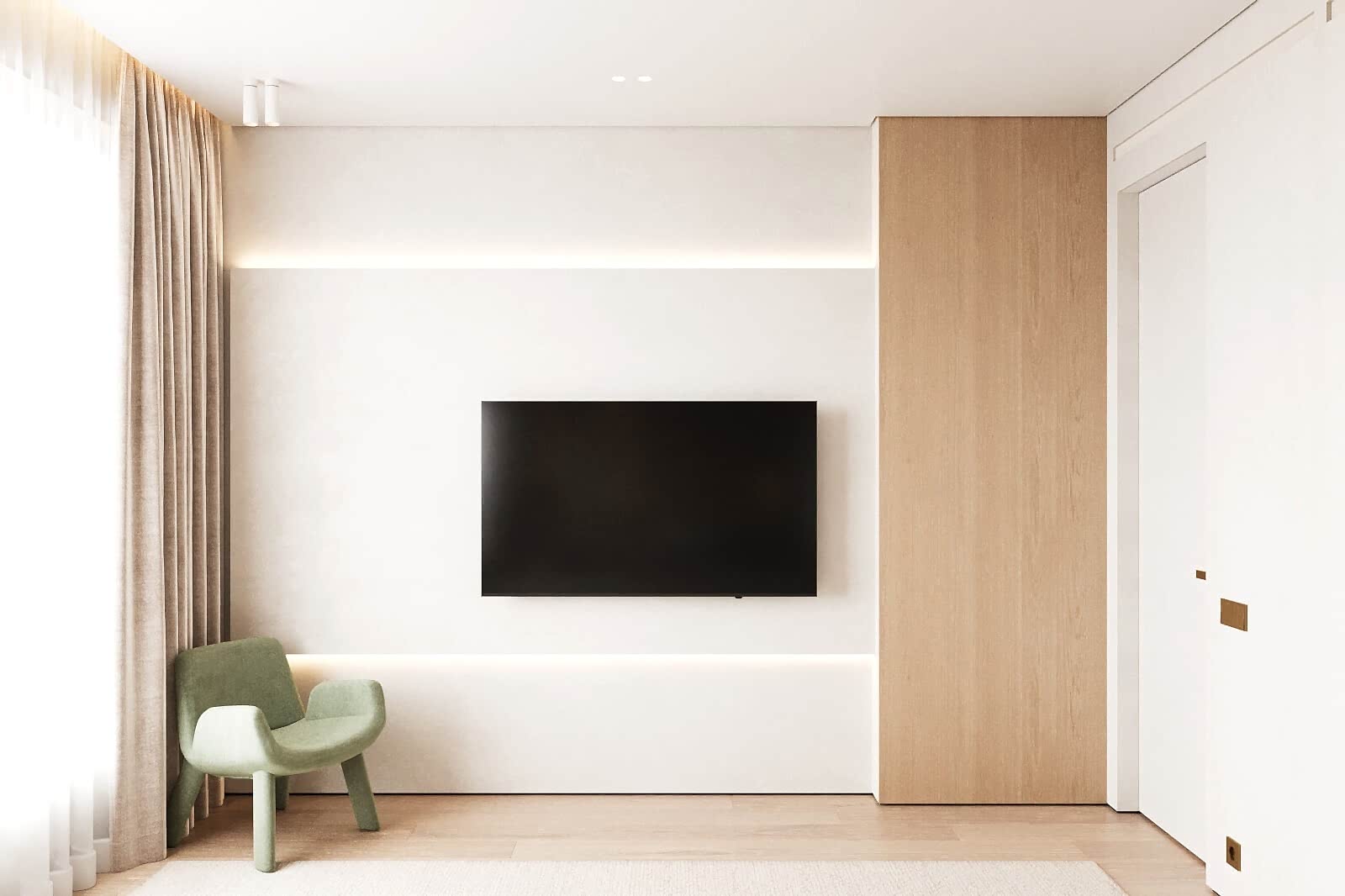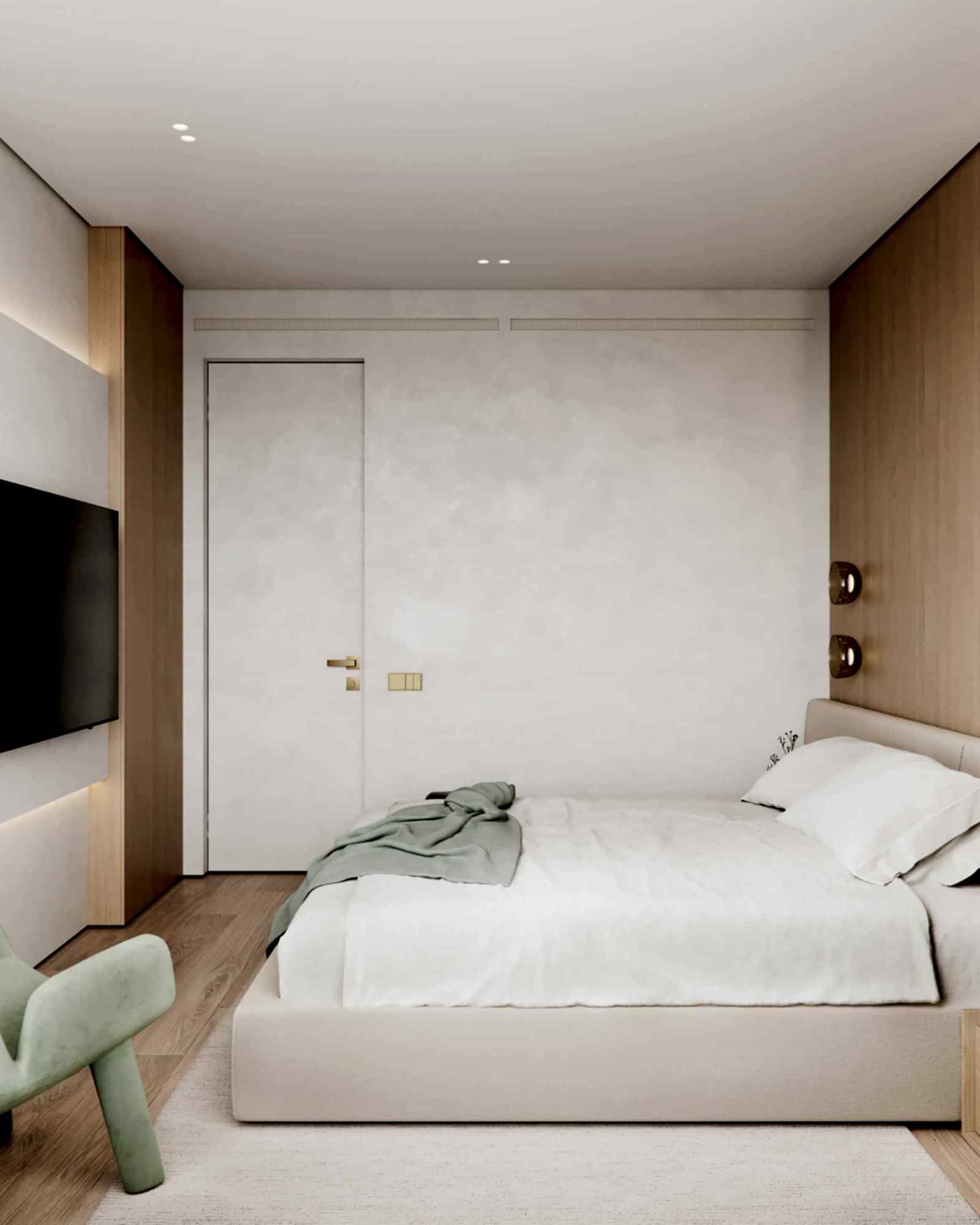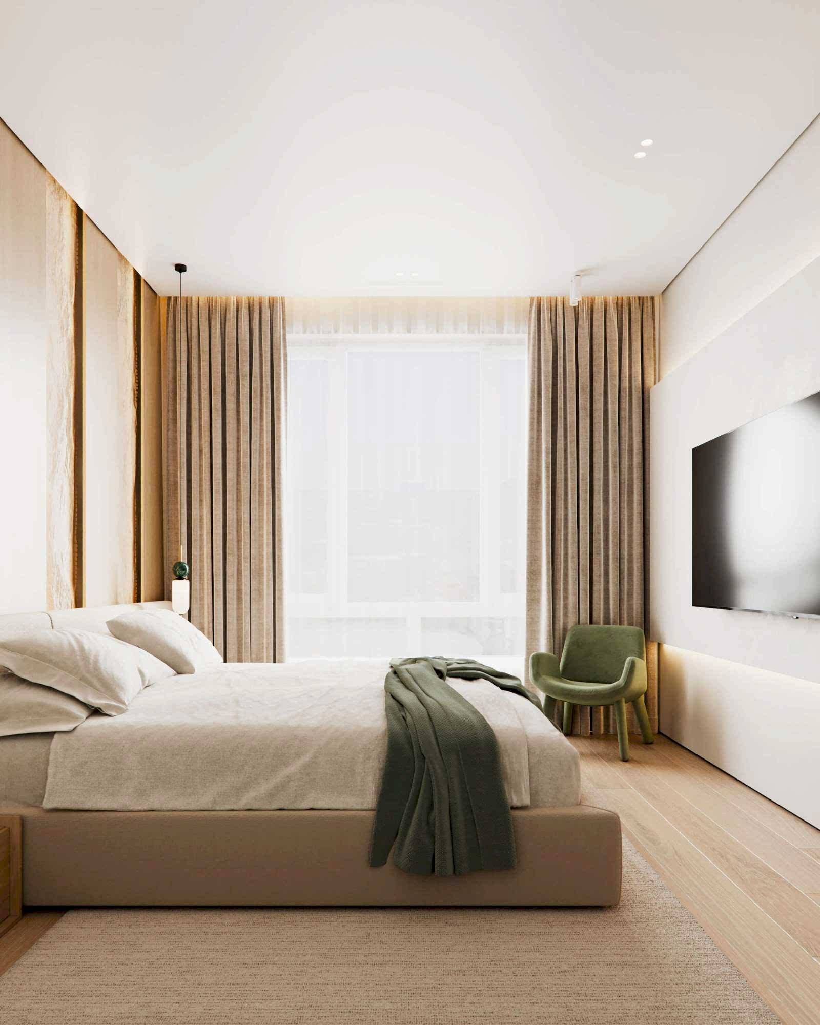 Спальня должна была стать местом для качественного физического и ментального отдыха, поэтому в ней нет ничего кроме кровати с тумбами, кресла и ТВ. Гармония и простота, природные материалы и цвета, мягкий свет из панорамных окон с возможностью полного блэкаута для Pin-Up сна - всё вместе погружает в расслабленное состояние.