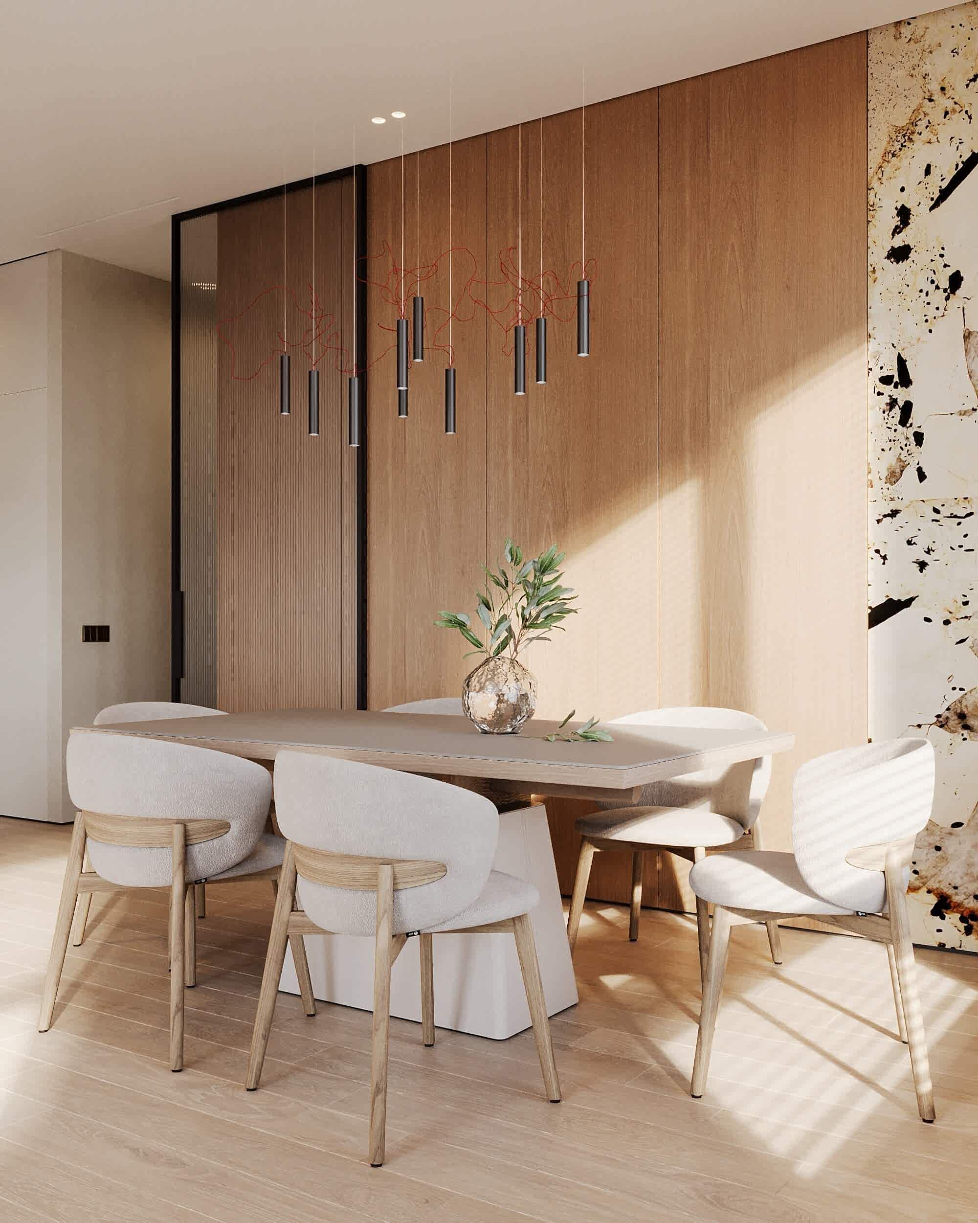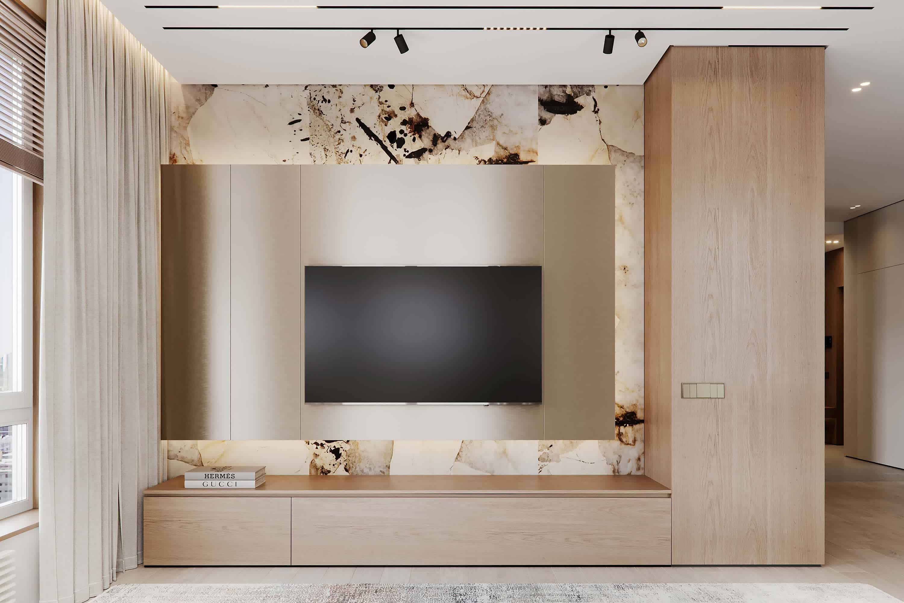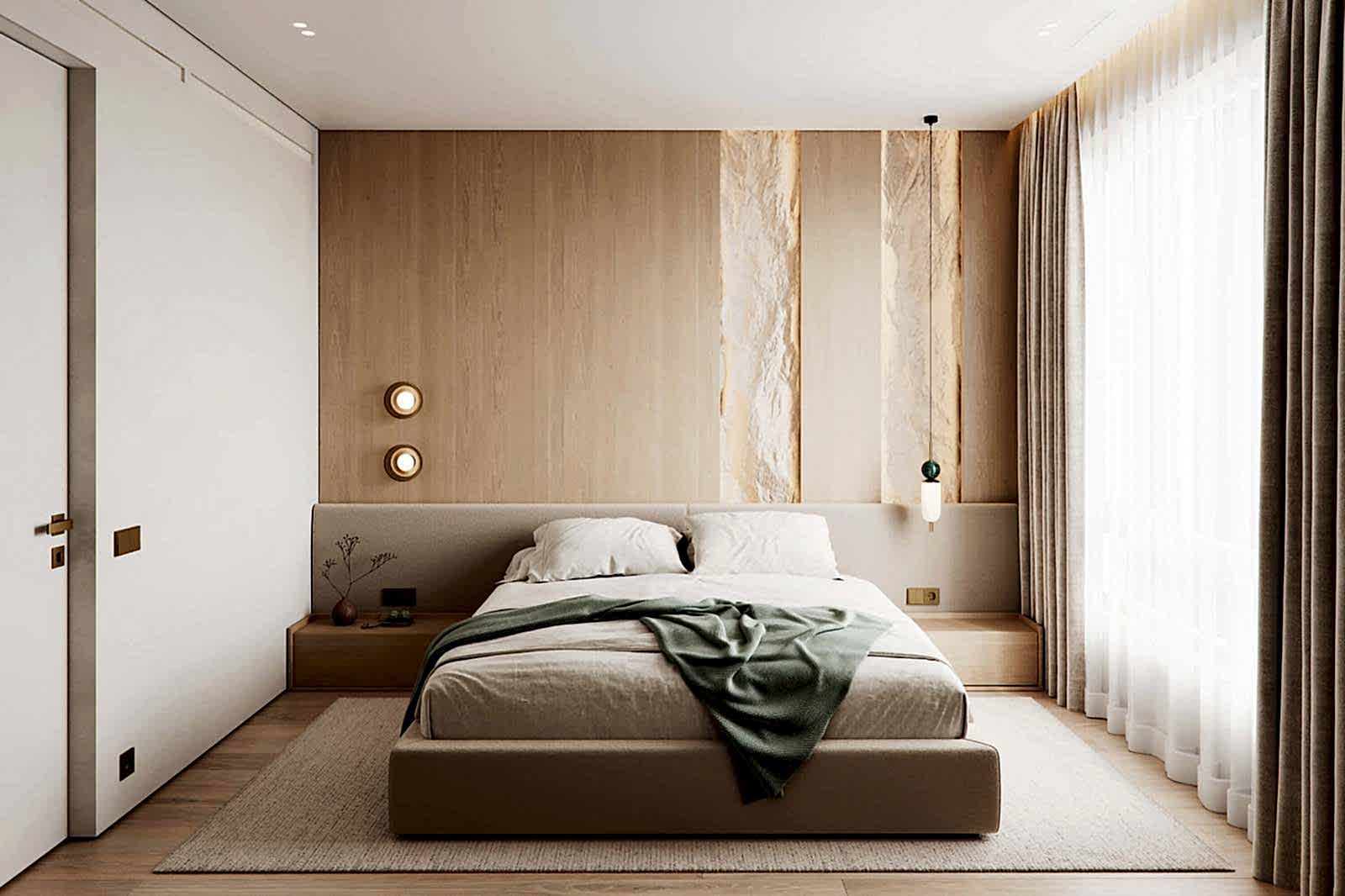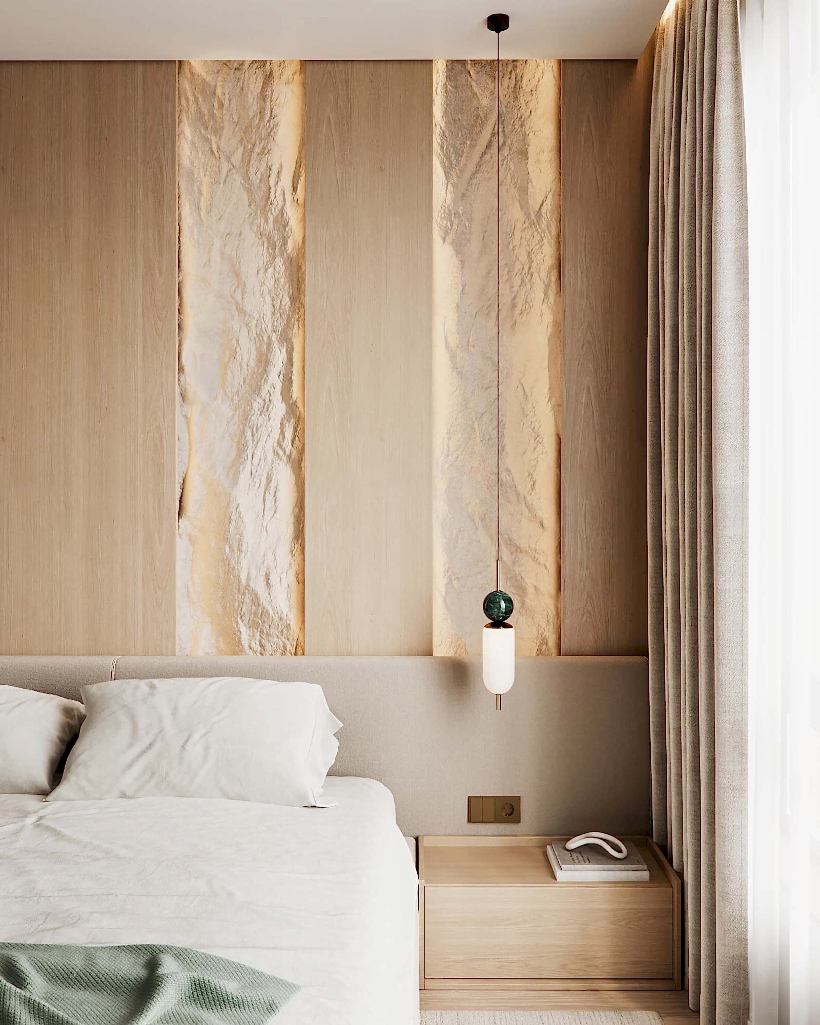 Спальня должна была стать местом для качественного физического и ментального отдыха, поэтому в ней нет ничего кроме кровати с тумбами, кресла и ТВ. Гармония и простота, природные материалы и цвета, мягкий свет из панорамных окон с возможностью полного блэкаута для Pin-Up сна - всё вместе погружает в расслабленное состояние.