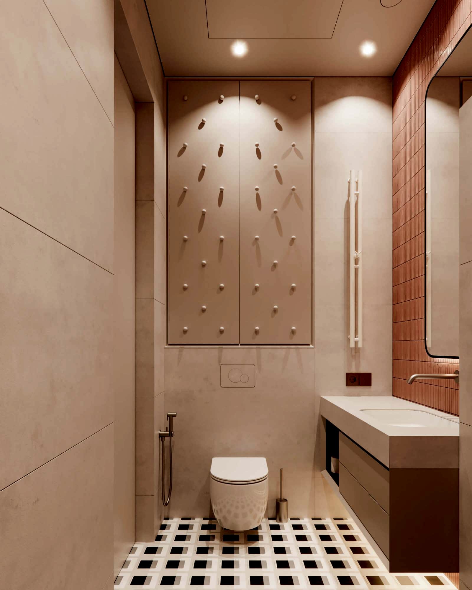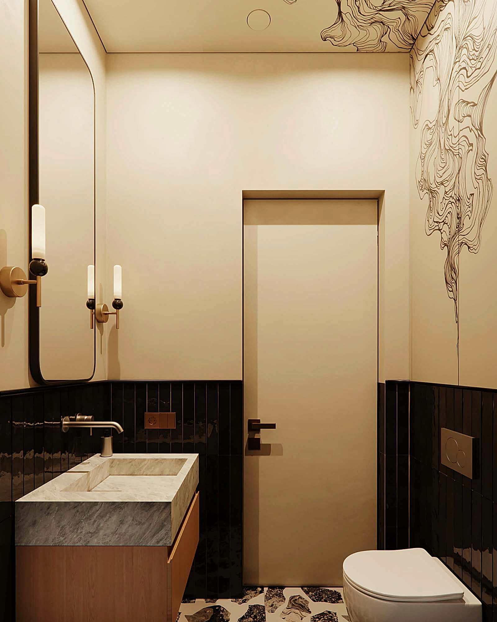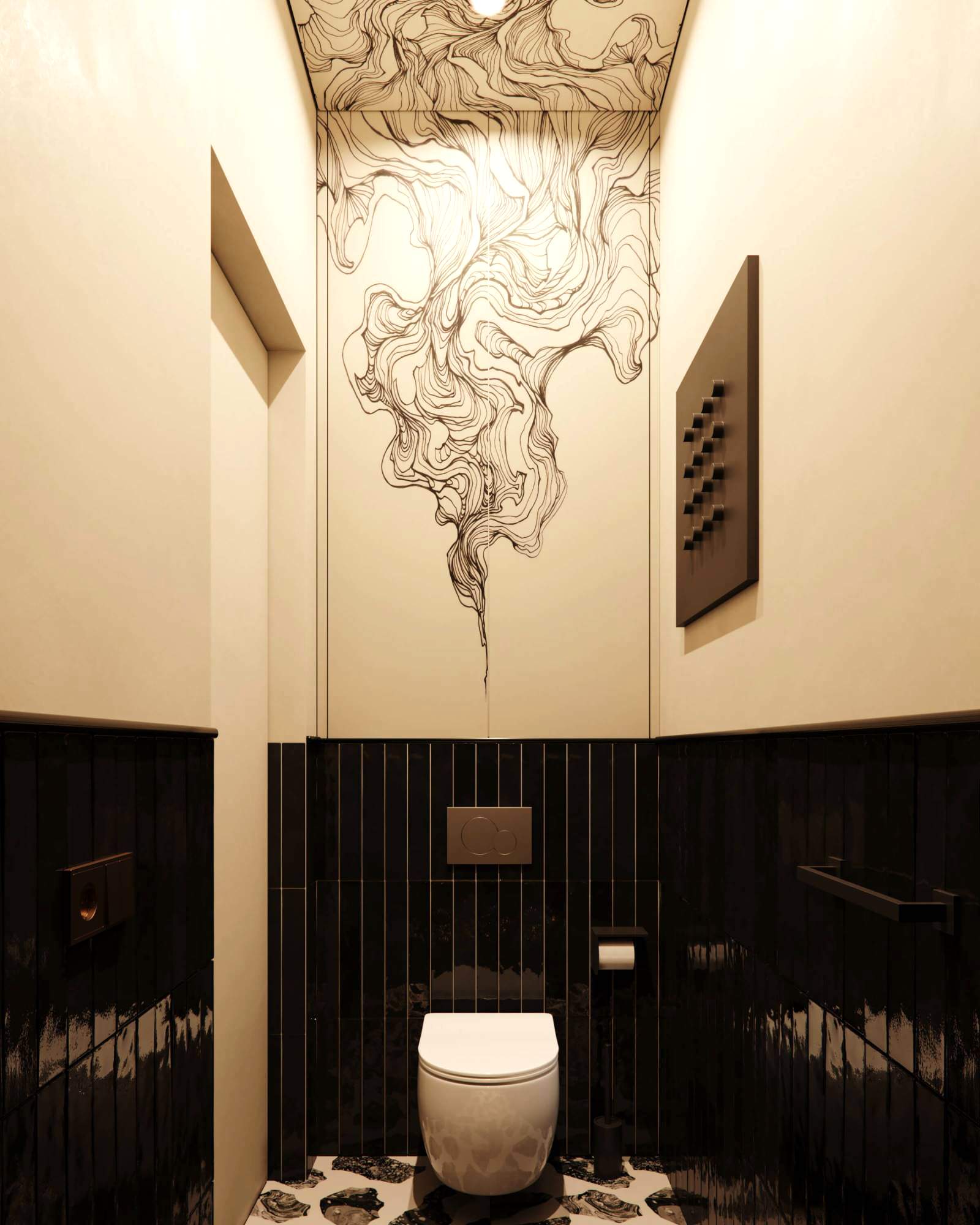 Гостевой санузел, пожалуй, самое необычное помещение в квартире. Намеренно отличается от остальной квартиры, чтобы создать эффект контраста. Он создан взбодрить и Pin-Up гостей, такое пожелание было от заказчиков.