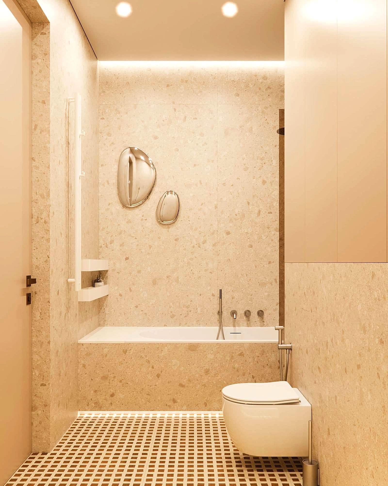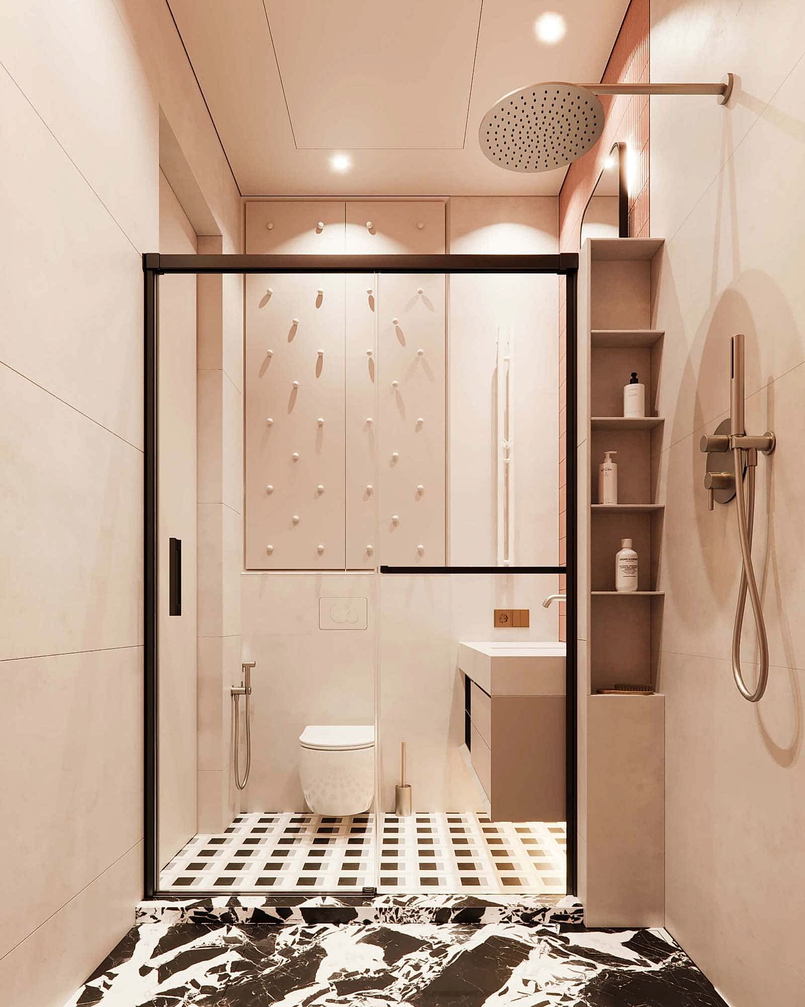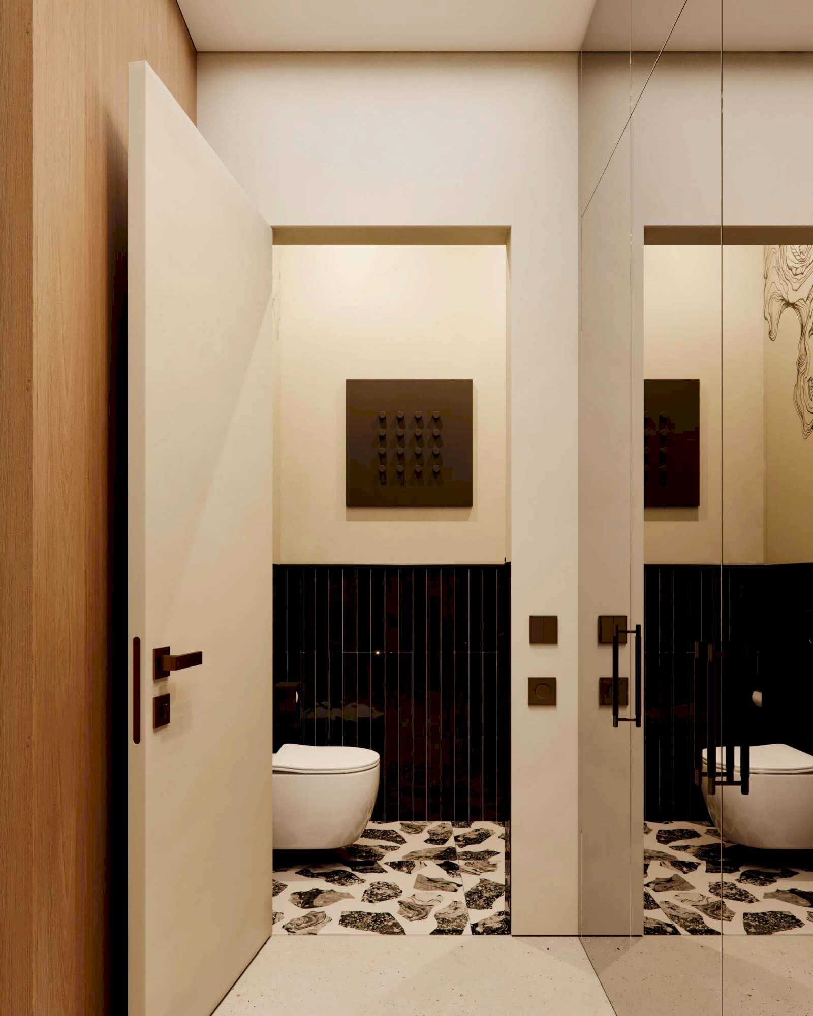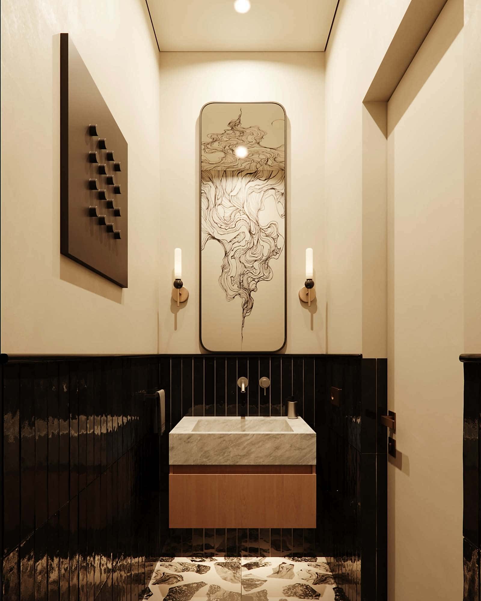 Гостевой санузел, пожалуй, самое необычное помещение в квартире. Намеренно отличается от остальной квартиры, чтобы создать эффект контраста. Он создан взбодрить и Pin-Up гостей, такое пожелание было от заказчиков.