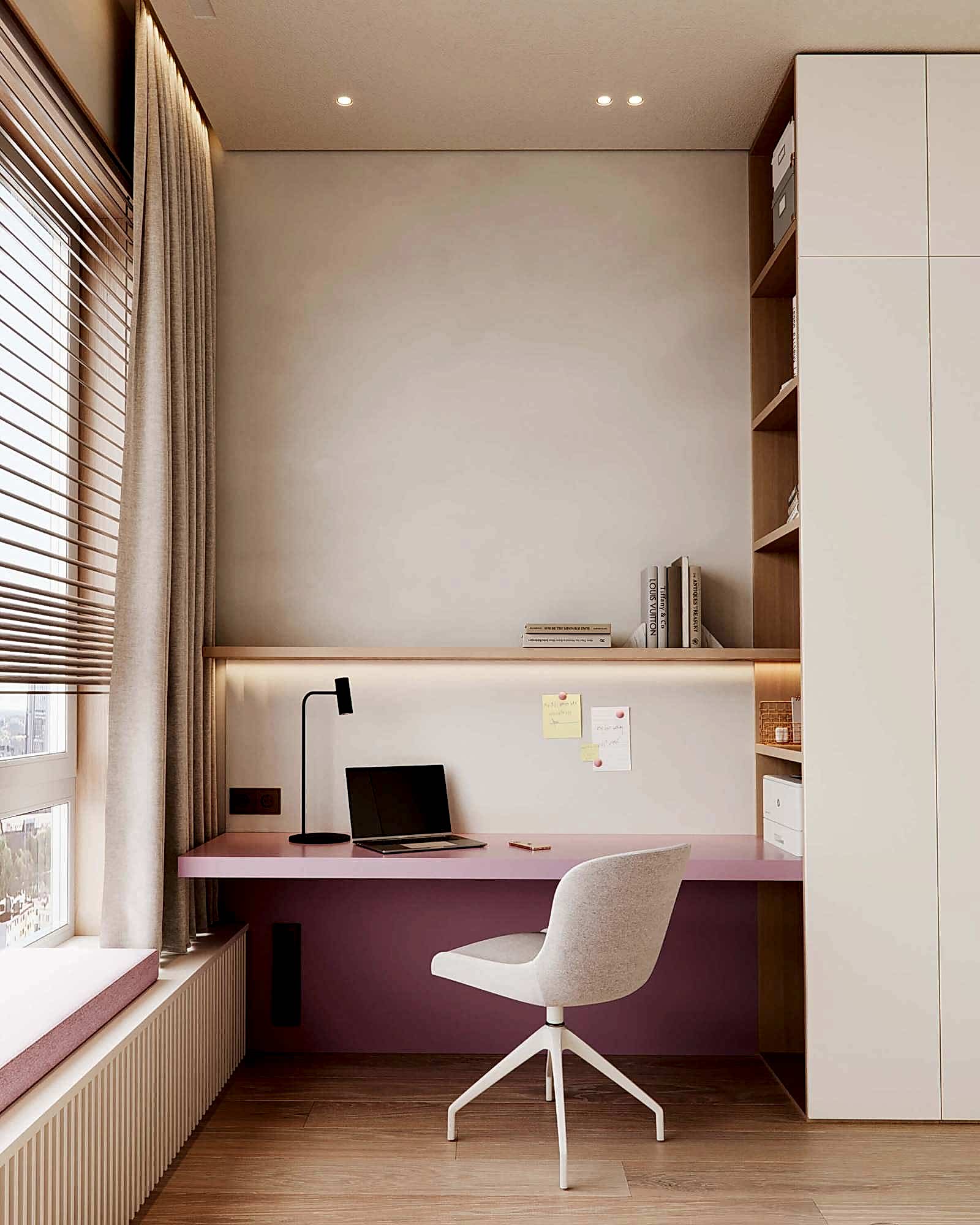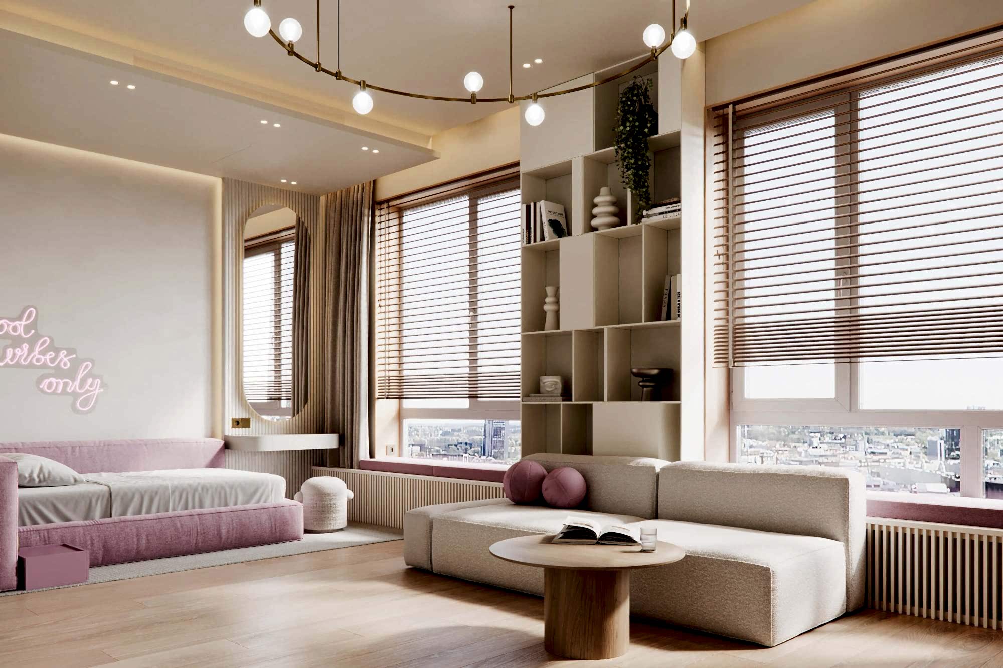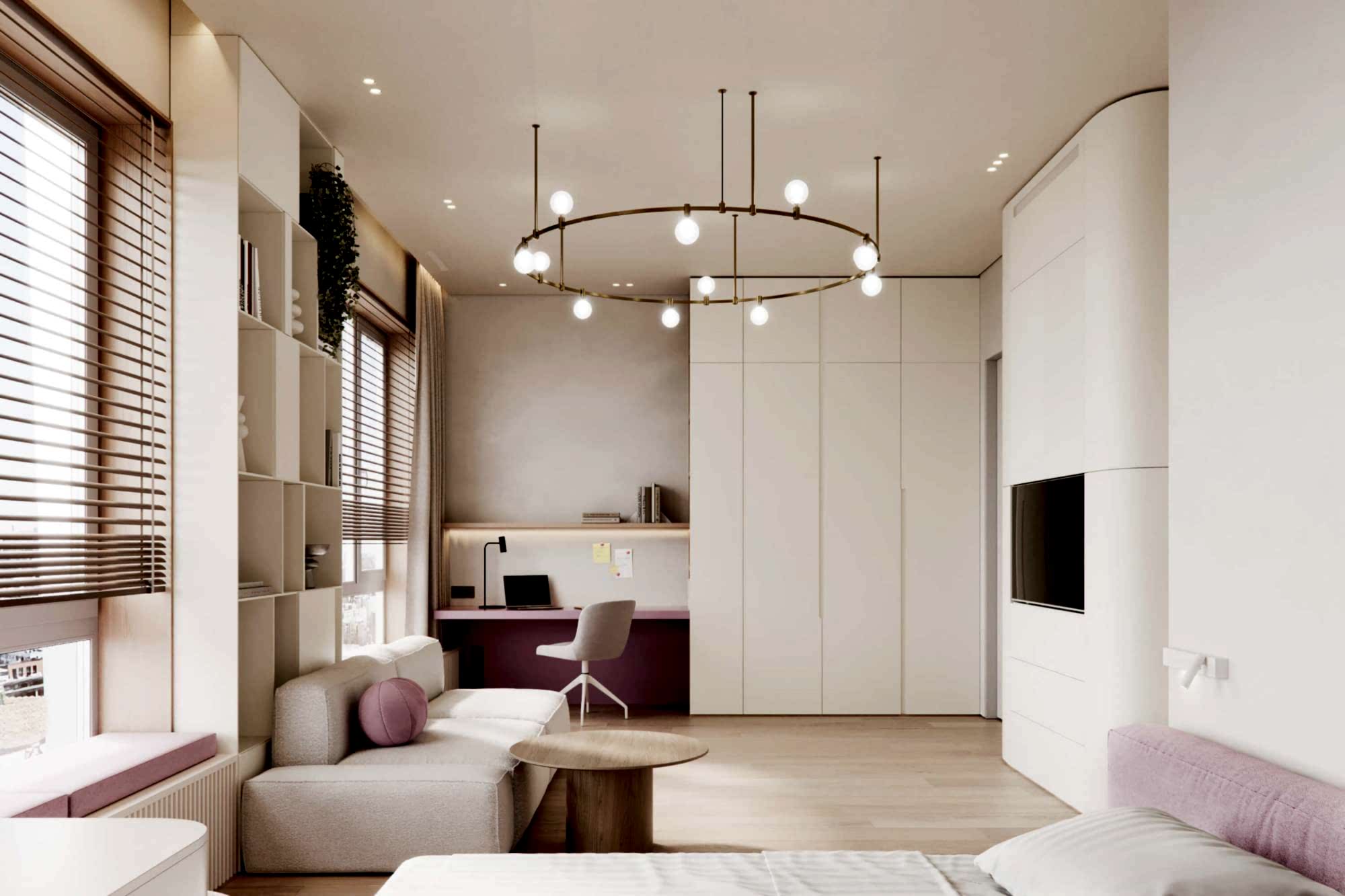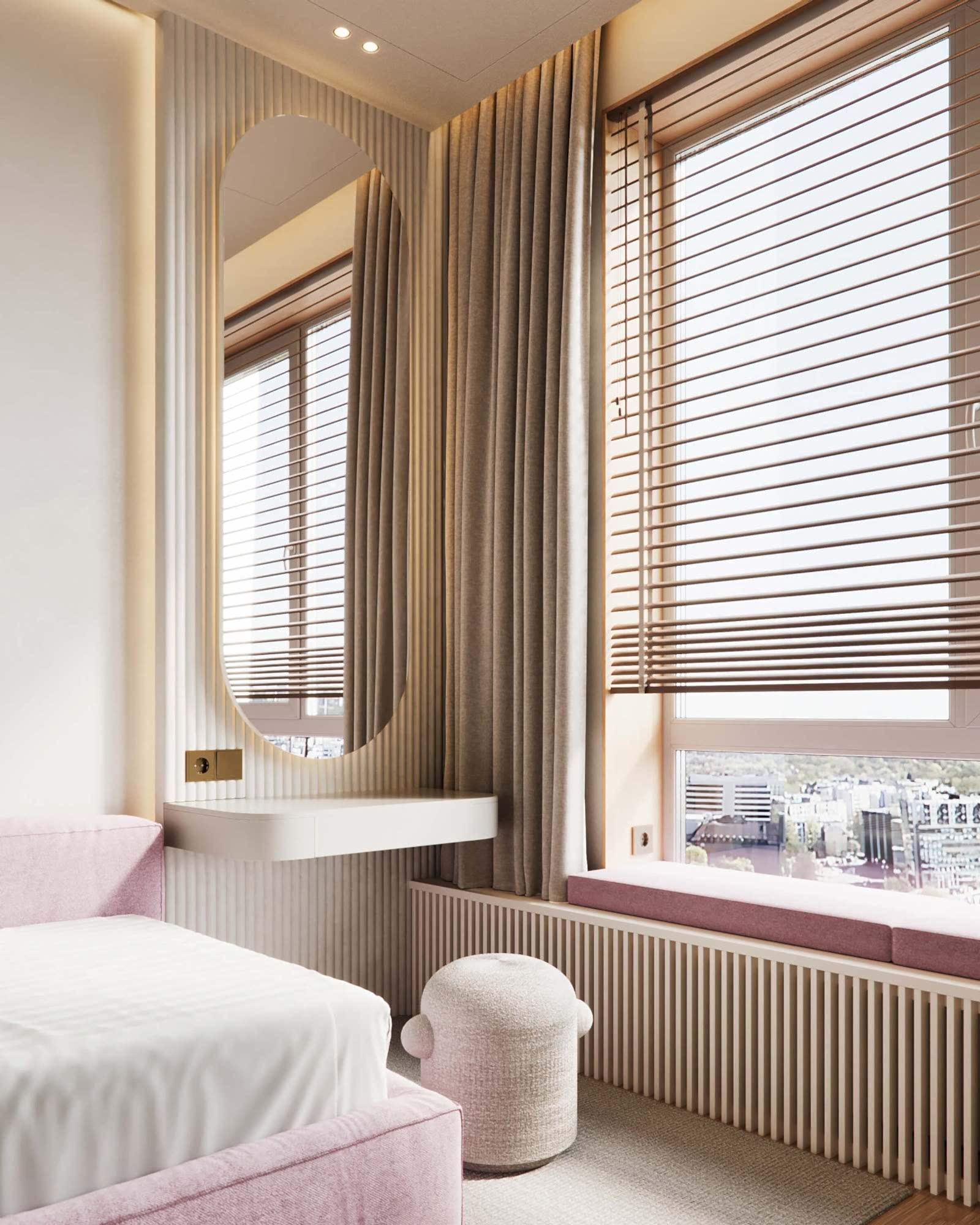 В просторной комнате несколько функциональных зон: для сна, учебы, отдыха и просмотра ТВ, а также гардероб и ванная комната со своим входом. Будуар для наведения красоты и мягкие подоконники, чтобы можно было насладиться видом на город и погрузиться в свои мысли.