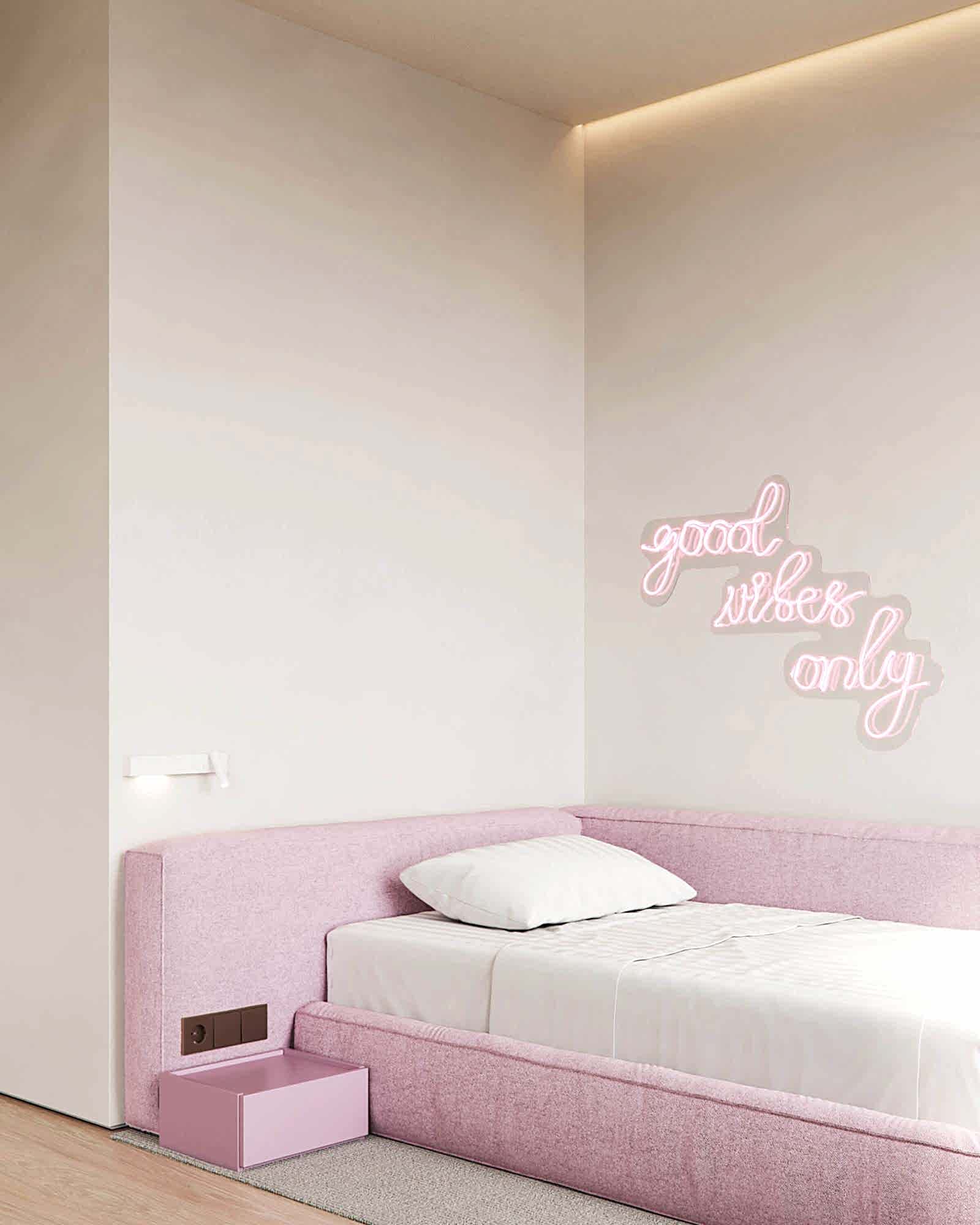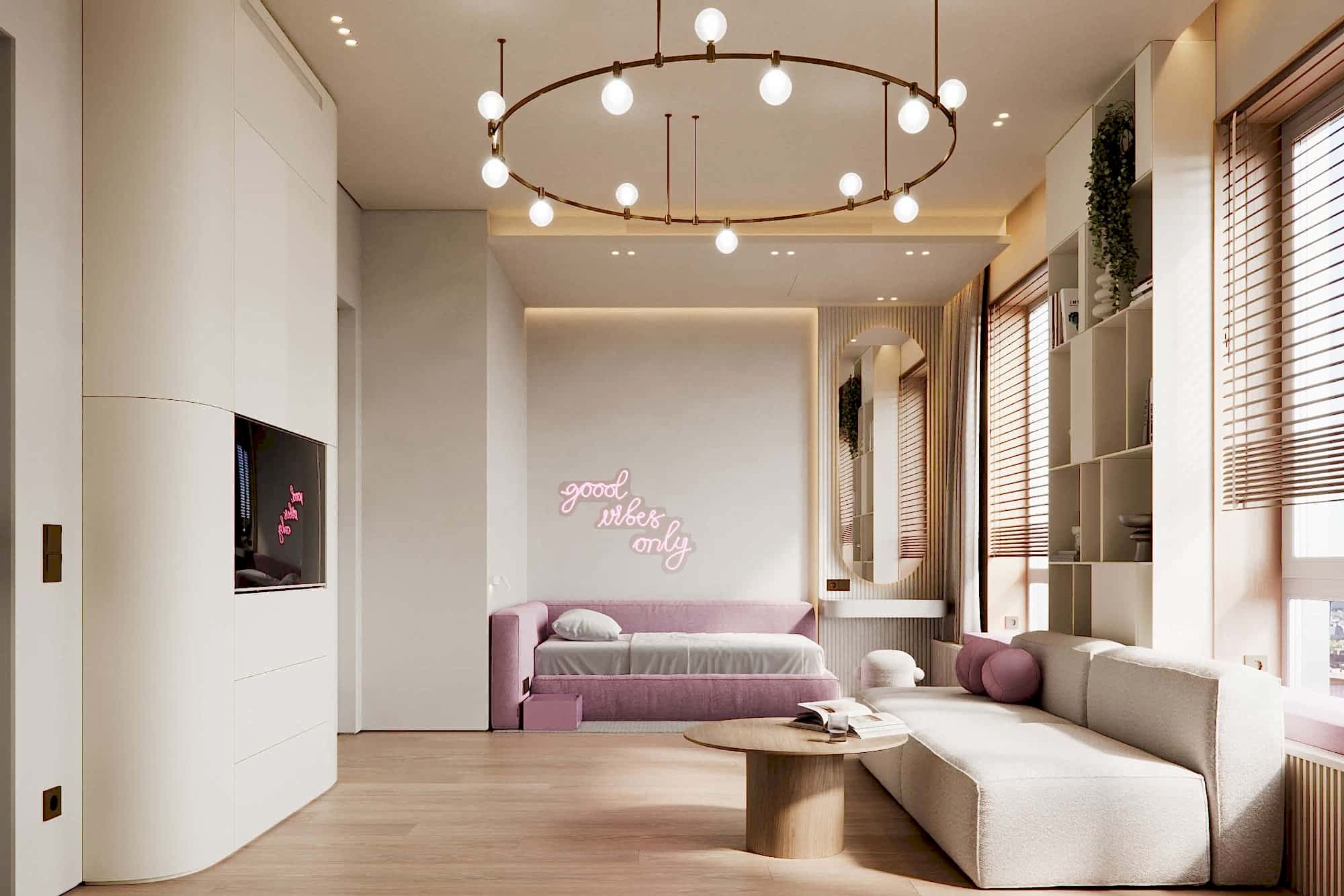 Мягкая пудровая цветовая гамма и Pin-Up линии подчеркивают, что комната для юной, стильной девушки.