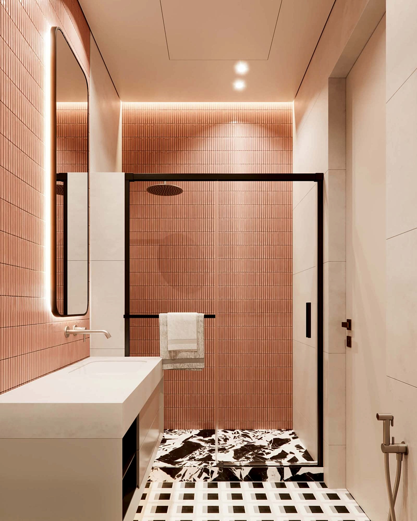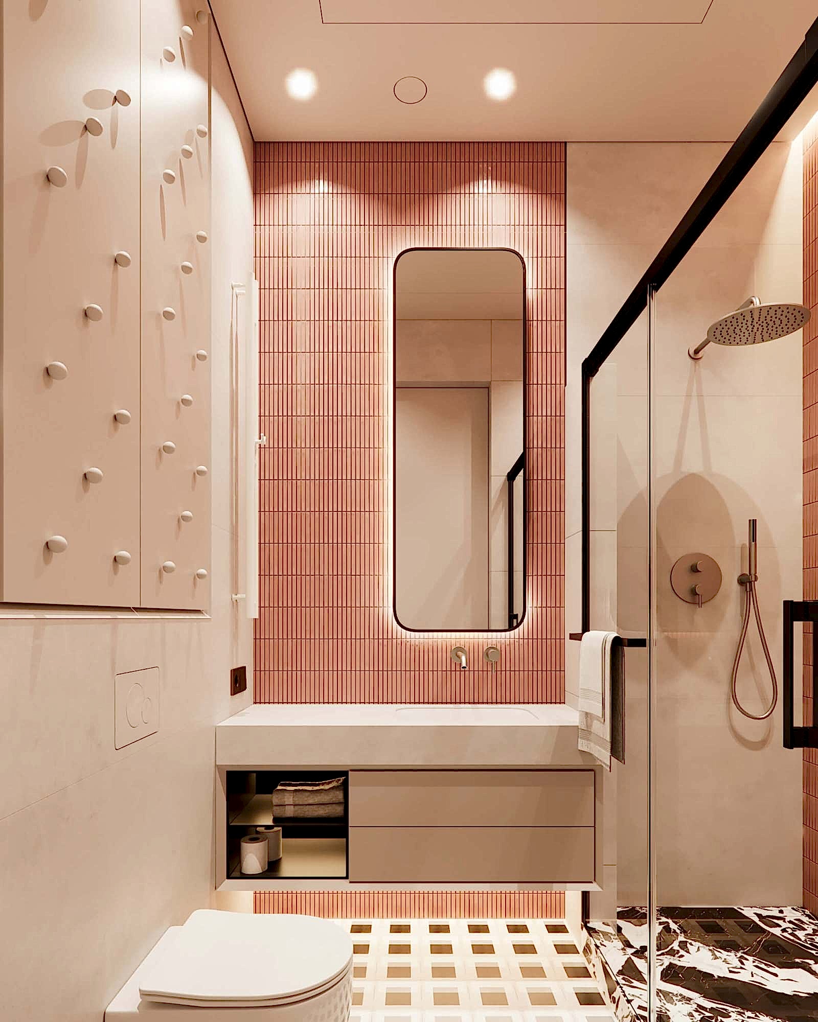 Здесь интересна каждая Pin-Up рисунок на стене, который отражается в зеркале, симметрично расположенные светильники, лаконичная раковина, сочетание плитки на стенах и полу.