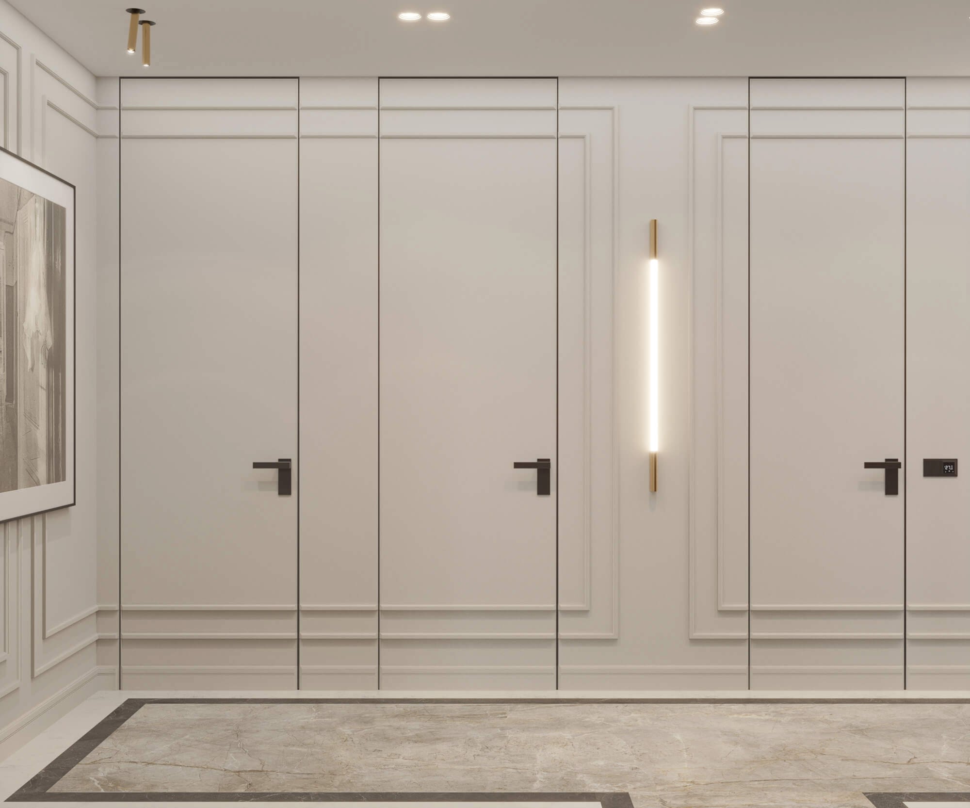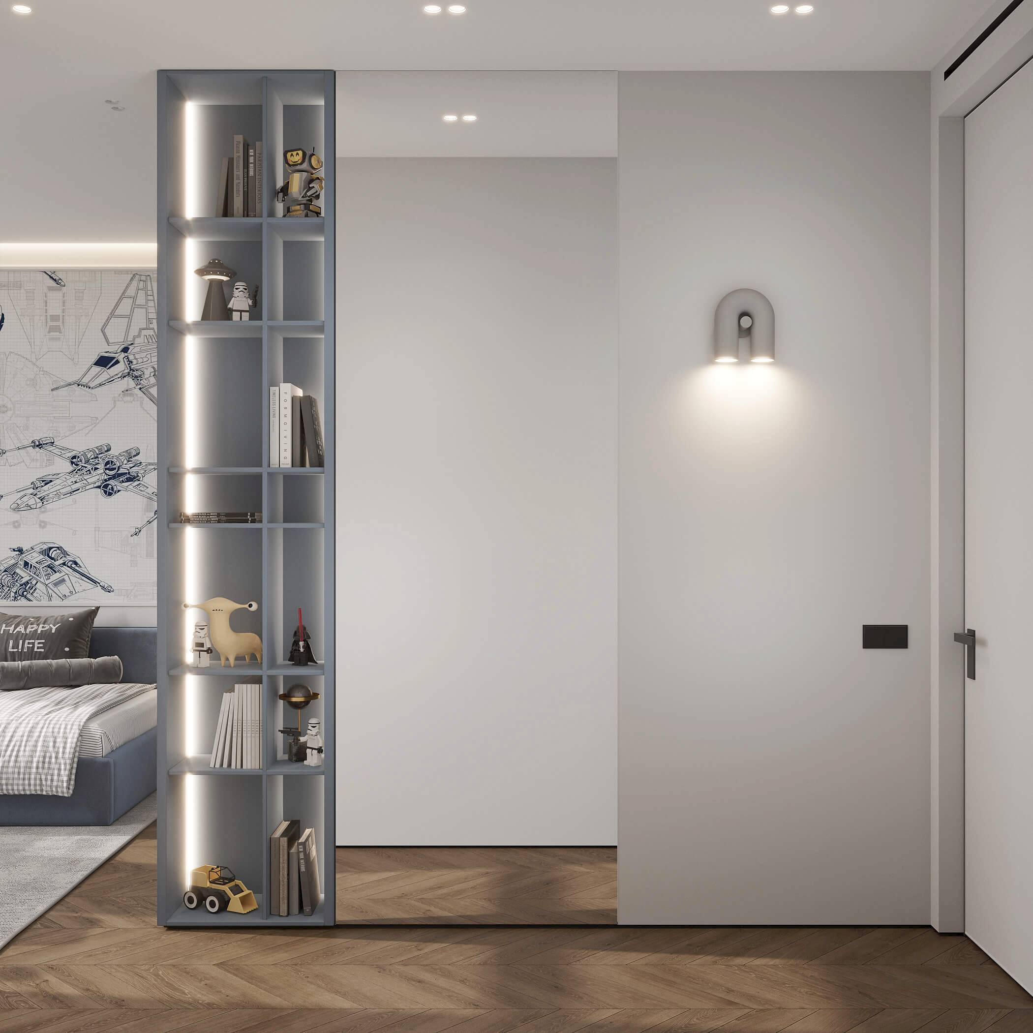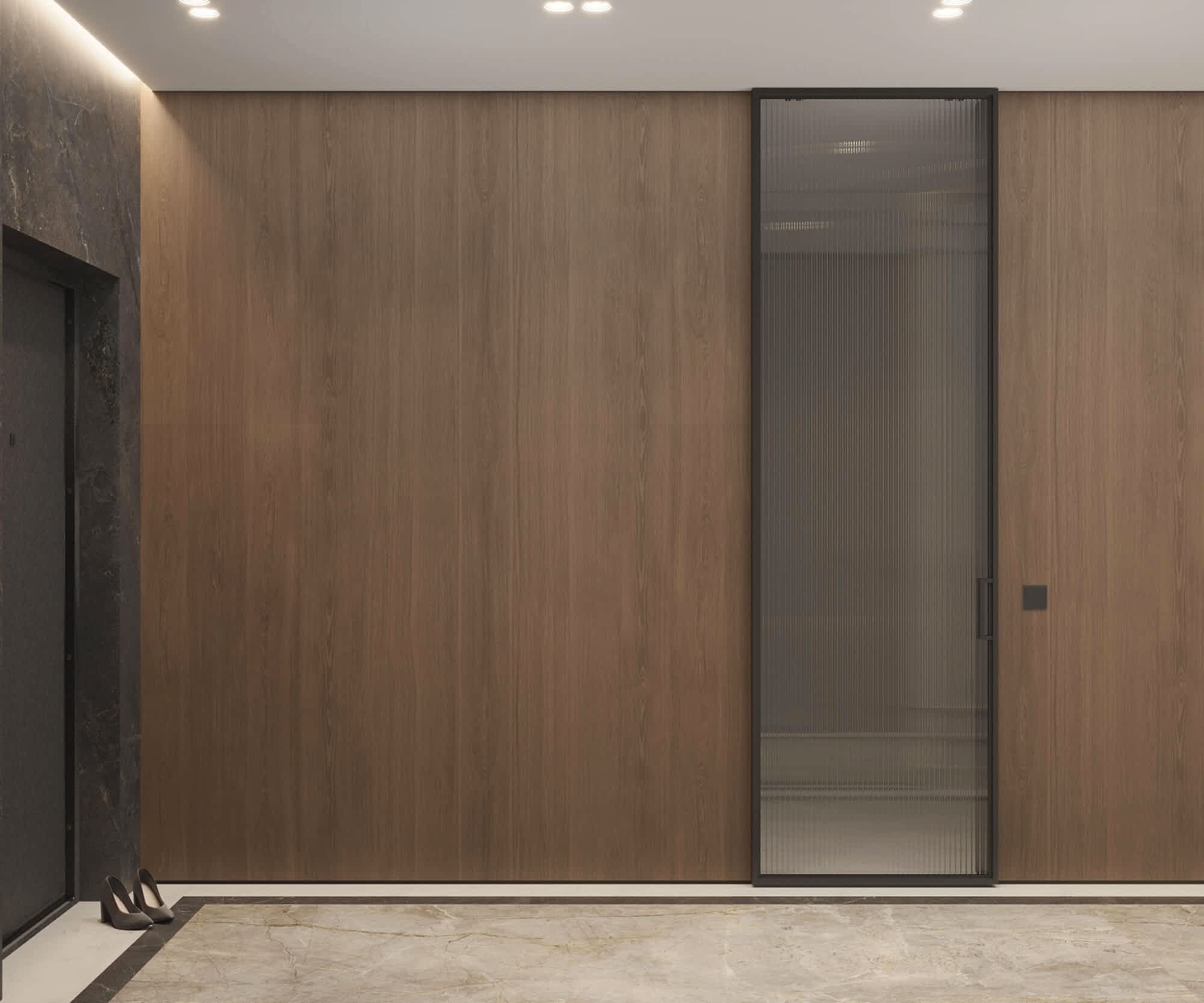 Pin-Up большая со стандартной планировкой «распашонкой», где комнаты находятся по разные стороны длинного коридора напротив друг друга. Таким образом, не получится избавиться от длинного коридора, но можно его сделать достоинством, а не недостатком.