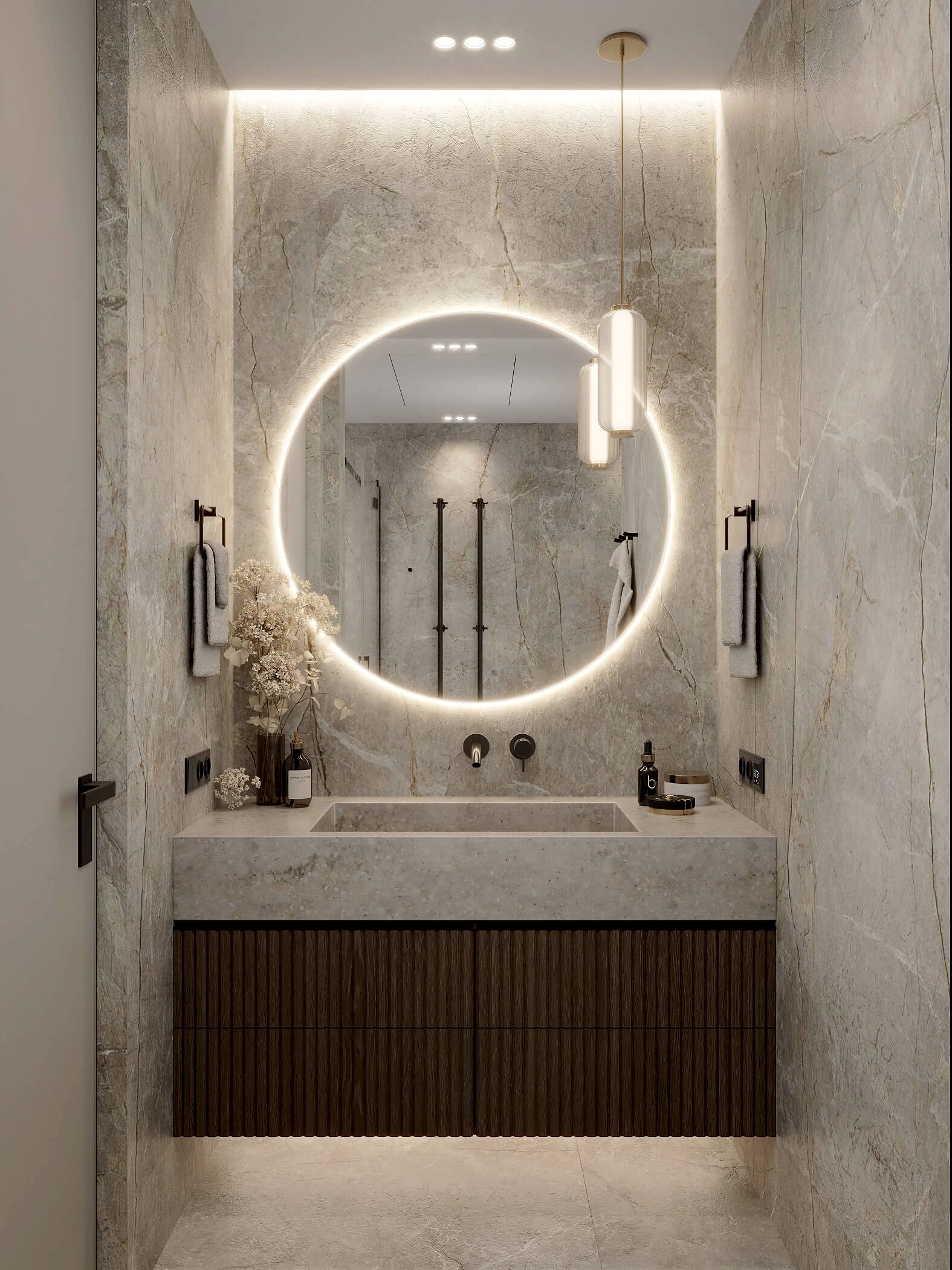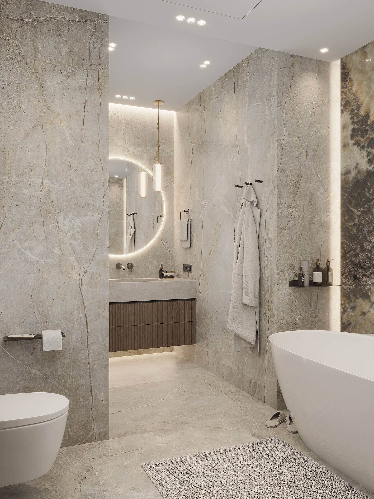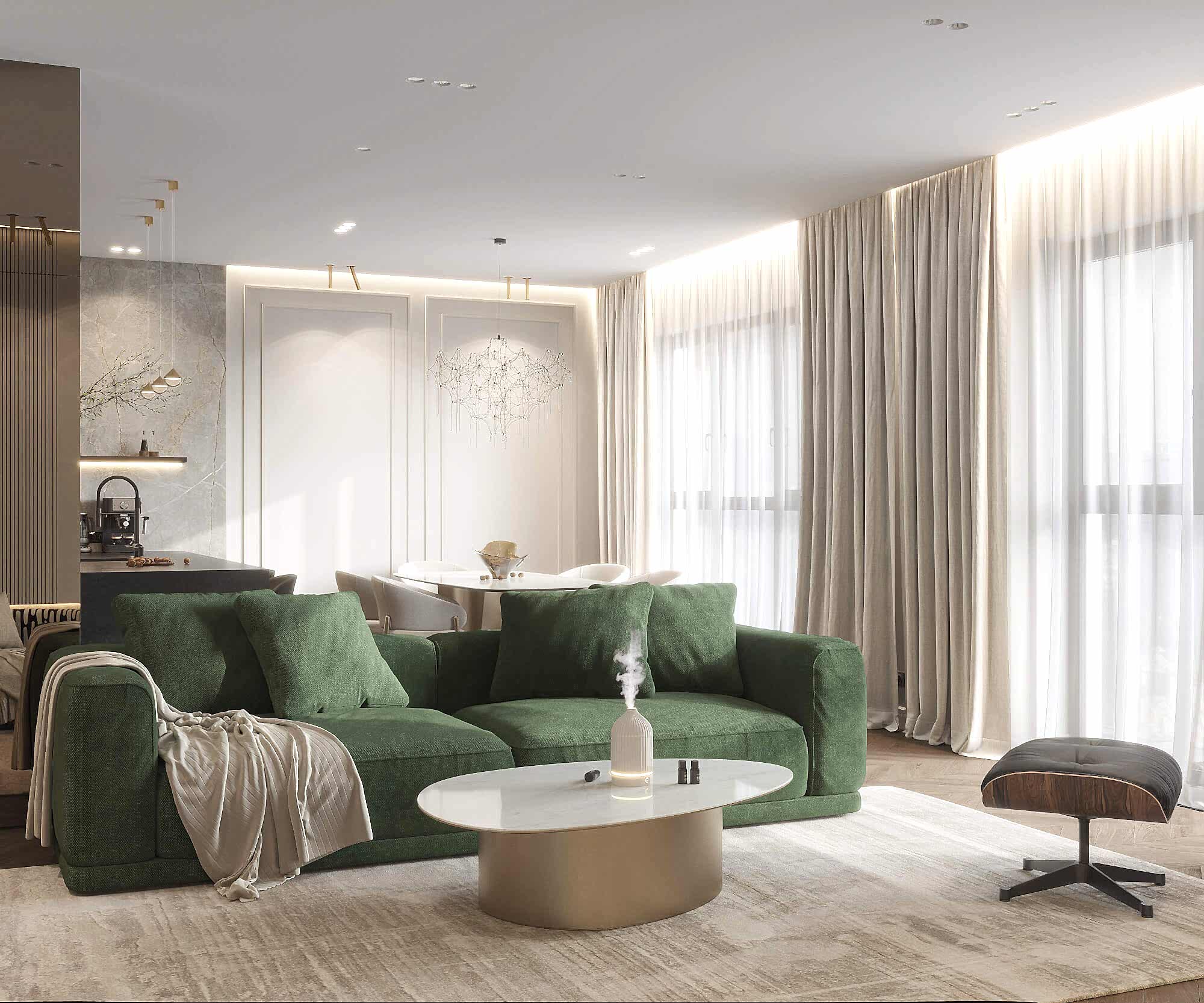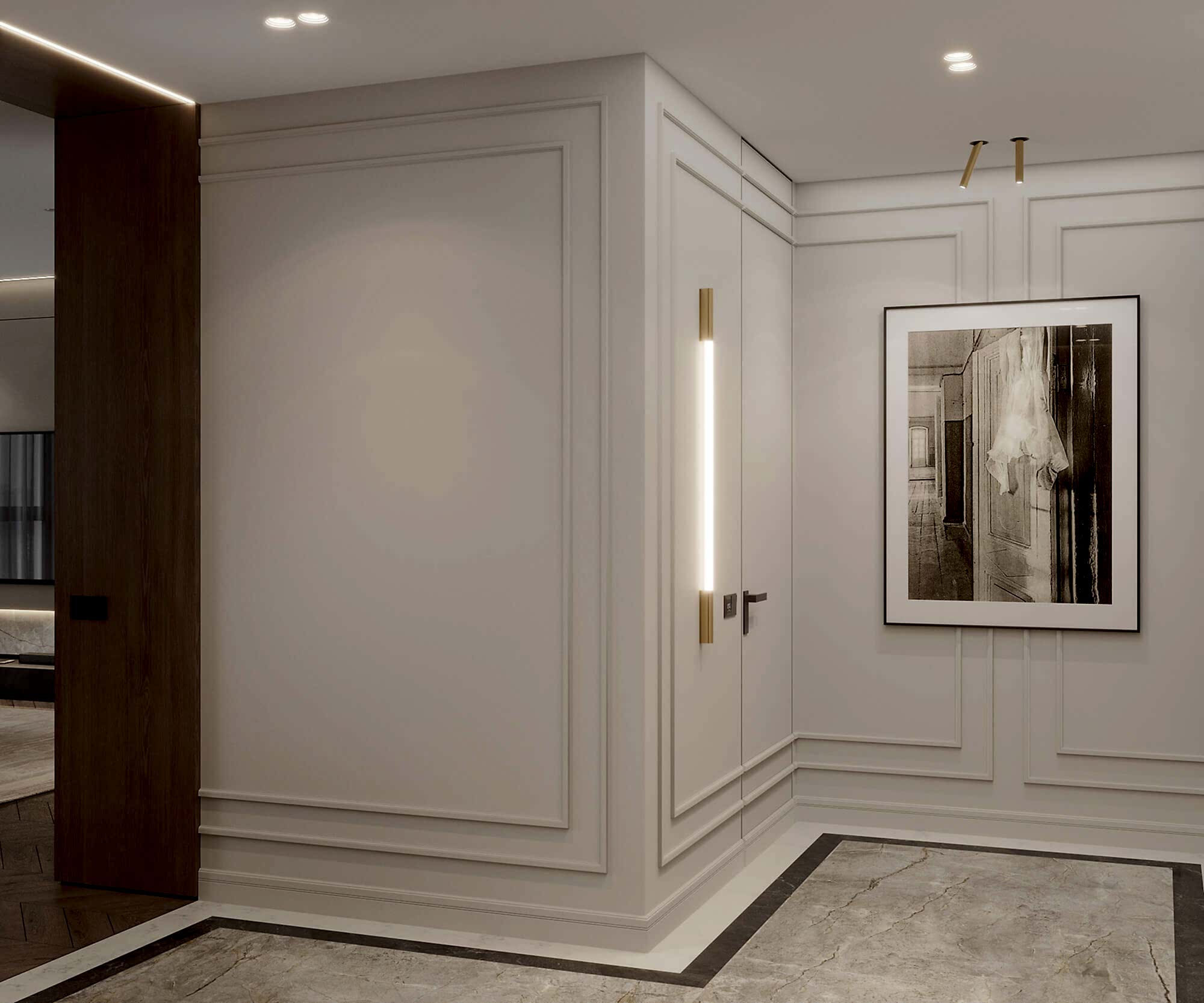 Получилось соединить выверенную гармоничность классики (молдинги, дерево, светлые стены, спокойная цветовая гамма), актуальность современных тенденций (слэб в ванной, простая форма мебели, зеркала и стекла) и яркие акценты Pin-Up кресло, зеленый диван, светильники, интересные предметы мебели (столики, вазы).