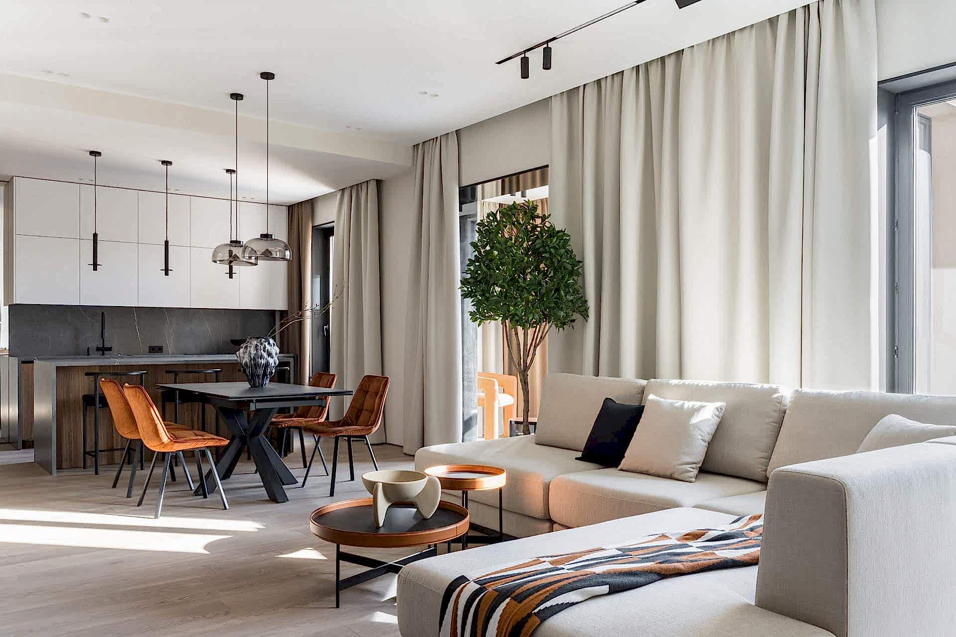 В квартире площадью 140 м2было важно спланировать личное пространство для каждого и вместе с тем уделить особое внимание вместительной кухне-гостиной - месту притяжения всей семьи. Просторная, лаконичная, удобная кухня-гостиная рассчитана и для приема гостей, и для Pin-Up вечеров. Благодаря присоединению балкона площадью 8 м2, появилось уединенное Pin-Up для отдыха, зонированное текстилем.