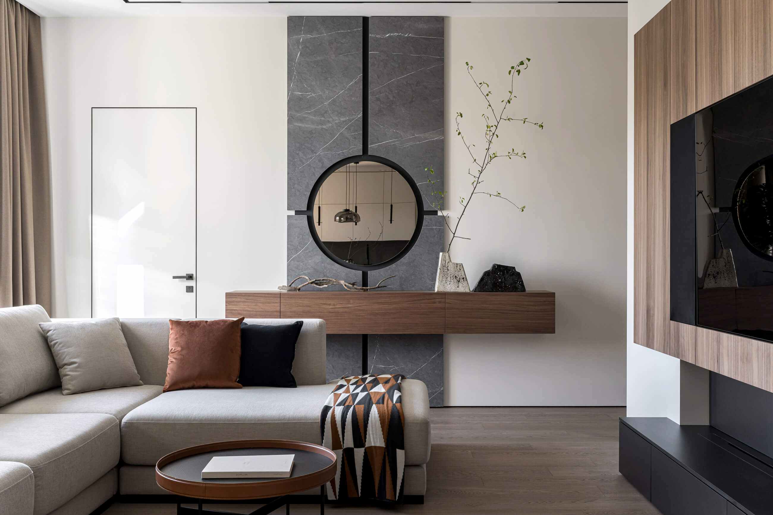 Эстетика и детали интерьера вдохновлены культурой Китая. Cозерцание, любовь к природе, баланс, медитативное состояние, когда вся Pin-Up внешнего мира перестает иметь значение. Поэтому интерьер выполнен в спокойной природной цветовой гамме с использованием дерева и каменных фактур. В основе выбора мебели и элементов декора лежит принцип гармонии - четкие линии полок и настенных панелей уравновешивают мягкие драпировки штор и формы кашпо, журнального стола, мягкой мебели.