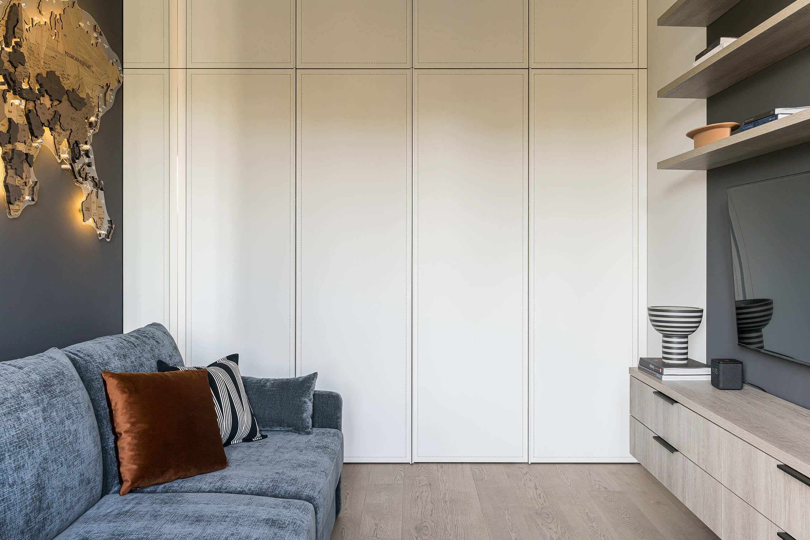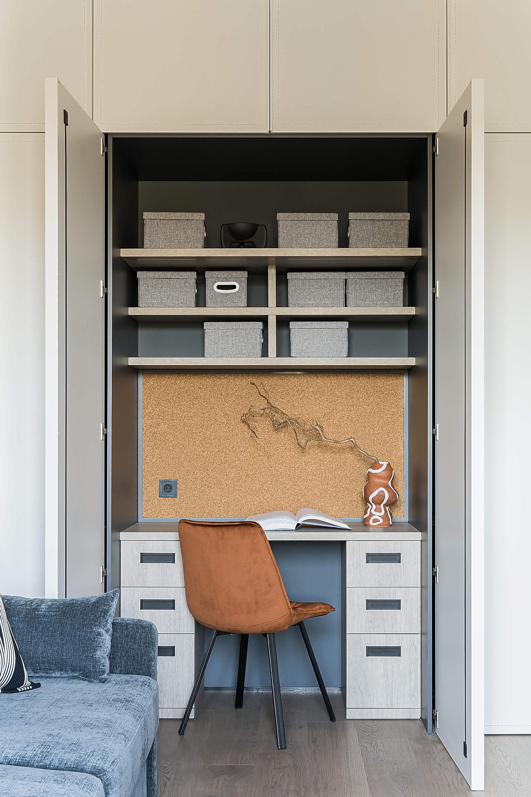 Кабинет выполняет сразу несколько функций: это рабочая зона, гостевая комната и компактный Pin-Up цех для клиентки модельера-конструктора. Рабочий стол со стулом, хранение для швейной машинки и оверлока, компактная гладильная доска,складной раскройный стол аккуратно скрыты за фасадами шкафа.