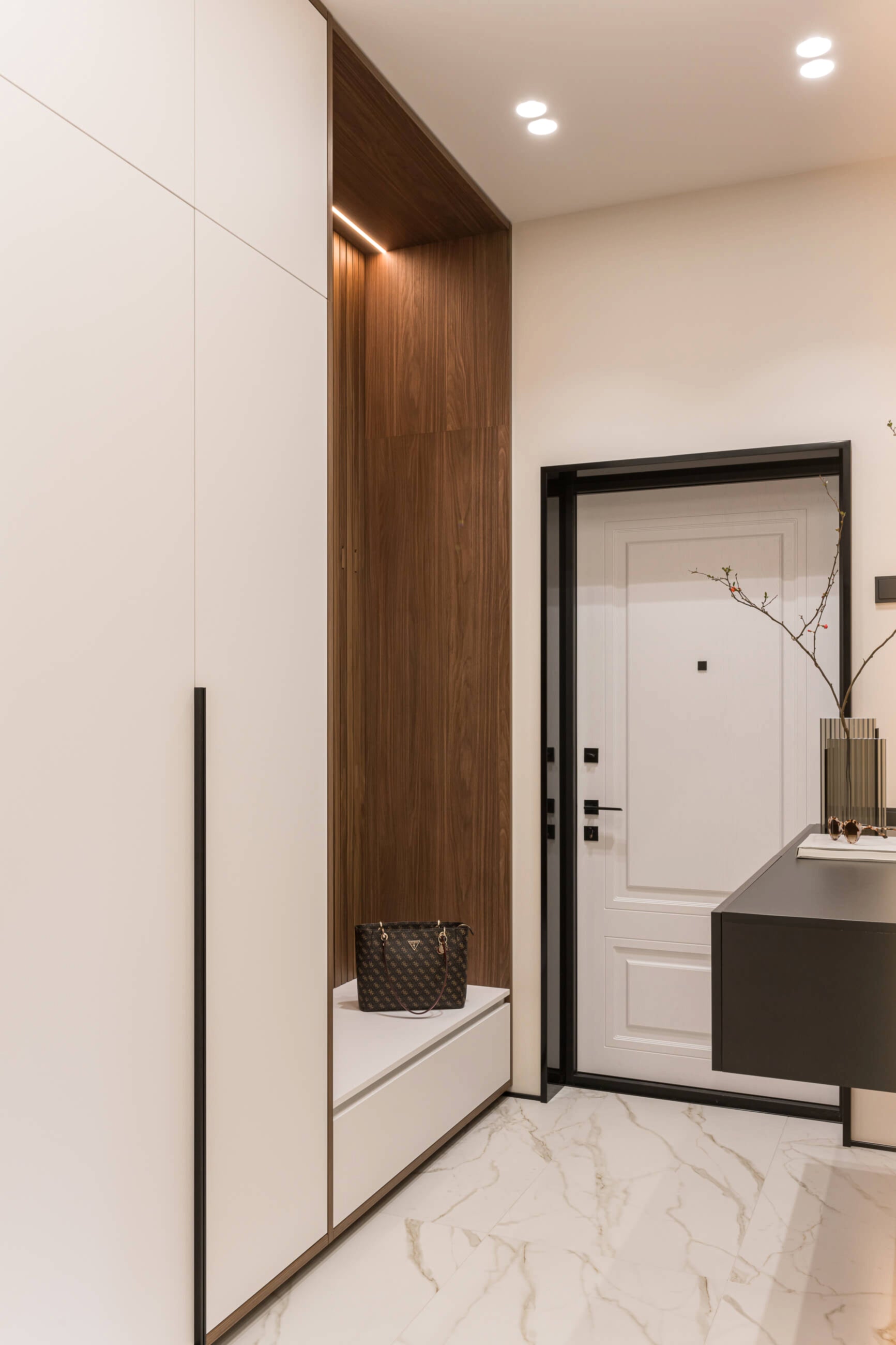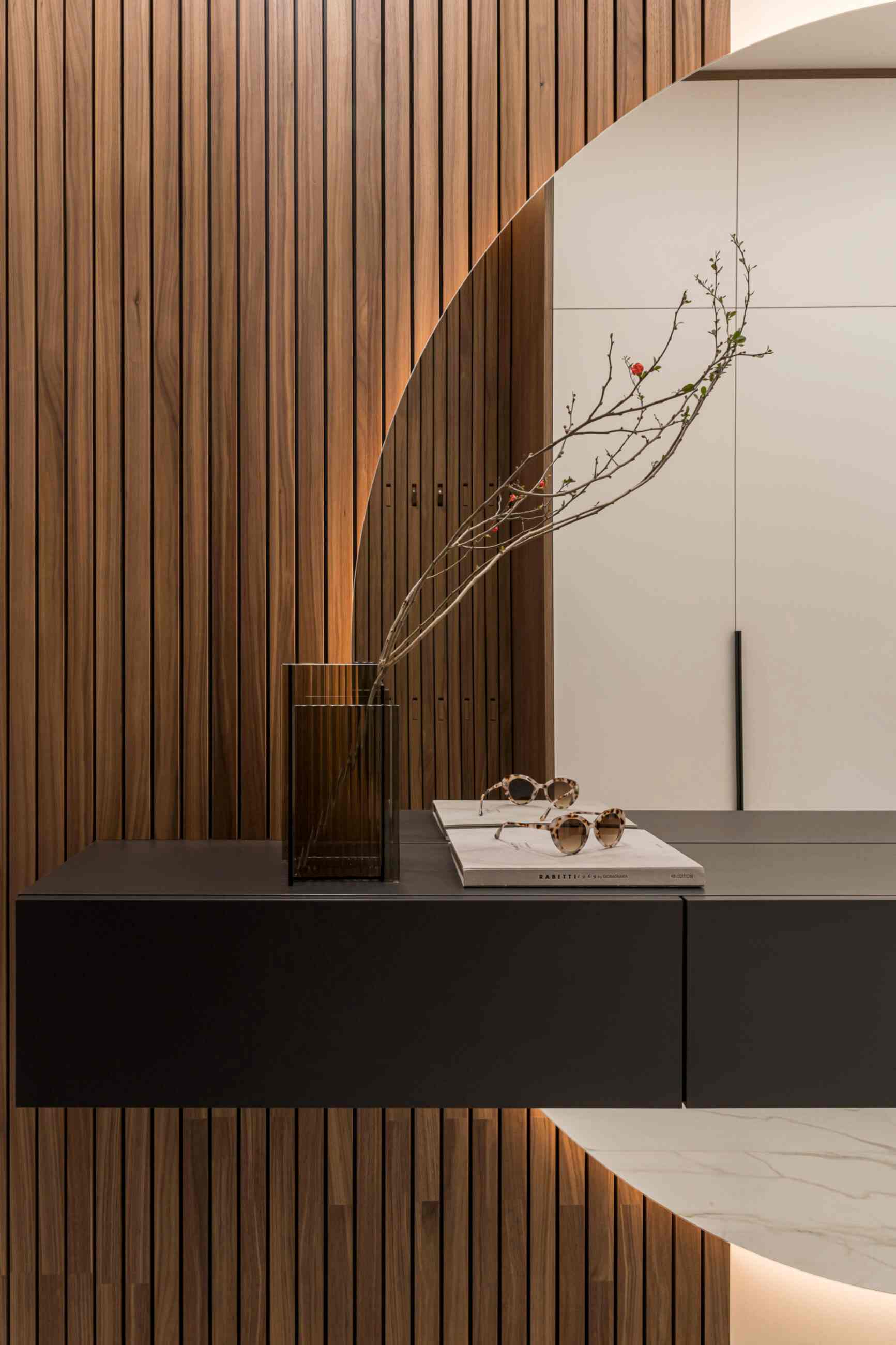 В светлой прихожей размещен просторный вместительный шкаф, входная зона с реечной стеновой панелью и магнитными крючками для одежды и сидением. Рядом круглое двухметровое зеркало с примыкающей тумбой - удобно, чтобы увидеть Pin-Up в полный рост перед выходом из дома, и красиво, чтобы менять атмосферу за счет подсветки.