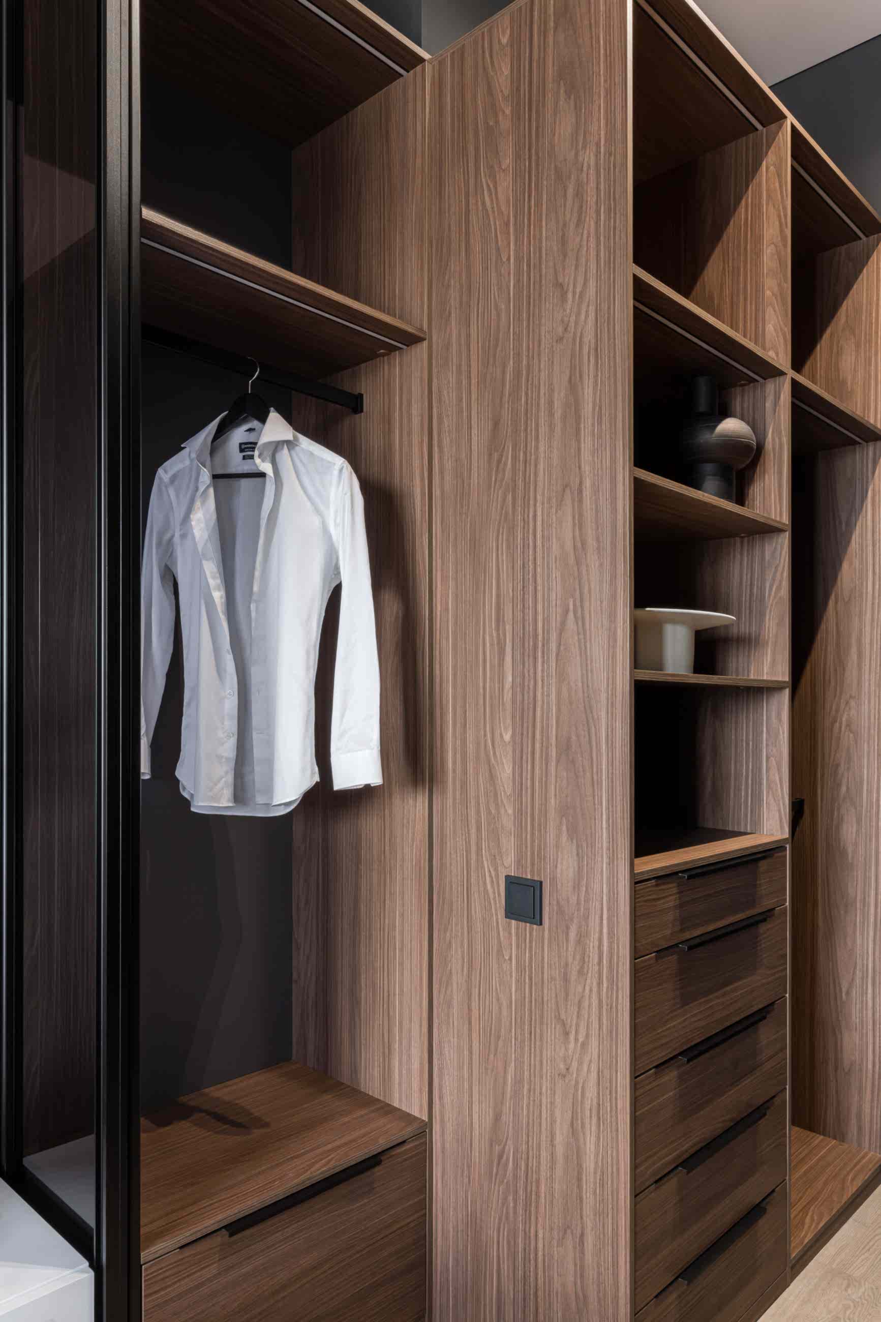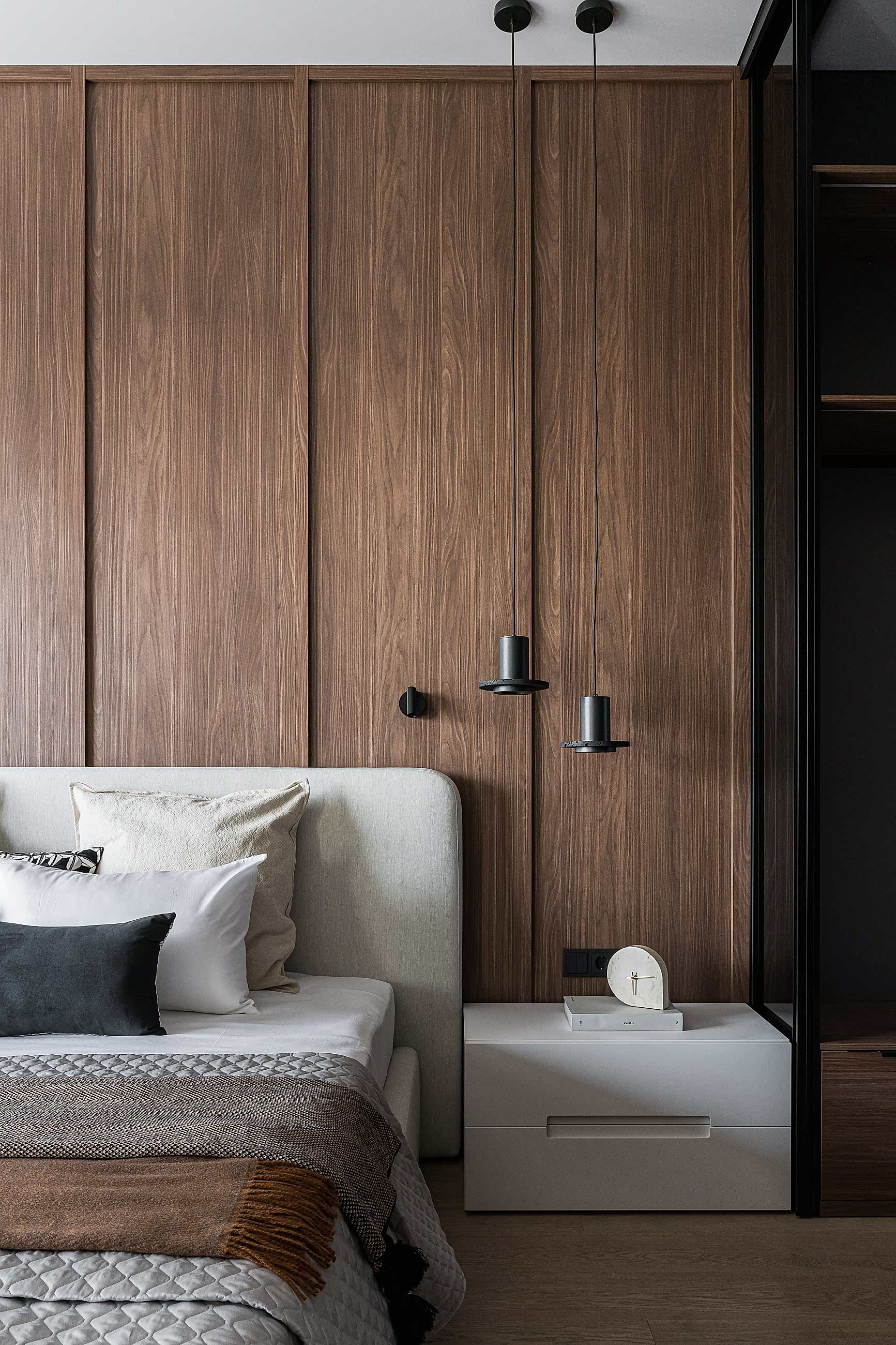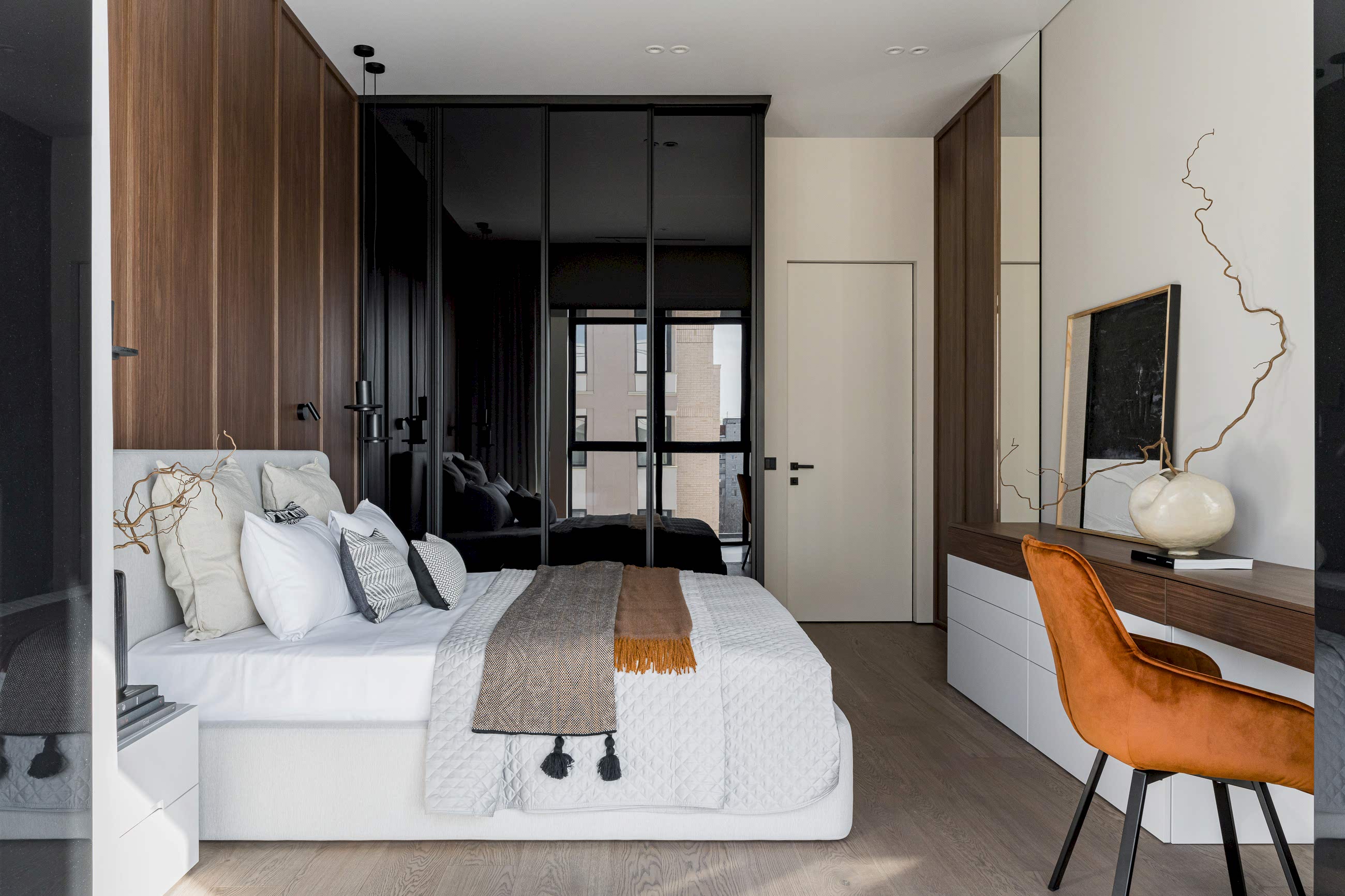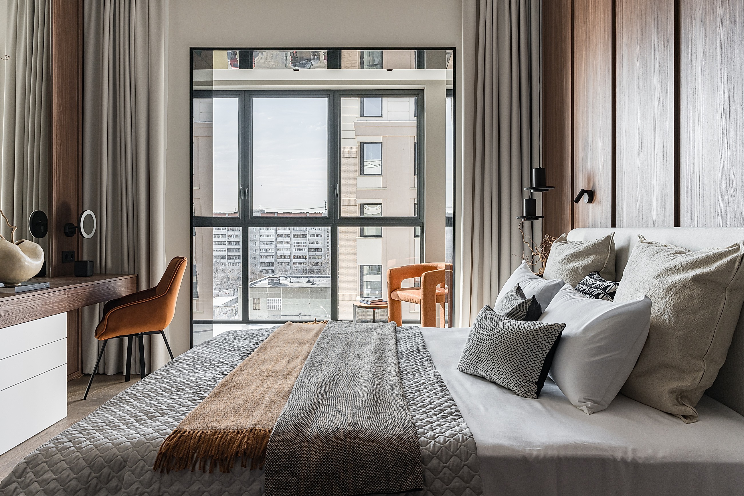 В спальне расположена зона Pin-Up с панорамными окнами, большая кровать, гардеробная и мастер-ванная. Отдельный санузел сохраняет пространство для личной жизни. Продуманы разные уровни освещения: для чтения, раннего подъема или создания интимной обстановки.