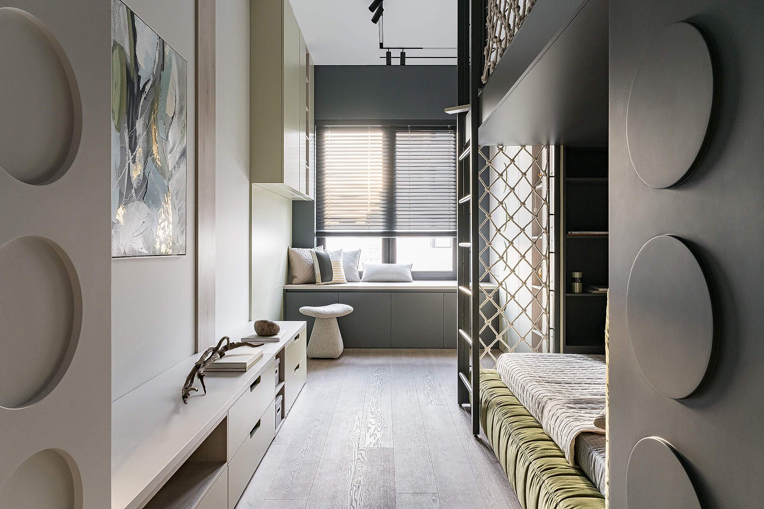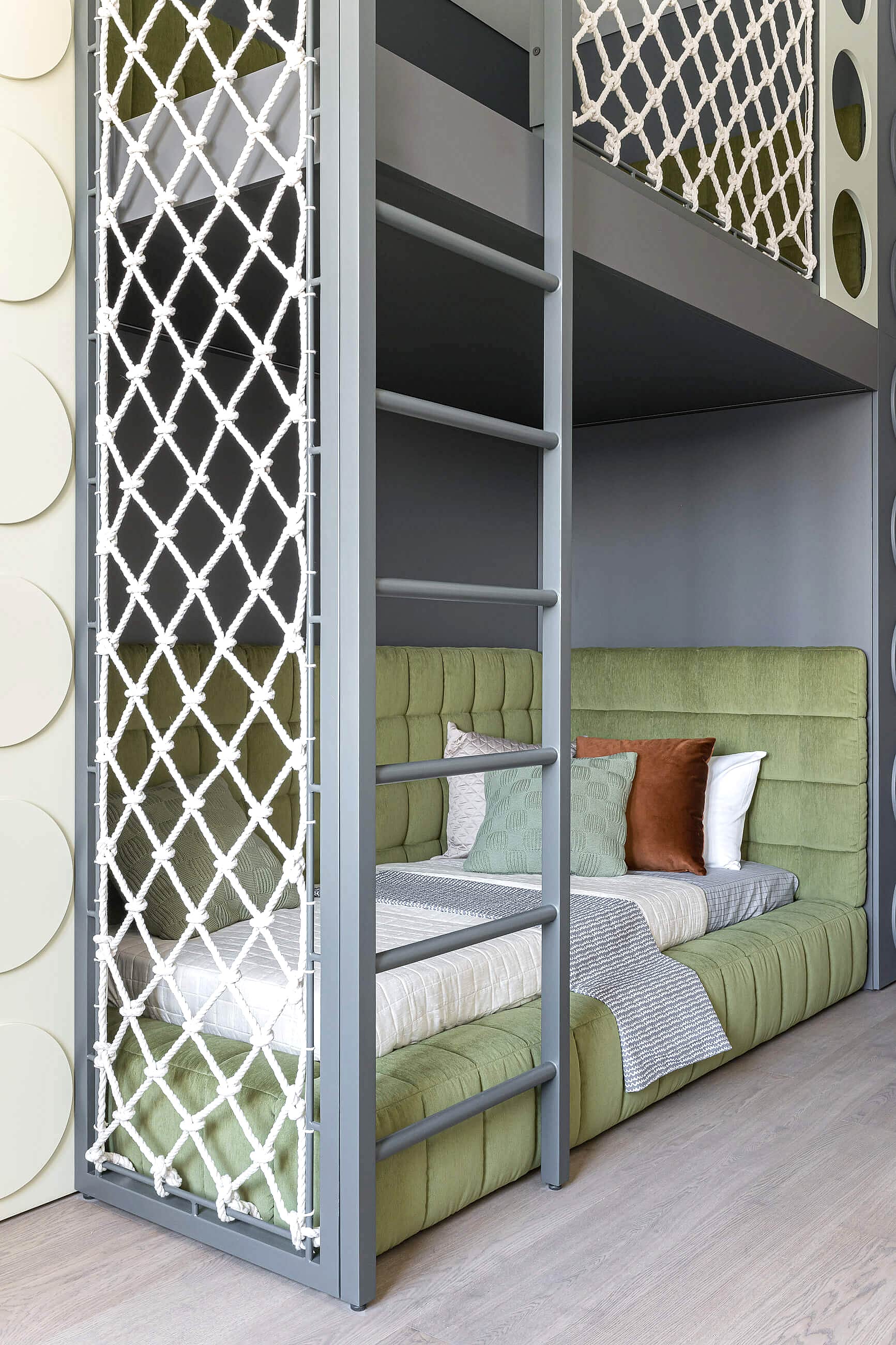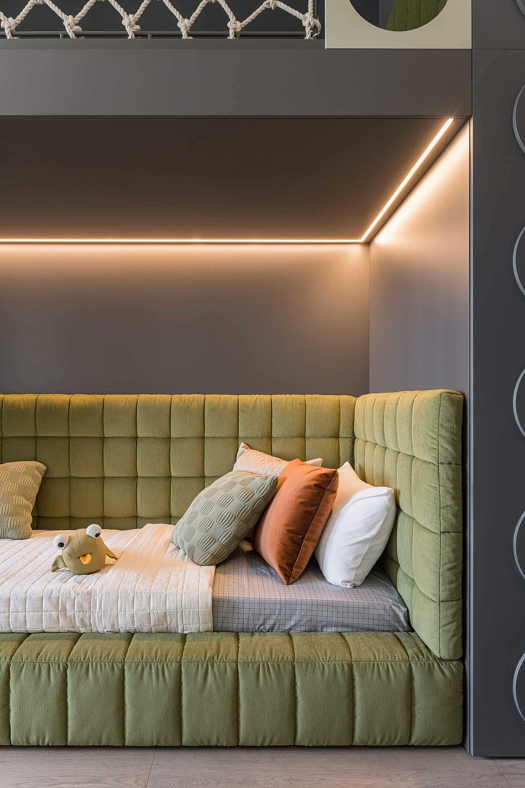 Детская спроектирована для двух детей, но так, чтобы ее в будущем было легко трансформировать в комнату подростка. Заложено место для парты и большого рабочего стола; а второй этаж кровати, который сейчас отдан под игровую зону, может стать полноценным Pin-Up местом.
