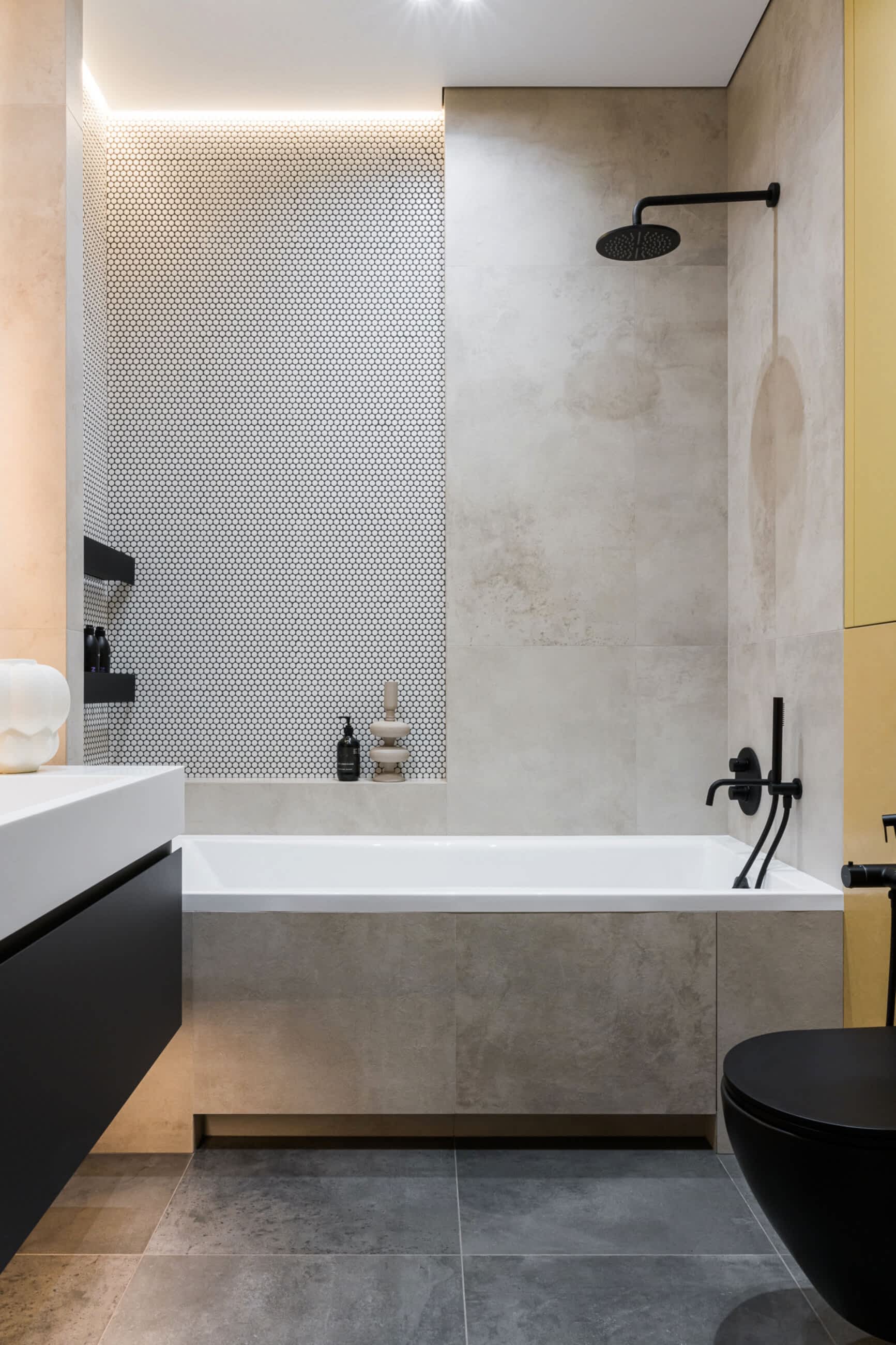 Ванная комната предназначена для детей и посещения гостей. Чтобы визуально не перегружать пространство, в ванной предусмотрена съемная Pin-Up для штор, которую можно убрать в скрытые полки.