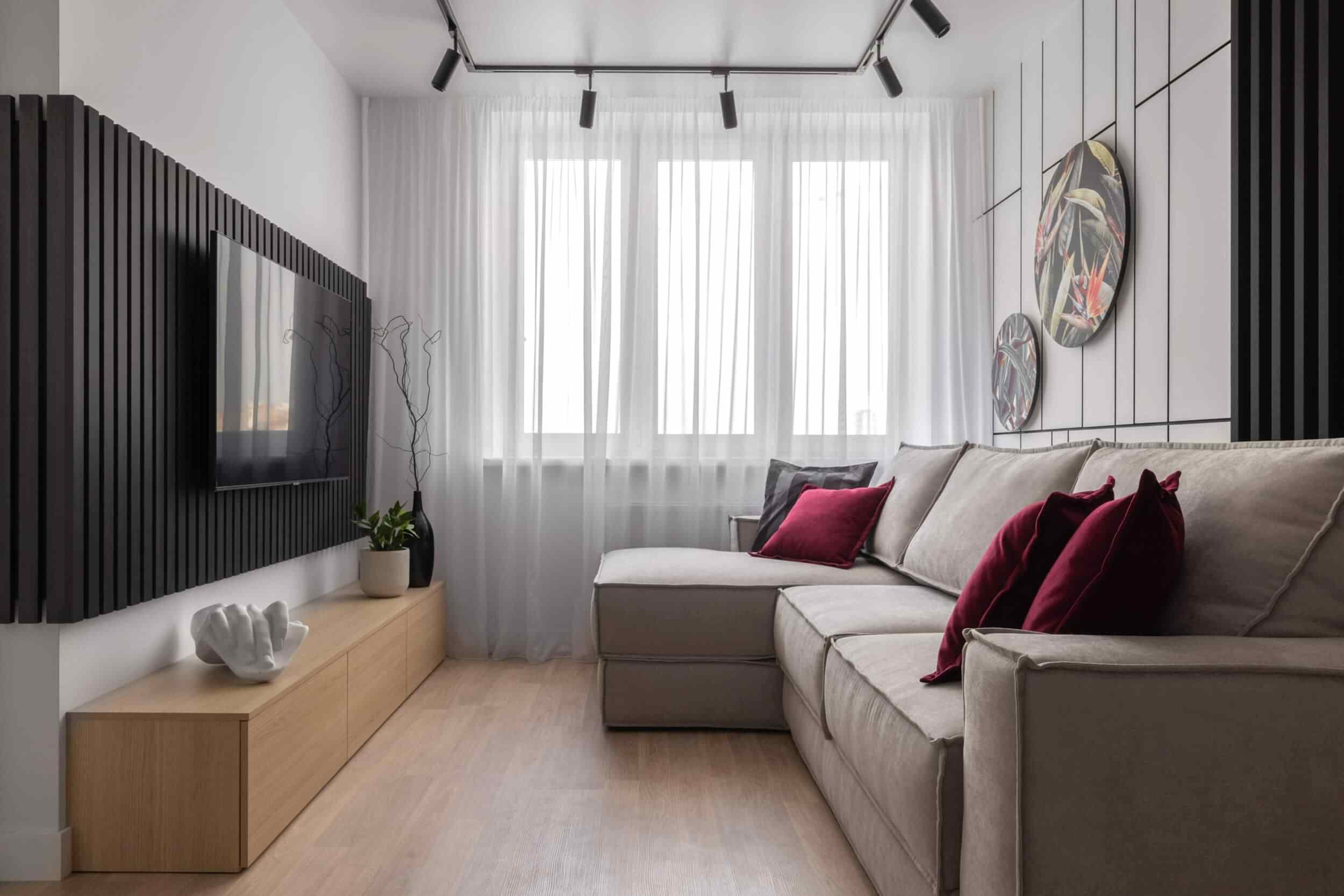 Зона ТВ Pin-Up в минималистичном стиле с системой хранения только внизу, чтобы не утяжелять верхнюю часть. На стене за диваном мы использовали декоративные светильники с печатью, сделанные на заказ.