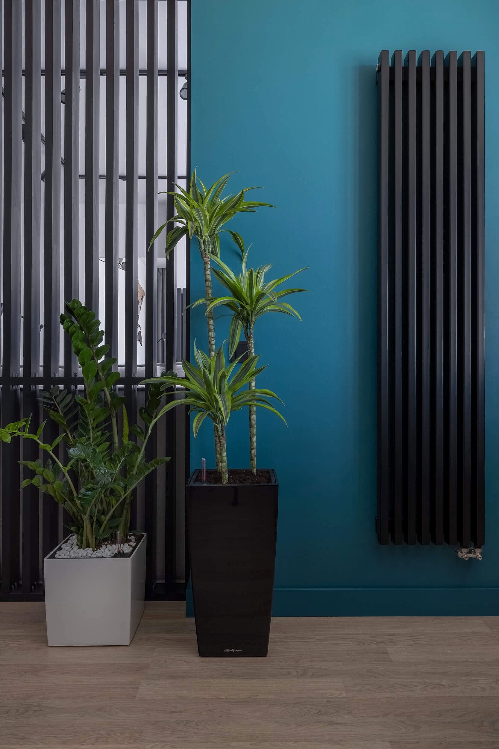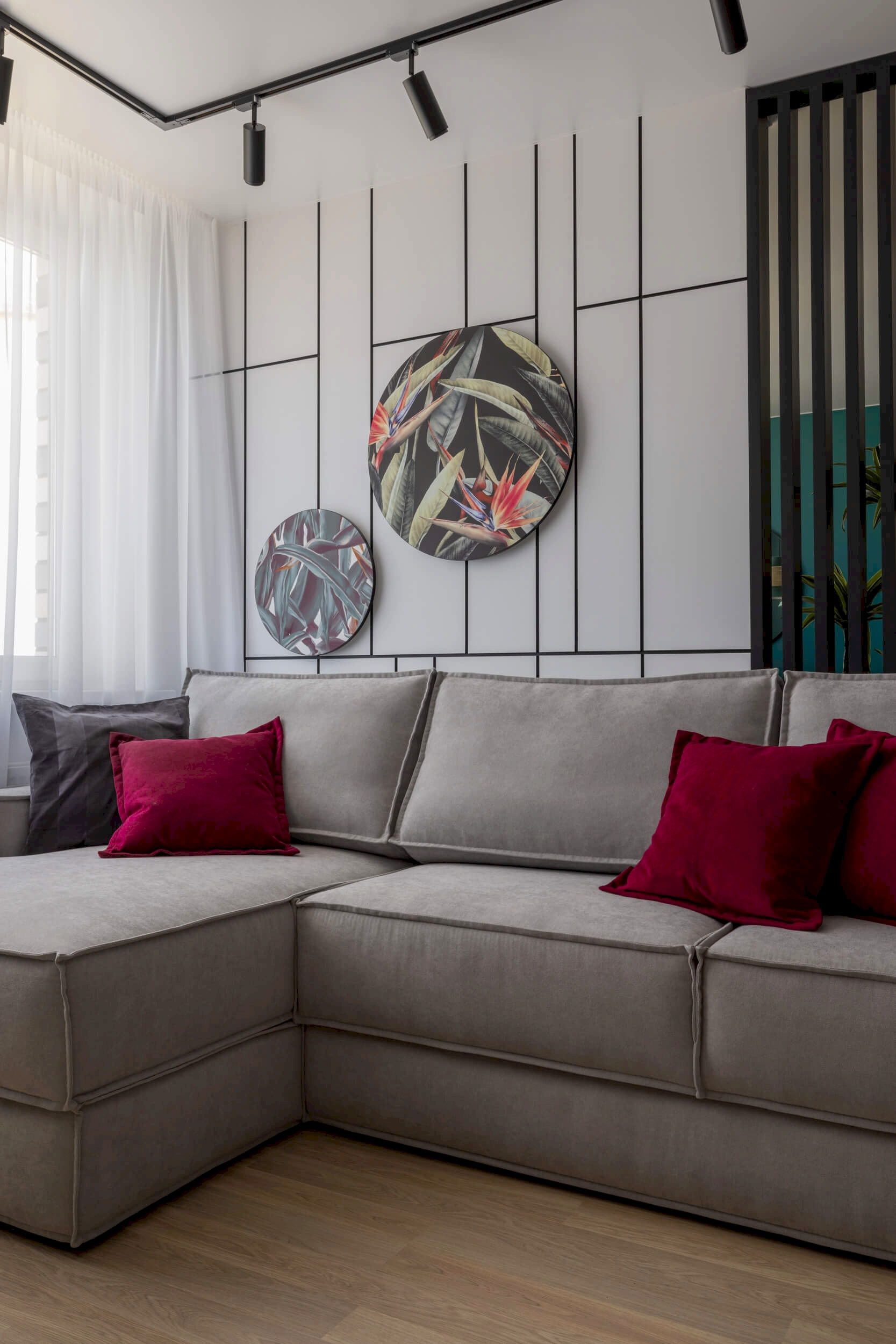 Для того, Pin-Up кухня смотрелась легче и современней мы отказались от верхних навесных шкафов, есть группа пеналов и многофункциональный остров. Кухню от гостиной отделяет реечная перегородка черного цвета. Оживляет интерьер большое количество зелени.
