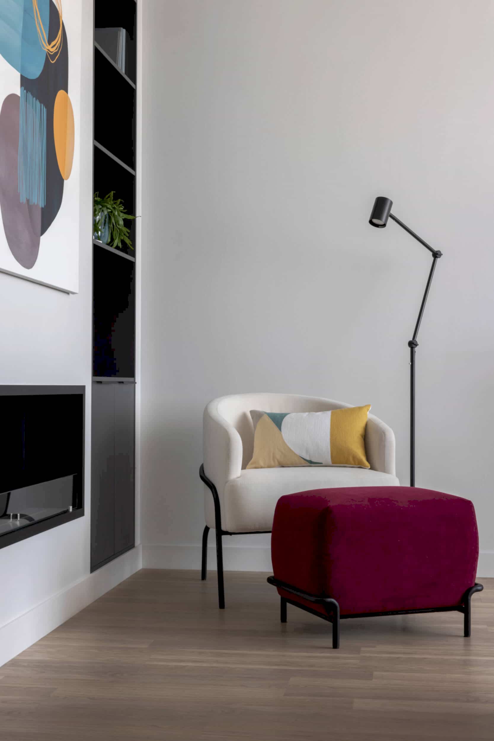 В каминной зоне с библиотекой мы предусмотрели кресло, в котором комфортно читать. Центральную часть над камином Pin-Up картина художницы Анны Кукоты.